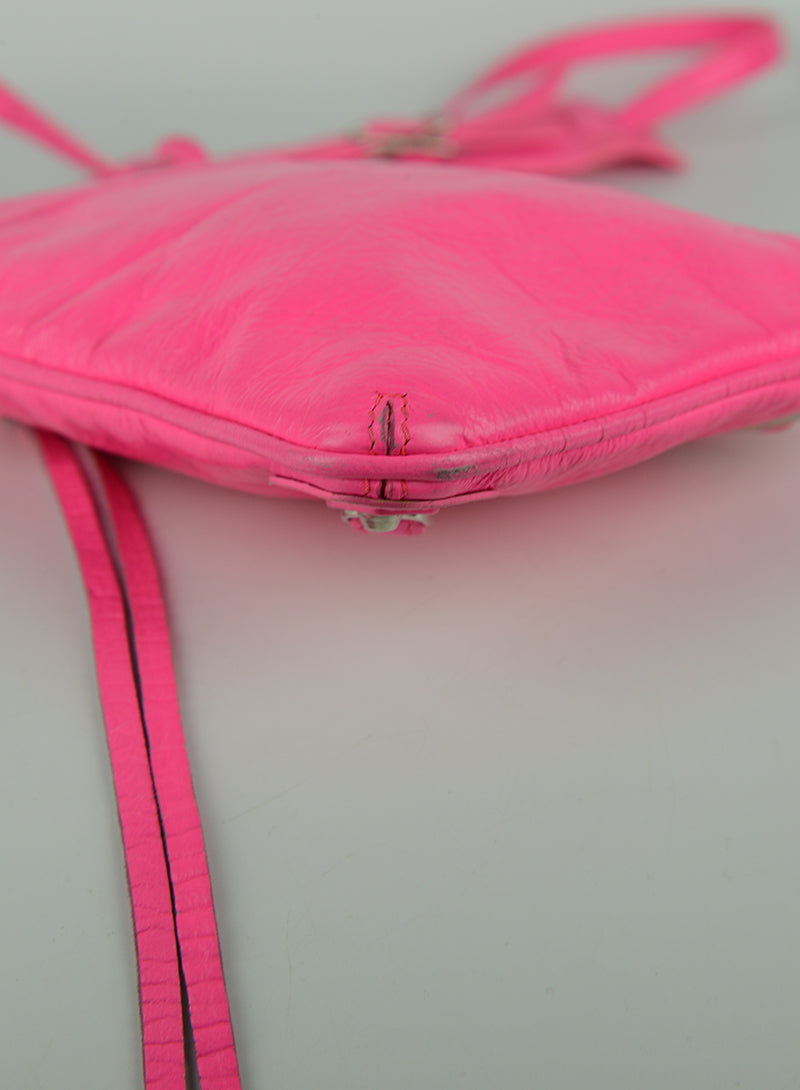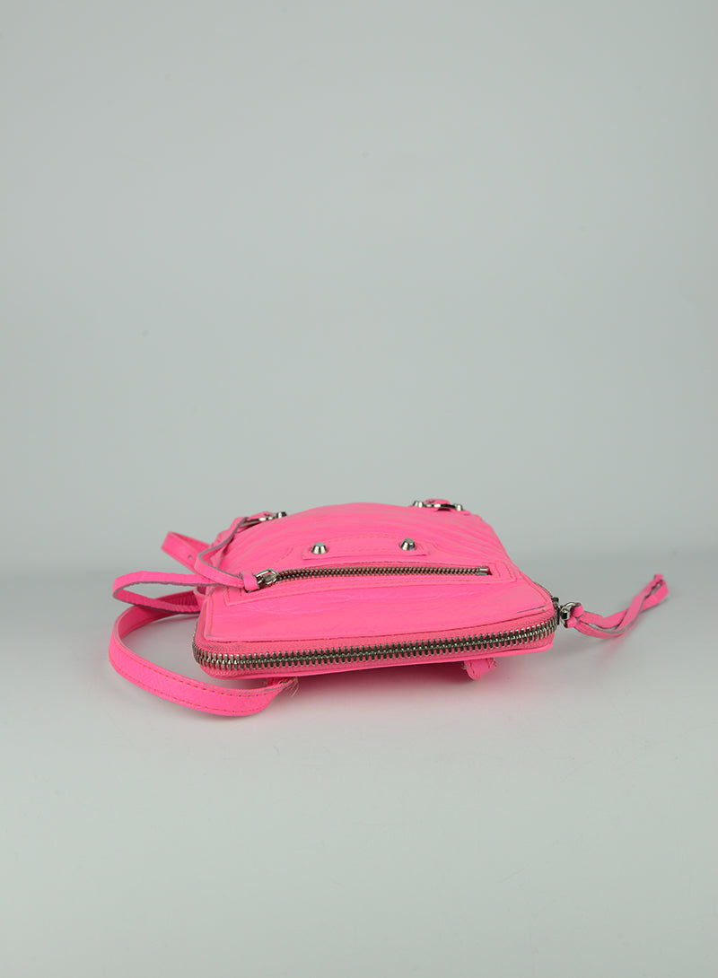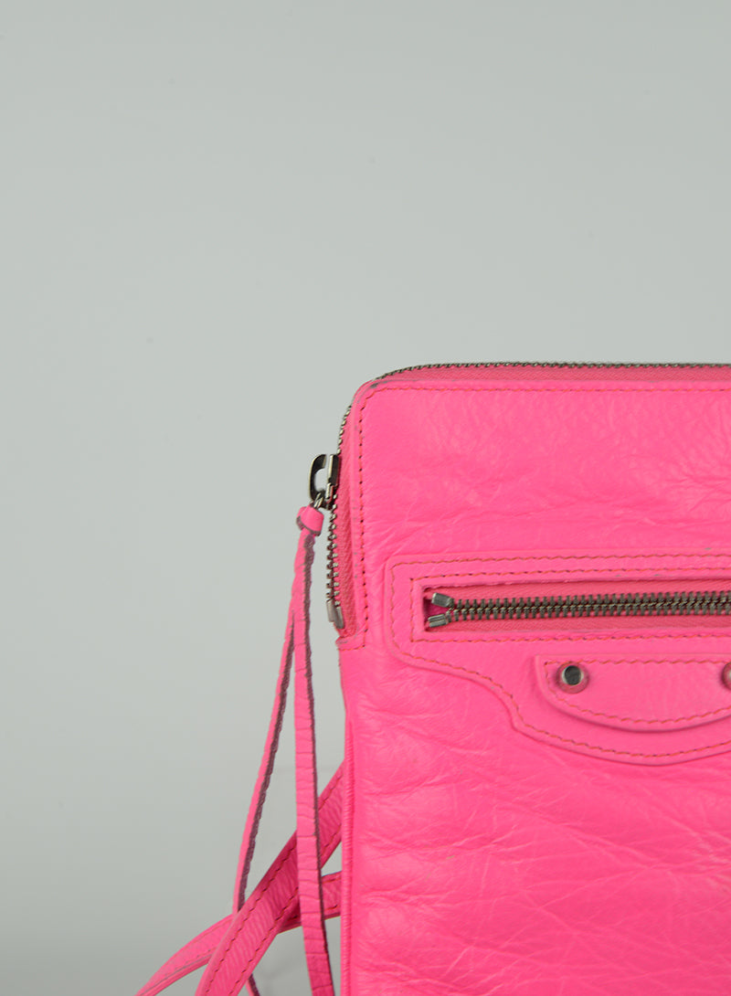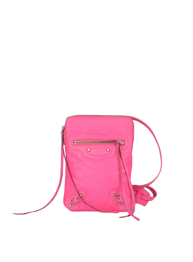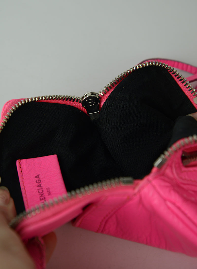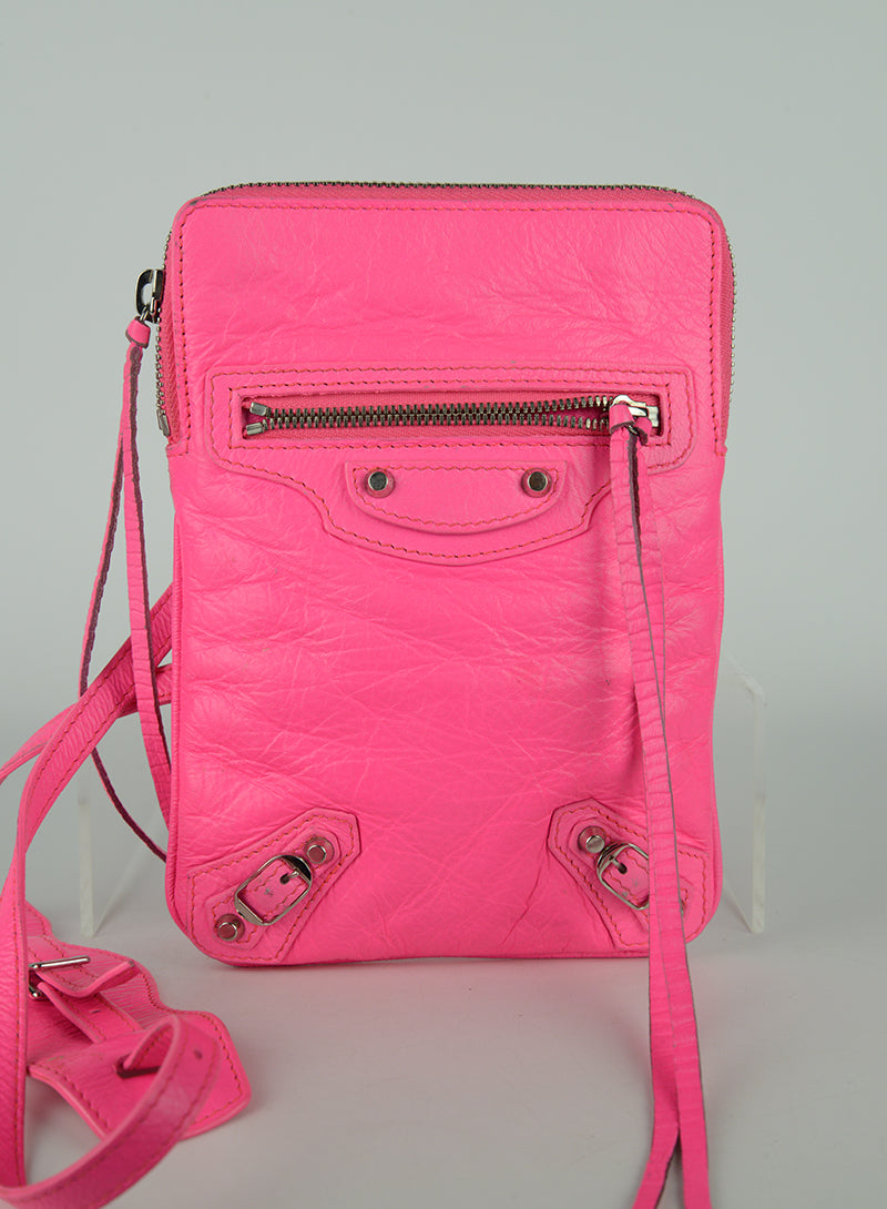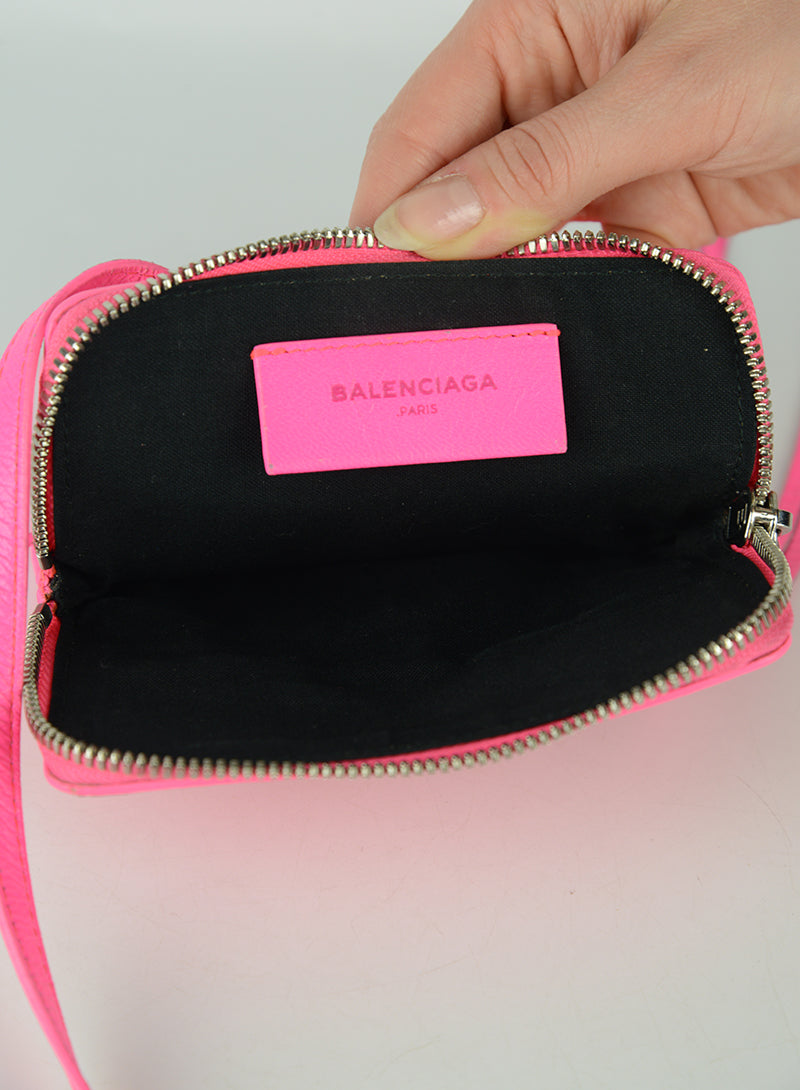 In pelle rosa fucsia, la Borsina Balenciaga è perfetta per il tuo cellulare. Dotata di tracolla e hardware argento, la taschina con zip sul davanti e l'interno foderato in cotone nero la rendono elegante e funzionale. Aggiungi un tocco di moda e praticità al tuo look con questa borsina esclusiva.