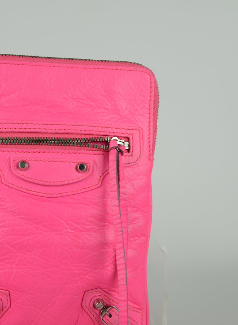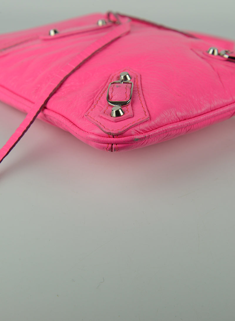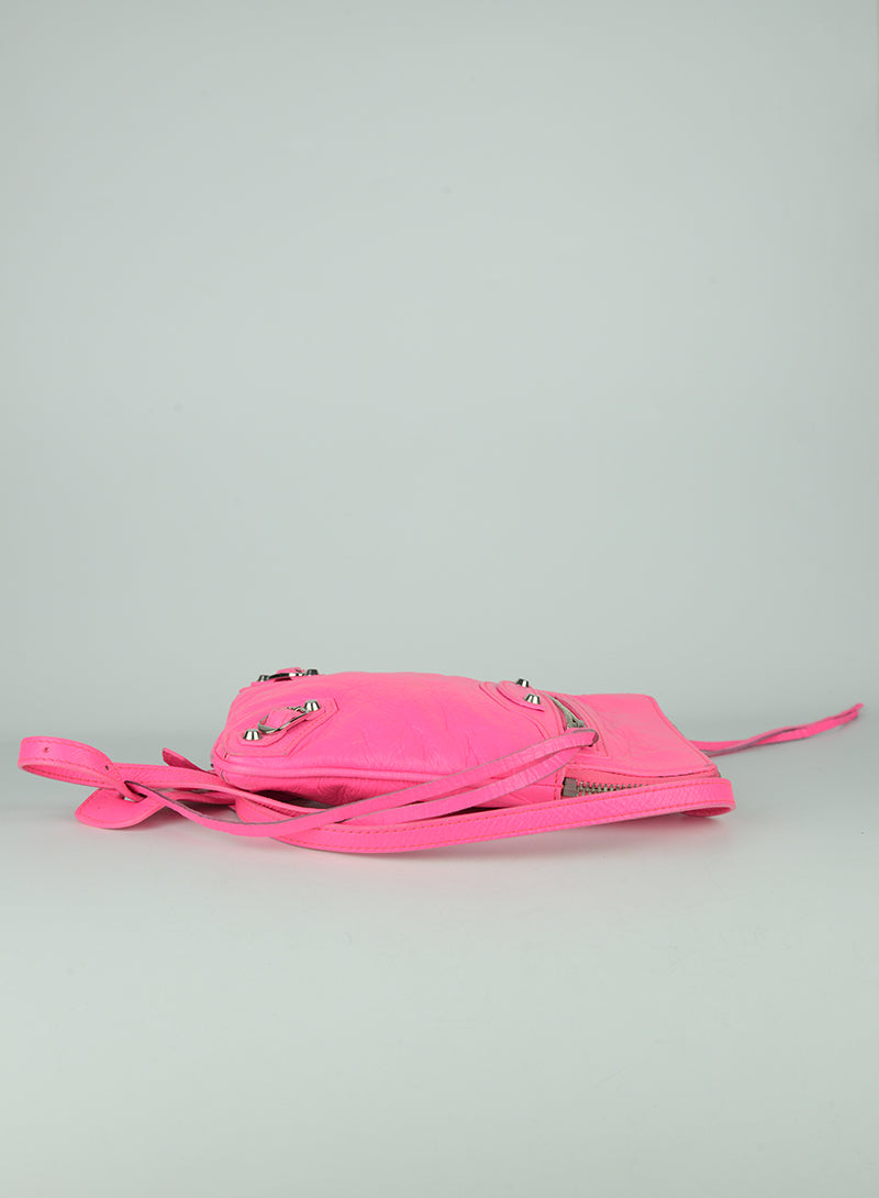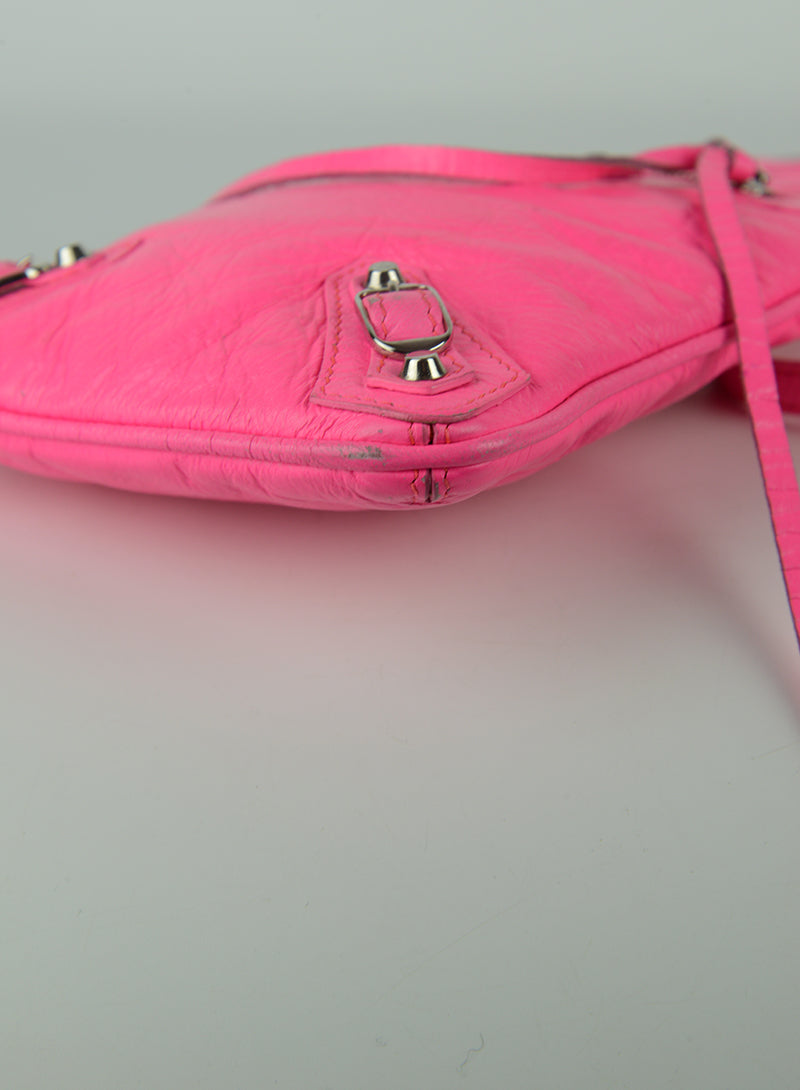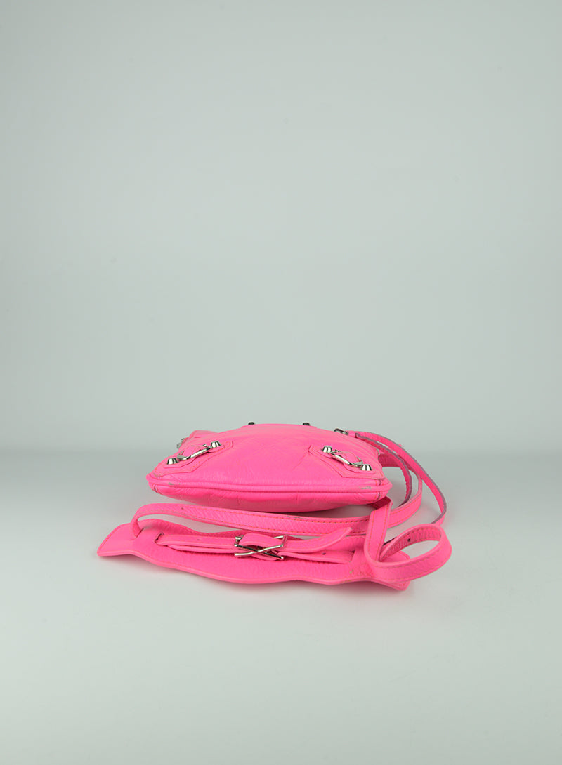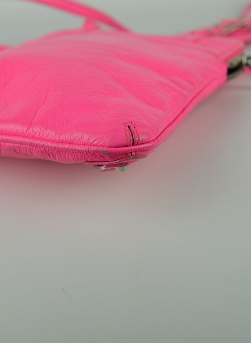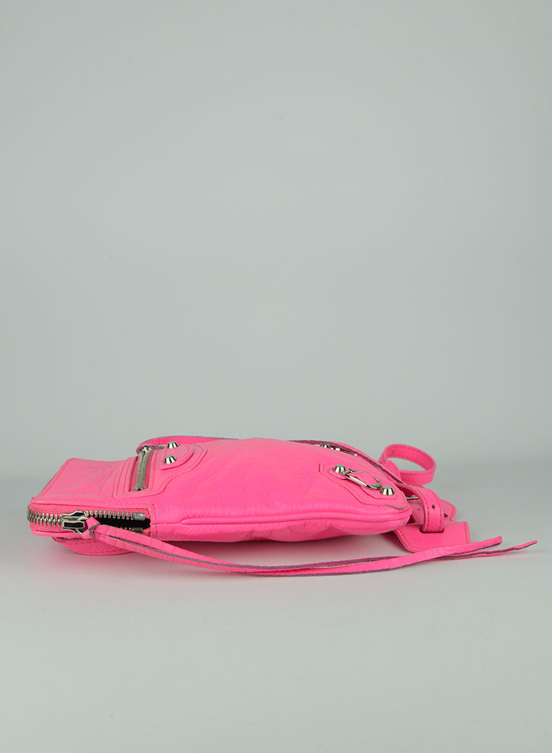 In pelle rosa fucsia, la Borsina Balenciaga è perfetta per il tuo cellulare. Dotata di tracolla e hardware argento, la taschina con zip sul davanti e l'interno foderato in cotone nero la rendono elegante e funzionale. Aggiungi un tocco di moda e praticità al tuo look con questa borsina esclusiva.
