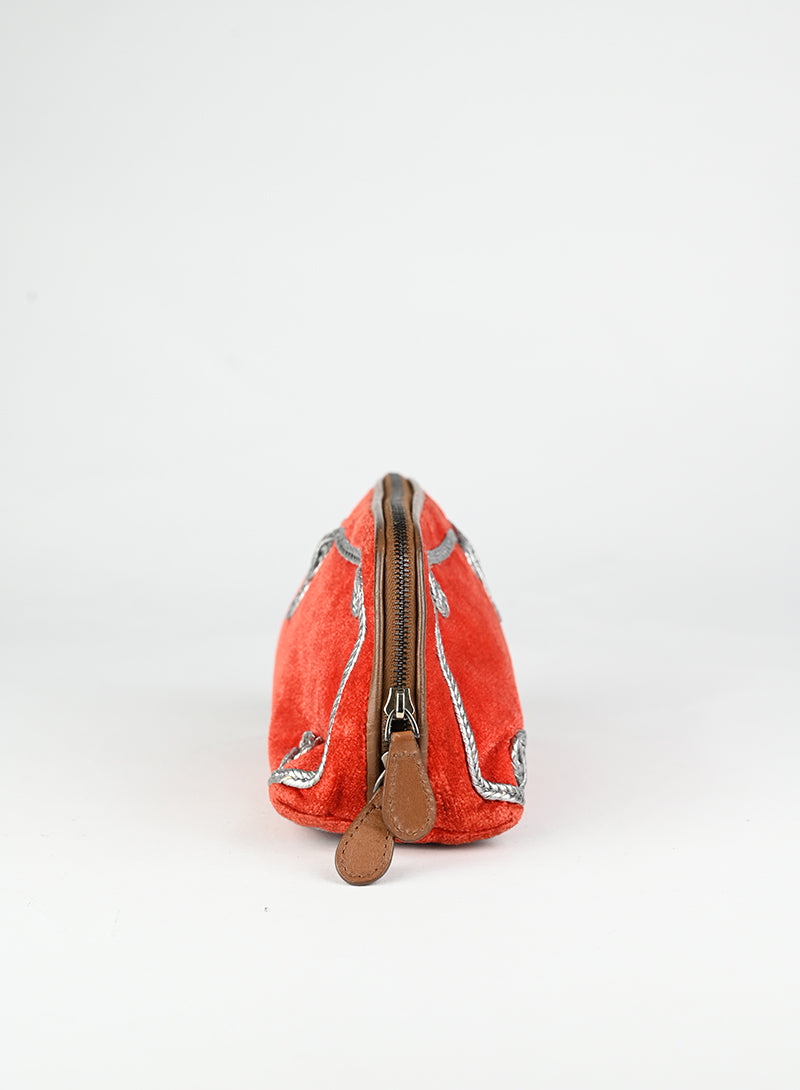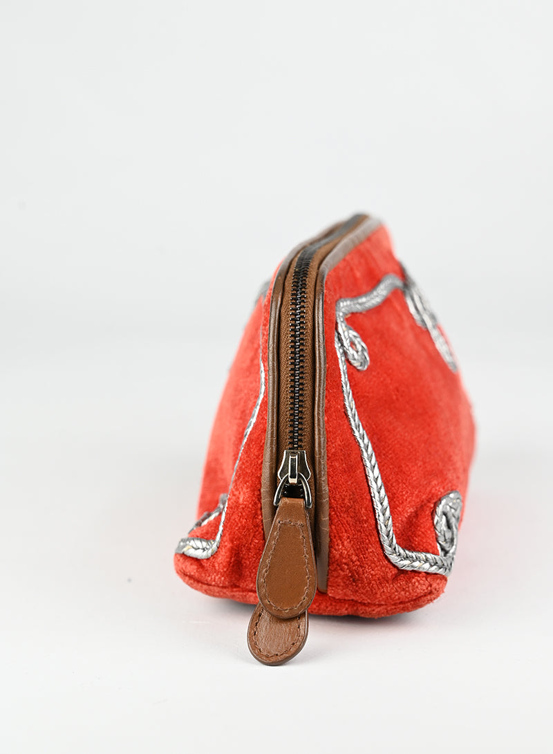 Beauty case Bottega Veneta in velluto rosso aragosta, impreziosito da inserti in pelle intrecciata color argento e profili in pelle marrone. Dotato di chiusura zip e un interno con scompartimento foderato, rappresenta l'essenza della raffinatezza e dell'artigianalità della maison. Un accessorio senza tempo che incarna il lusso discreto e la qualità costruttiva inconfondibile del brand.