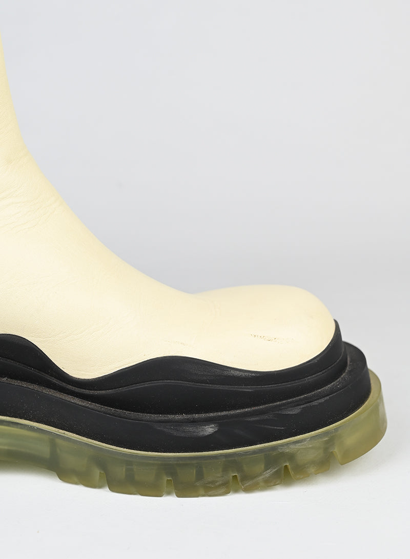 Stivaletti Tire Bottega Veneta in pelle panna con para alta trasparente e suola in gomma ondulata nera. Caratterizzati da elastico nero laterale per una vestibilità comoda e sicura. Dettagli raffinati e costruzione di qualità tipica della maison. Un pezzo di lusso vintage perfetto per chi apprezza l'eleganza senza tempo e i materiali nobili.