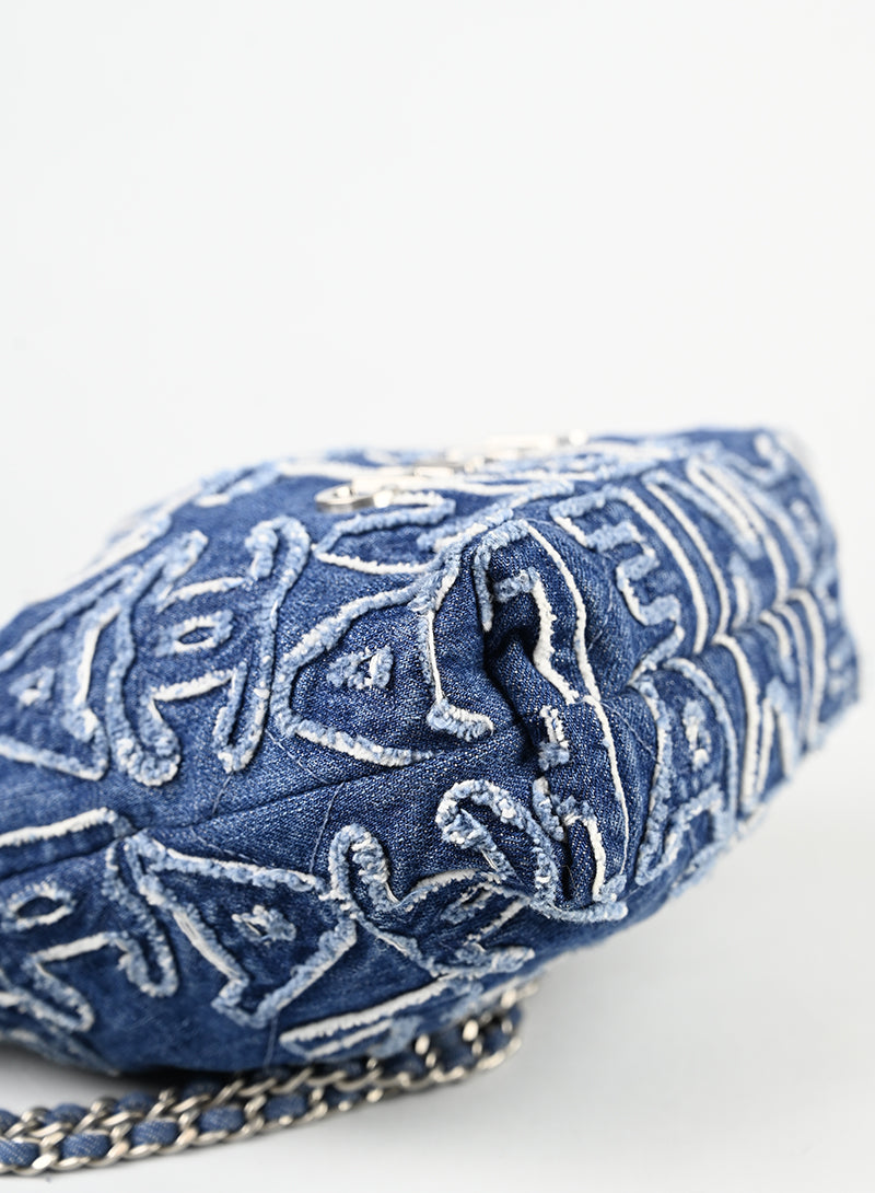 Borsa Chanel 22 in denim blu, un capolavoro di eleganza casual-chic. Realizzata in pregiato denim, presenta applicazioni con lettere logo e il celebre logo Chanel in metallo argentato. I manici a catenella garantiscono praticità e stile, completati da un charm esclusivo. L'interno è rivestito in metallessè e organizzato con uno scompartimento principale e una pratica taschina porta carte. Un pezzo iconico perfetto per chi ricerca autenticità e raffinatezza nel vintage di lusso.
