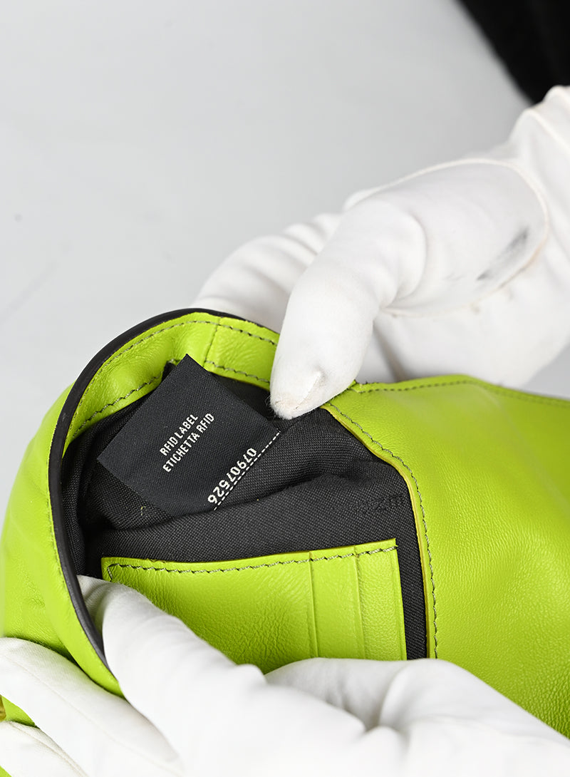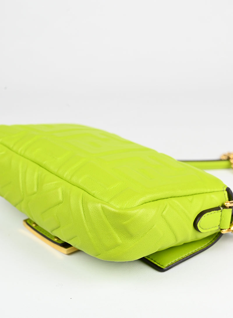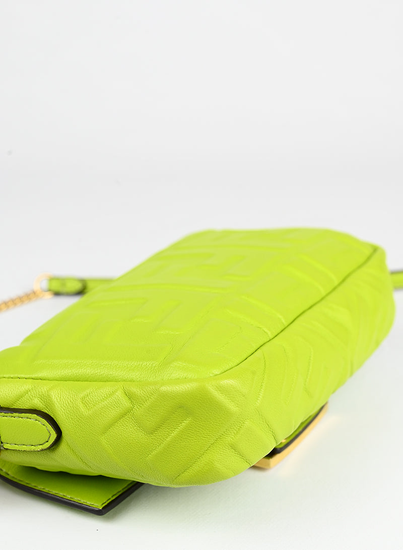 Aggiungi un tocco di eleganza al tuo look con la Fendi Borsa Baguette in pelle verde. La tracolla verde pistacchio con l'iconico logo FF impresso e la fibbia dorata FF ti porteranno nel mondo della moda di lusso. La catena dorata rimovibile e il manichetto in pelle offrono versatilità, mentre l'interno in tessuto nero e la tasca portacarte ti mantengono organizzata in grande stile.