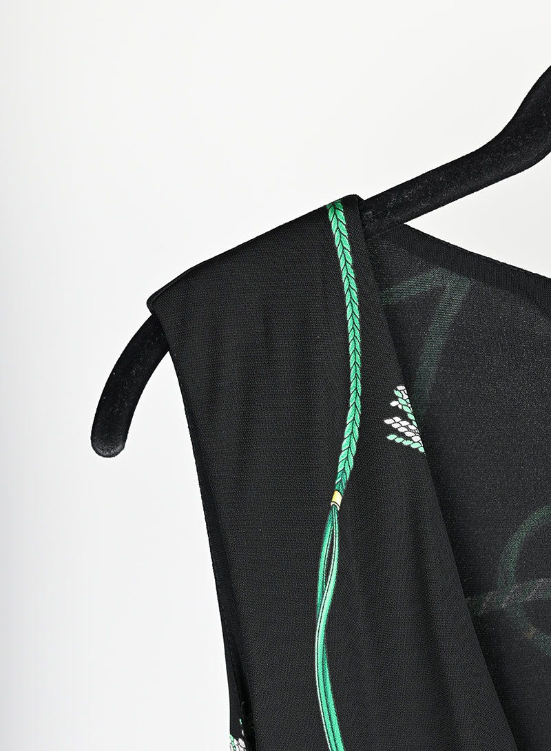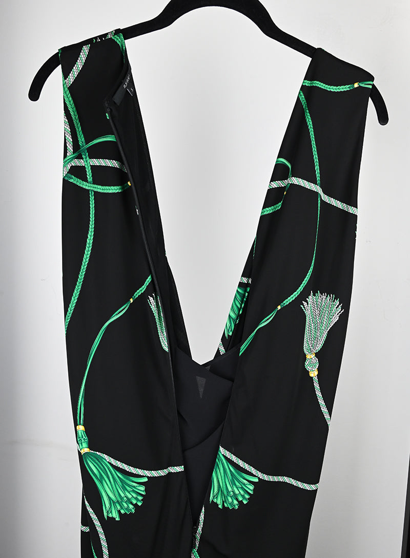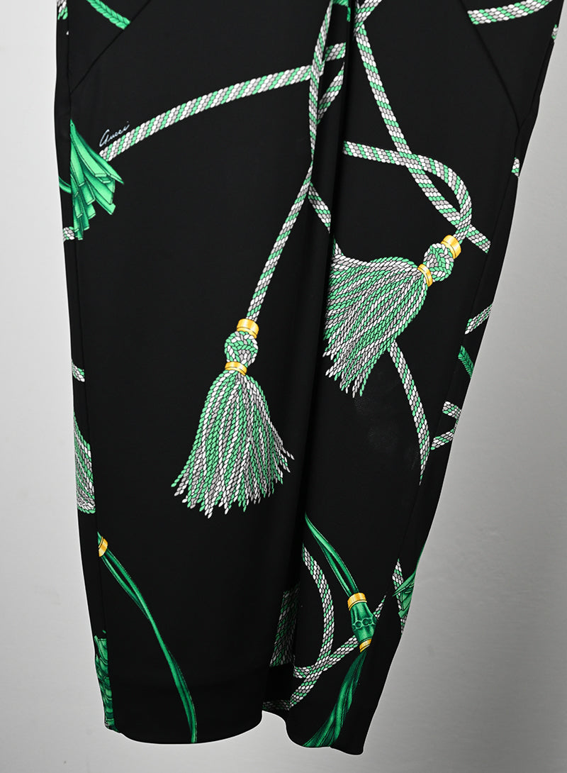 Un'opera d'arte di alta moda, l'abito Gucci nero è decorato con fantasie di nappe verdi. La scollatura profonda e il nodo centrale enfatizzano la silhouette, mentre la chiusura a zip e la sottoveste garantiscono un comfort senza pari.