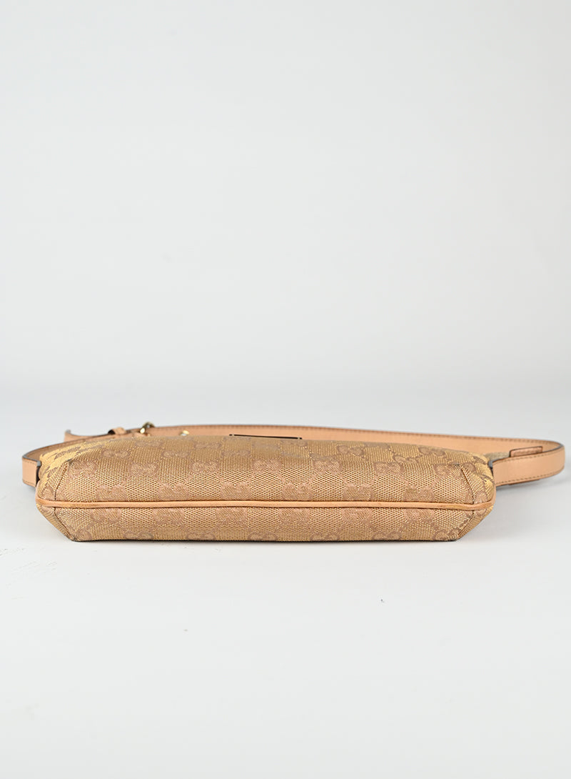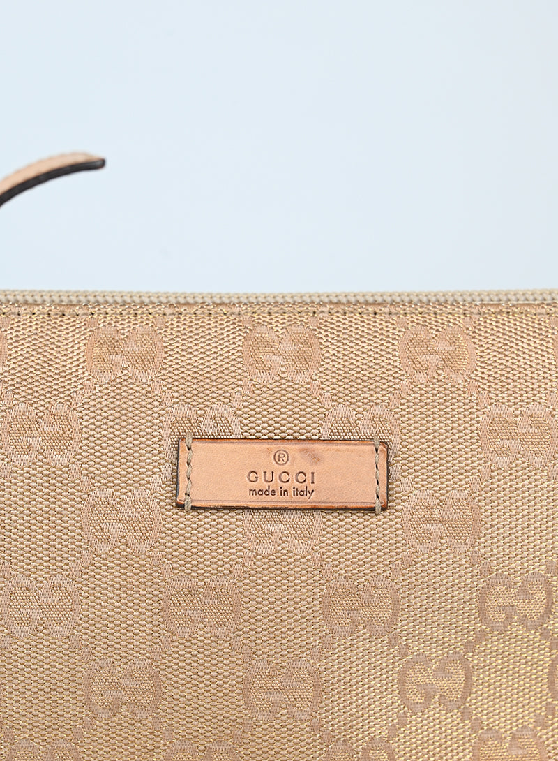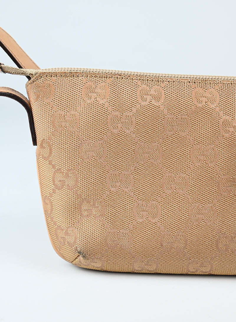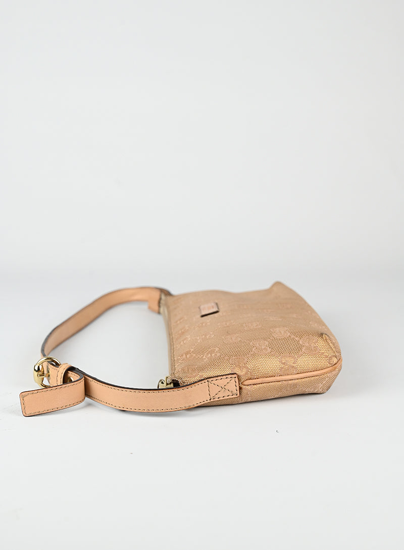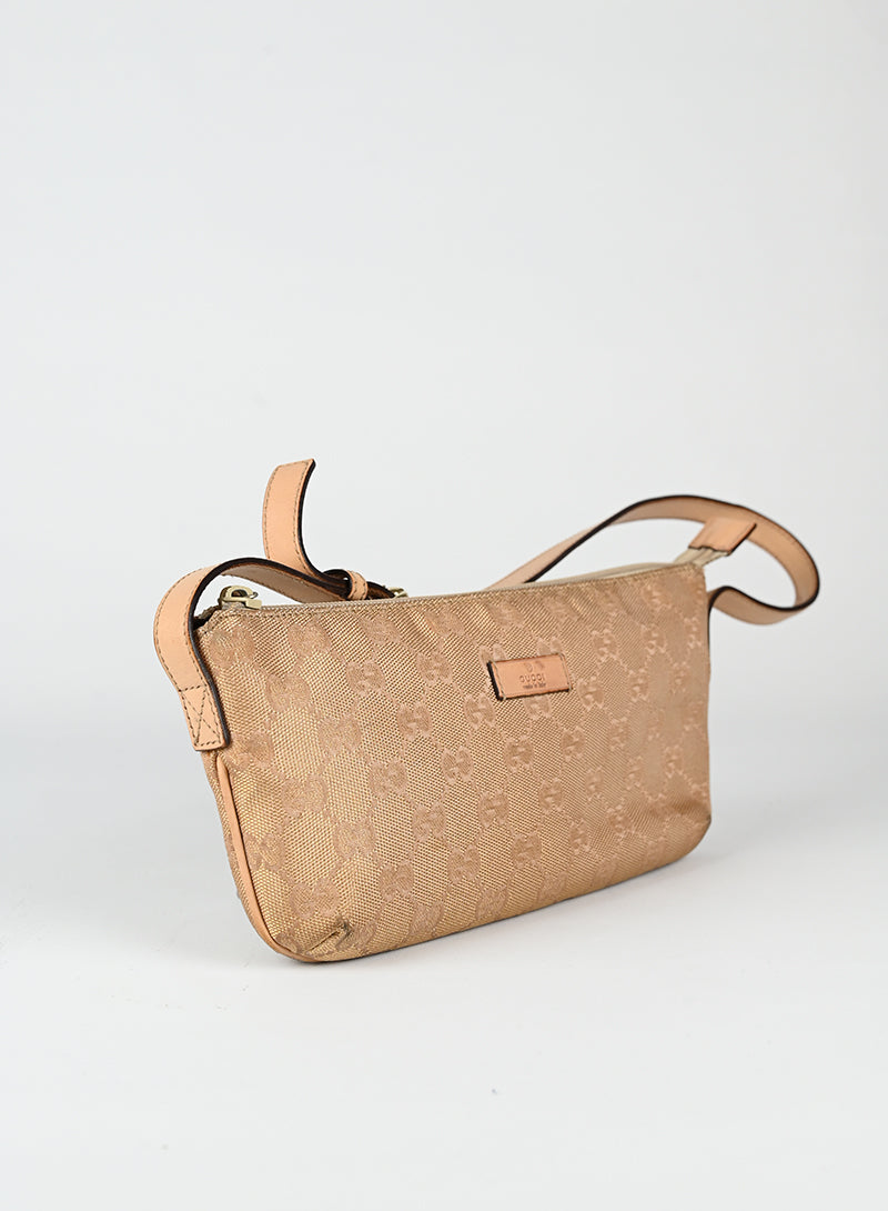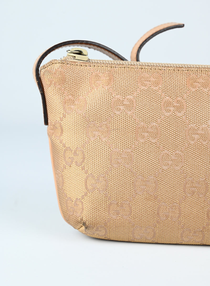 La borsina a spalla Gucci in tessuto color cipria con lurex oro è un accessorio elegante e sofisticato. Presenta un manico in pelle cipria che aggiunge un tocco delicato e raffinato. La chiusura con zip garantisce sicurezza, mentre l'interno è dotato di uno scompartimento con fodera marrone per una comoda organizzazione. L'hardware champagne completa il design, conferendo un tocco di lusso discreto e moderno.