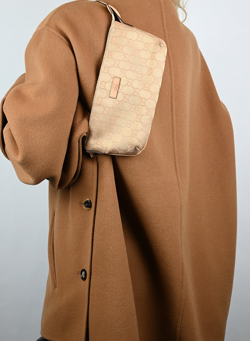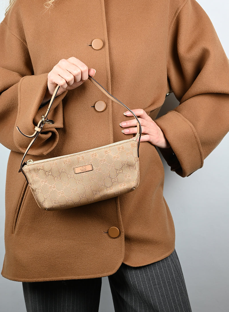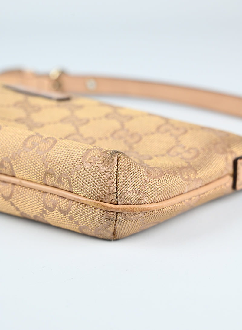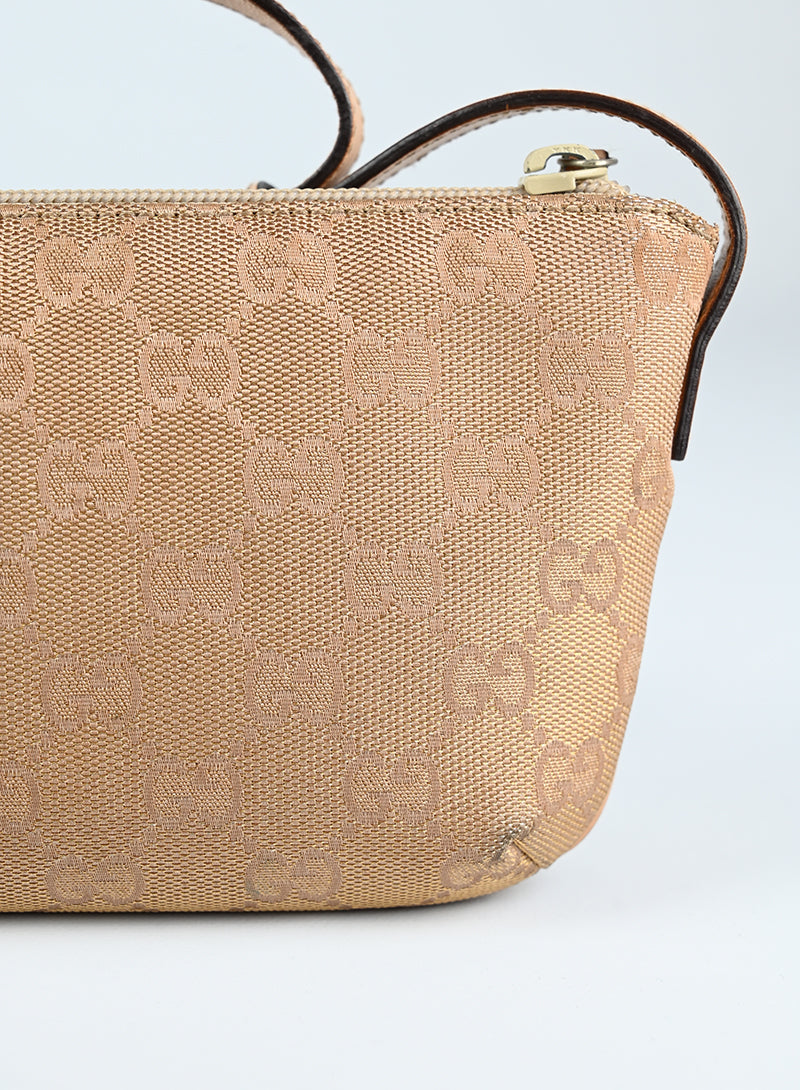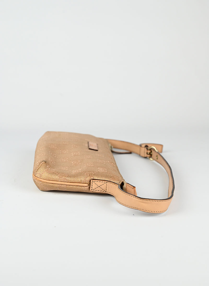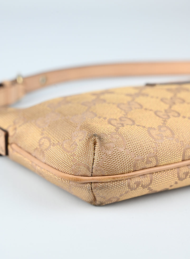 La borsina a spalla Gucci in tessuto color cipria con lurex oro è un accessorio elegante e sofisticato. Presenta un manico in pelle cipria che aggiunge un tocco delicato e raffinato. La chiusura con zip garantisce sicurezza, mentre l'interno è dotato di uno scompartimento con fodera marrone per una comoda organizzazione. L'hardware champagne completa il design, conferendo un tocco di lusso discreto e moderno.