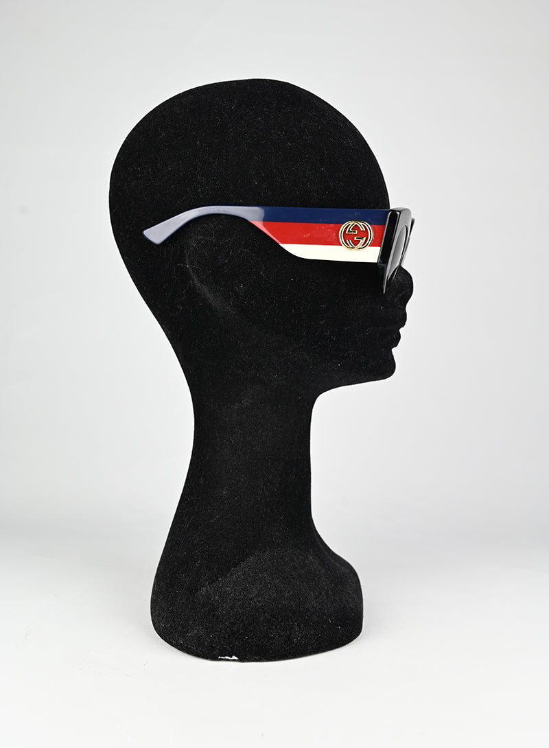 Occhiali da sole Gucci con montatura oversize in nero, caratterizzati da lenti scure che garantiscono protezione totale. Le aste presentano il celebre dettaglio tricolor in panna, rosso e blu, simbolo iconico della maison. Il logo GG dorato in rilievo sulla montatura conferisce un tocco di lusso inconfondibile. Un accessorio sofisticato che unisce stile vintage e eleganza contemporanea, perfetto per chi ricerca pezzi di alta moda con carattere distintivo.