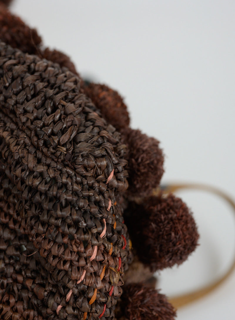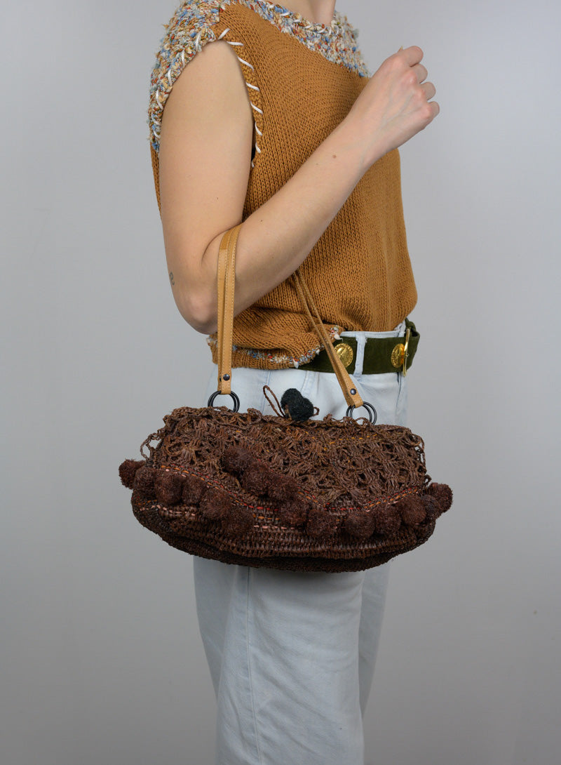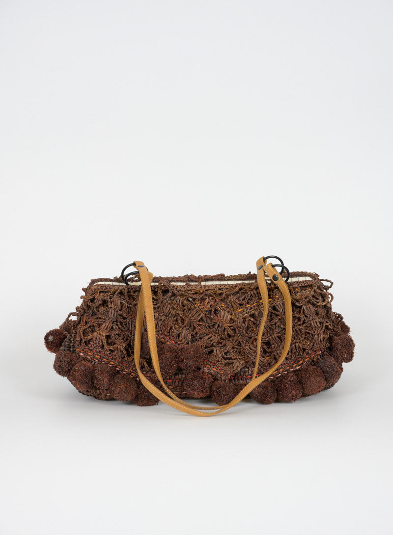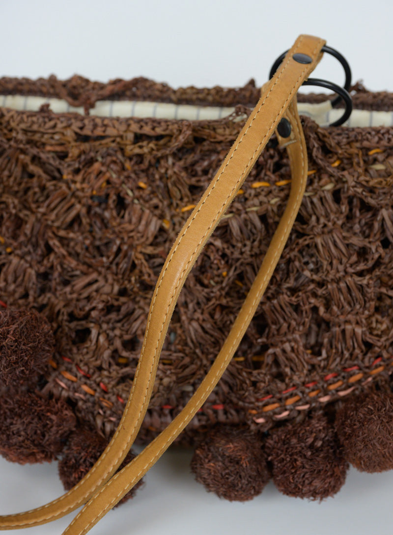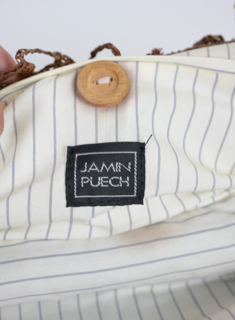 Discover this precious bag by Jamin Puech. Made of hand-woven brown straw, detailed with two beige leather handles and lace closure with brown pom poms. Its interior, finished with a white and gray striped lining, is divided into a comfortable compartment to best contain all your objects. An elegant bag to show off in style.
