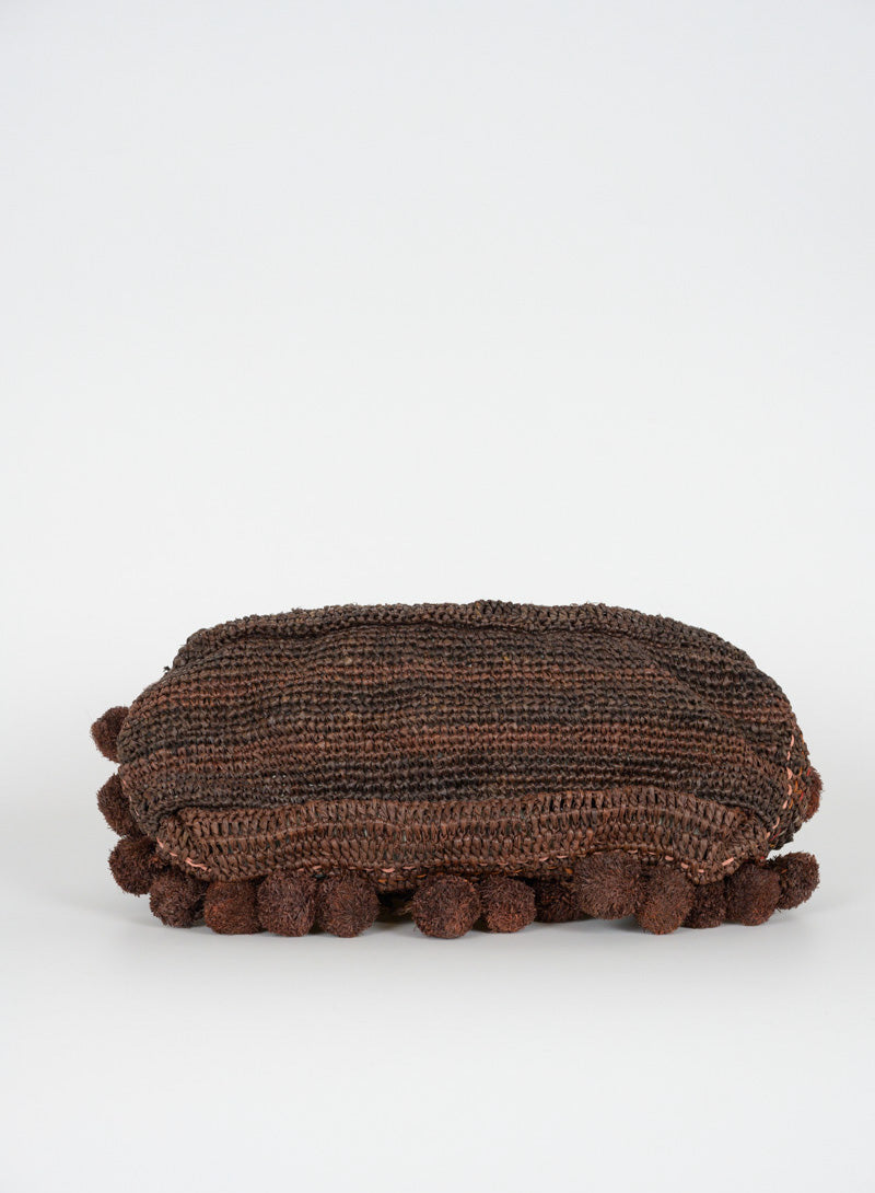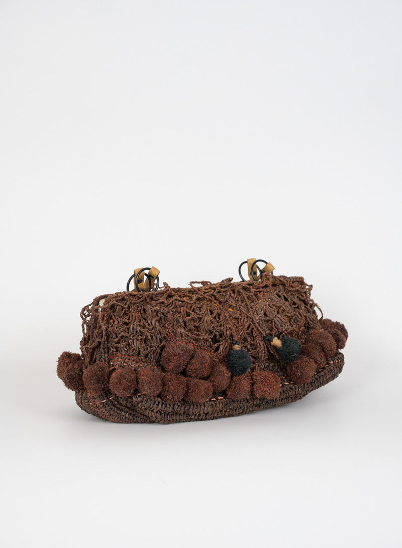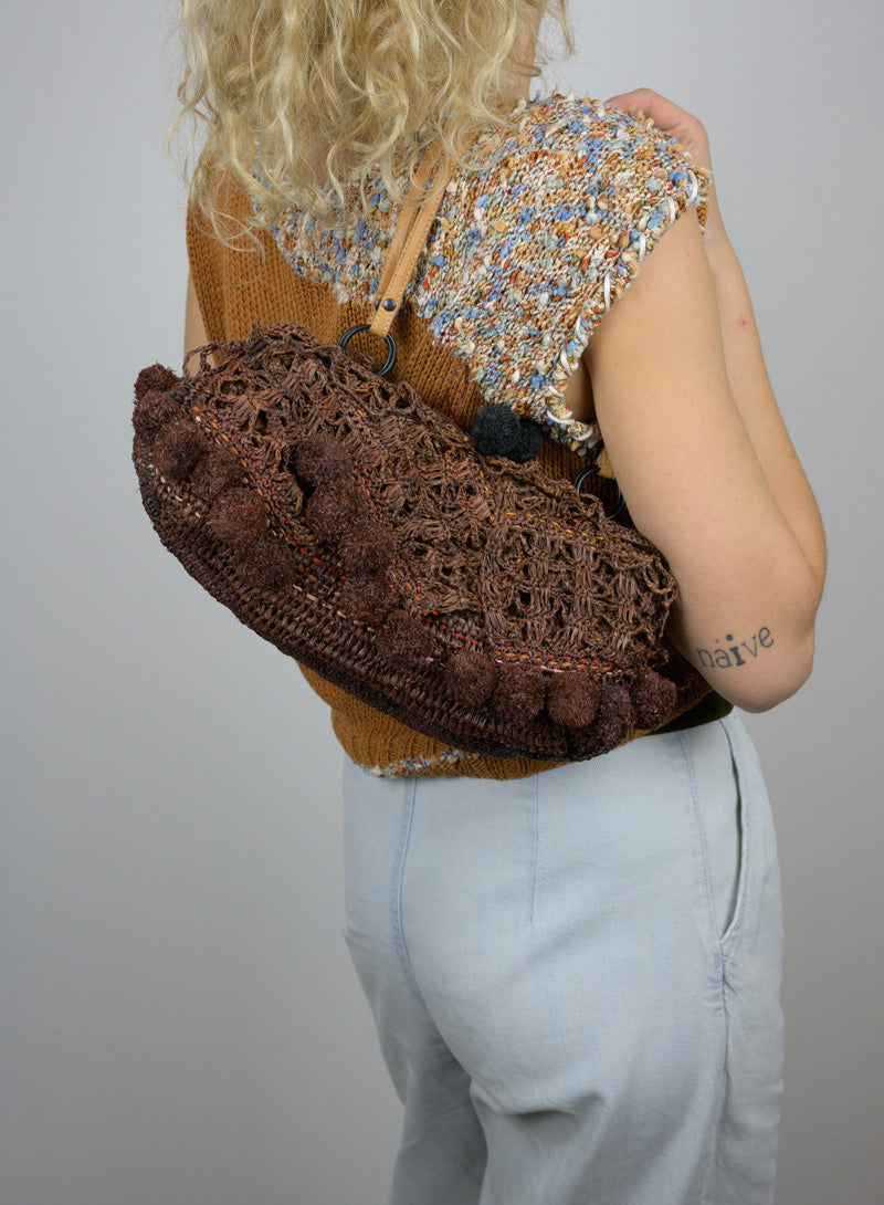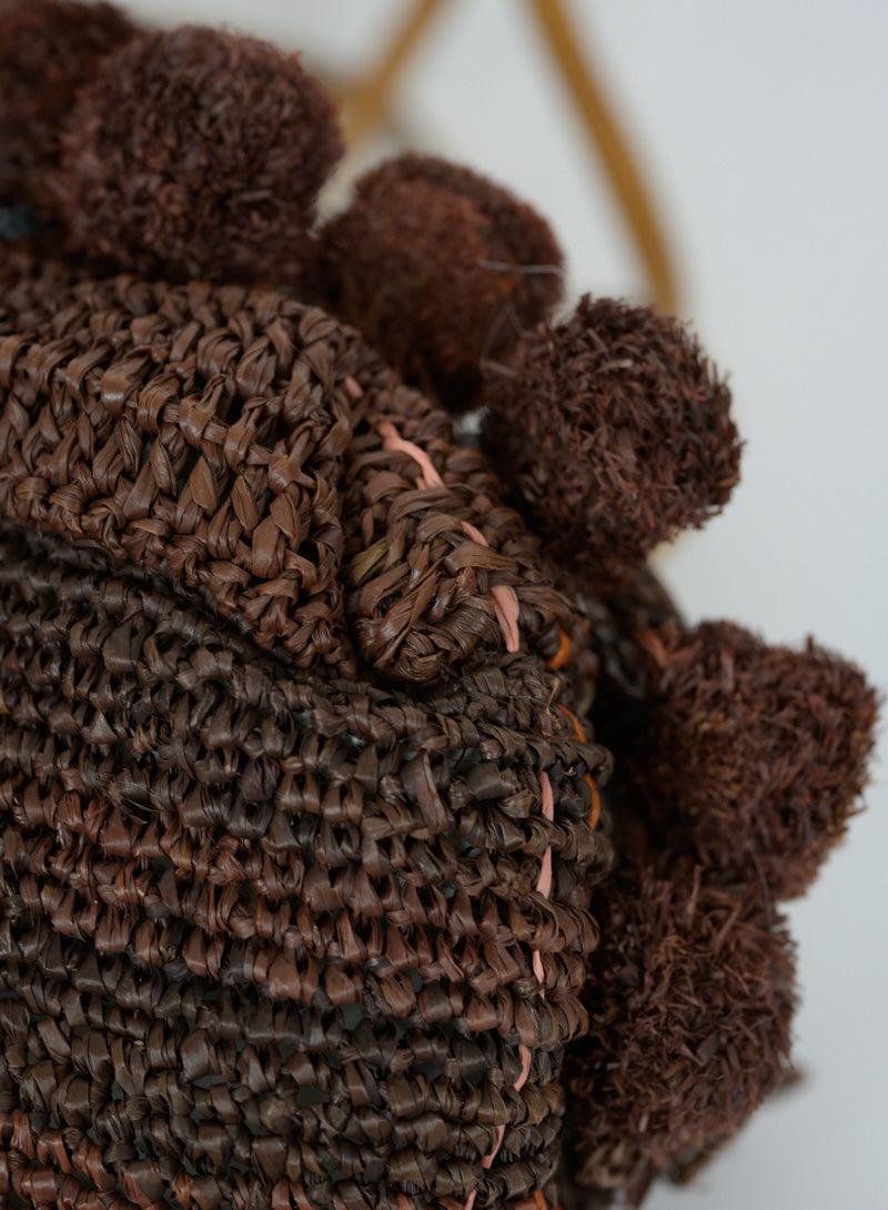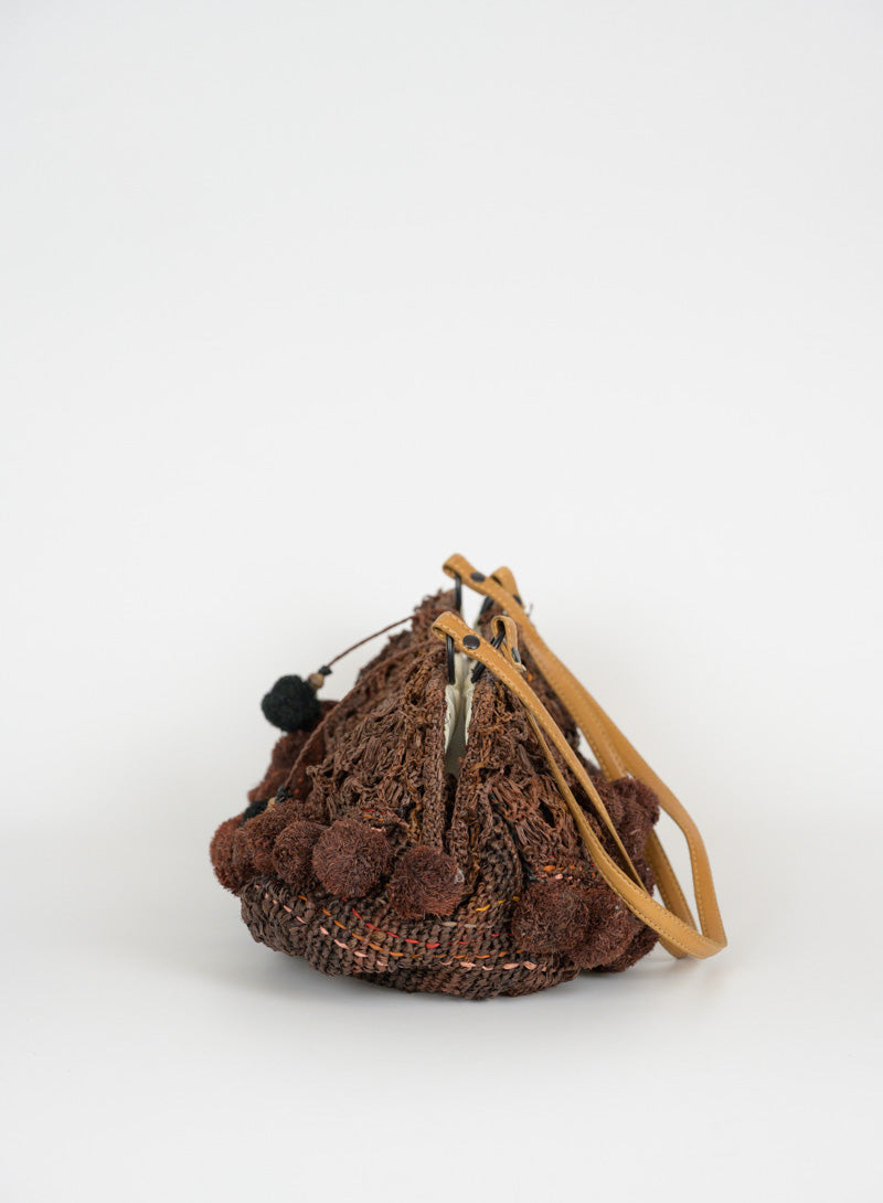 Discover this precious bag by Jamin Puech. Made of hand-woven brown straw, detailed with two beige leather handles and lace closure with brown pom poms. Its interior, finished with a white and gray striped lining, is divided into a comfortable compartment to best contain all your objects. An elegant bag to show off in style.