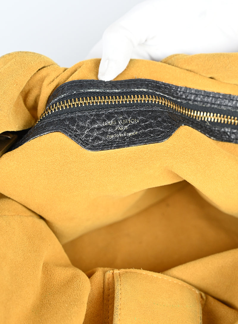 Borsa Louis Vuitton Mahina in denim grigio, un capolavoro di lusso vintage che unisce stile e funzionalità. Realizzata in pregiato denim grigio con doppi manici in pelle blu e hardware dorato, questa borsa presenta un gancio laterale per regolare la chiusura e un'esclusiva chiusura ad incastro firmata Vuitton. L'interno accogliente dispone di uno scompartimento in morbida suede ocra, una tasca con zip e un pratico scomparto portacellulare. Un accessorio sofisticato per chi apprezza l'autenticità e la qualità senza tempo.