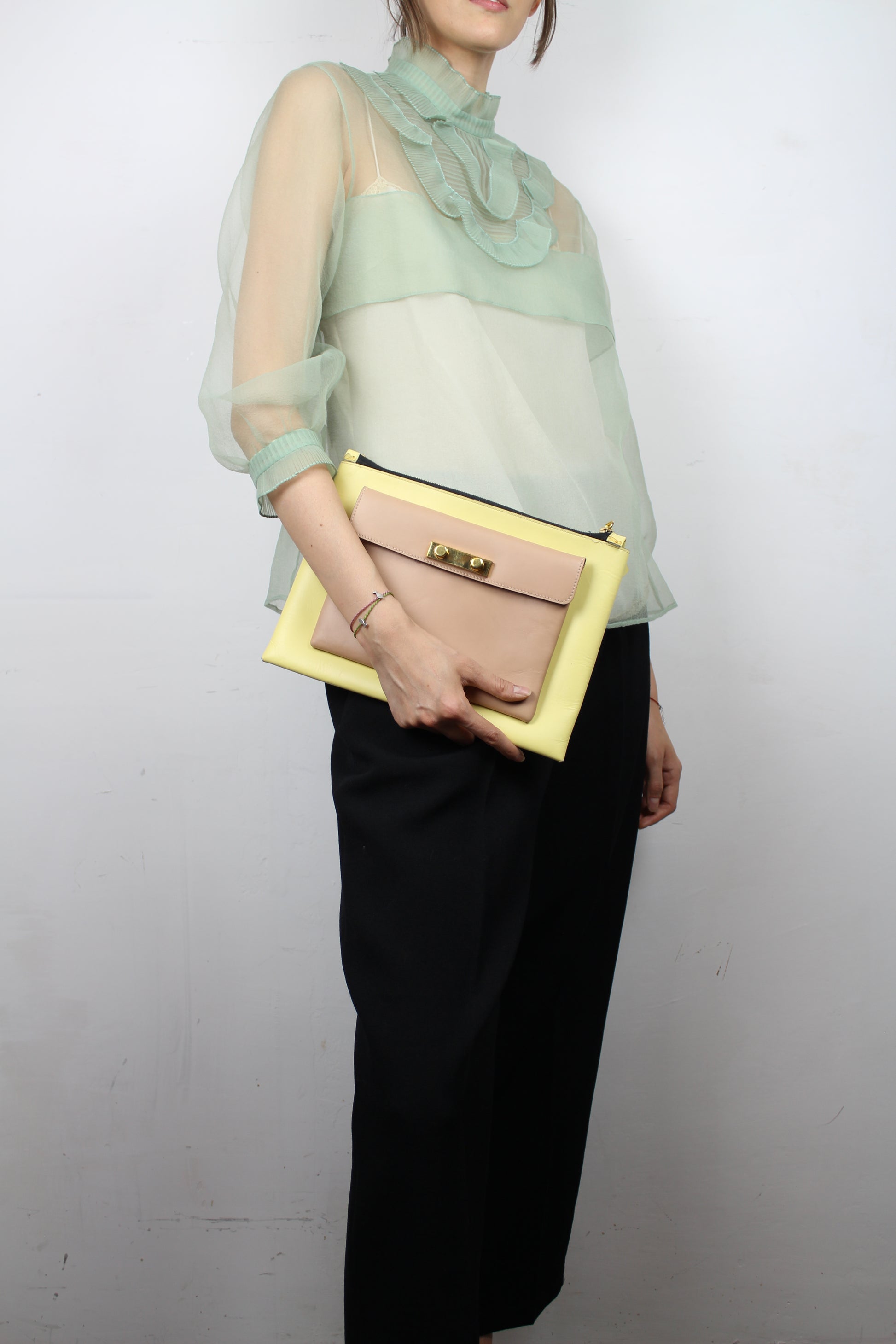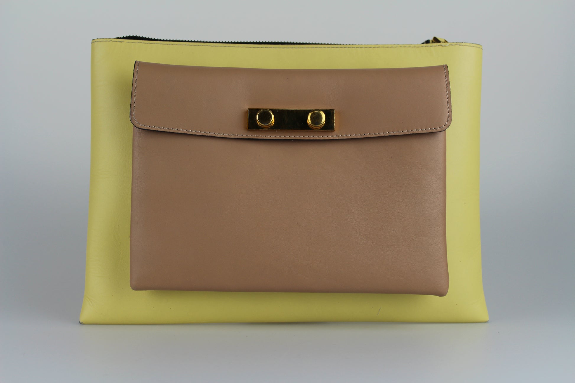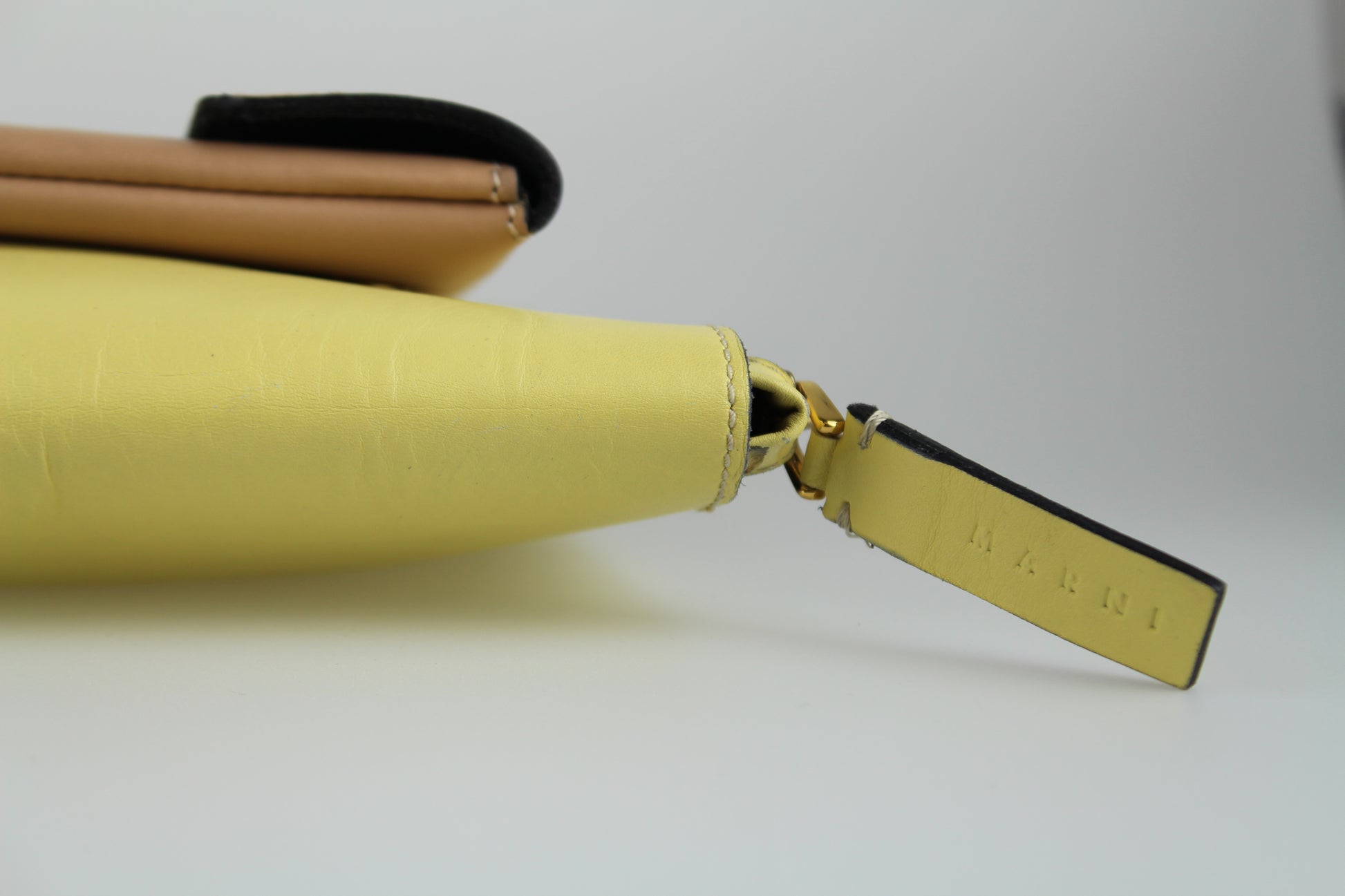 An elegant touch of luxury, this MARNI clutch bag in yellow and powder pink leather is ideal for a woman of style. The sophisticated powder-coloured removable external pocket, the gold snap closure and the practical top zip closure will satisfy your needs for portability and style. The black leather interior gives elegance and practicality, ensuring a perfect user experience.