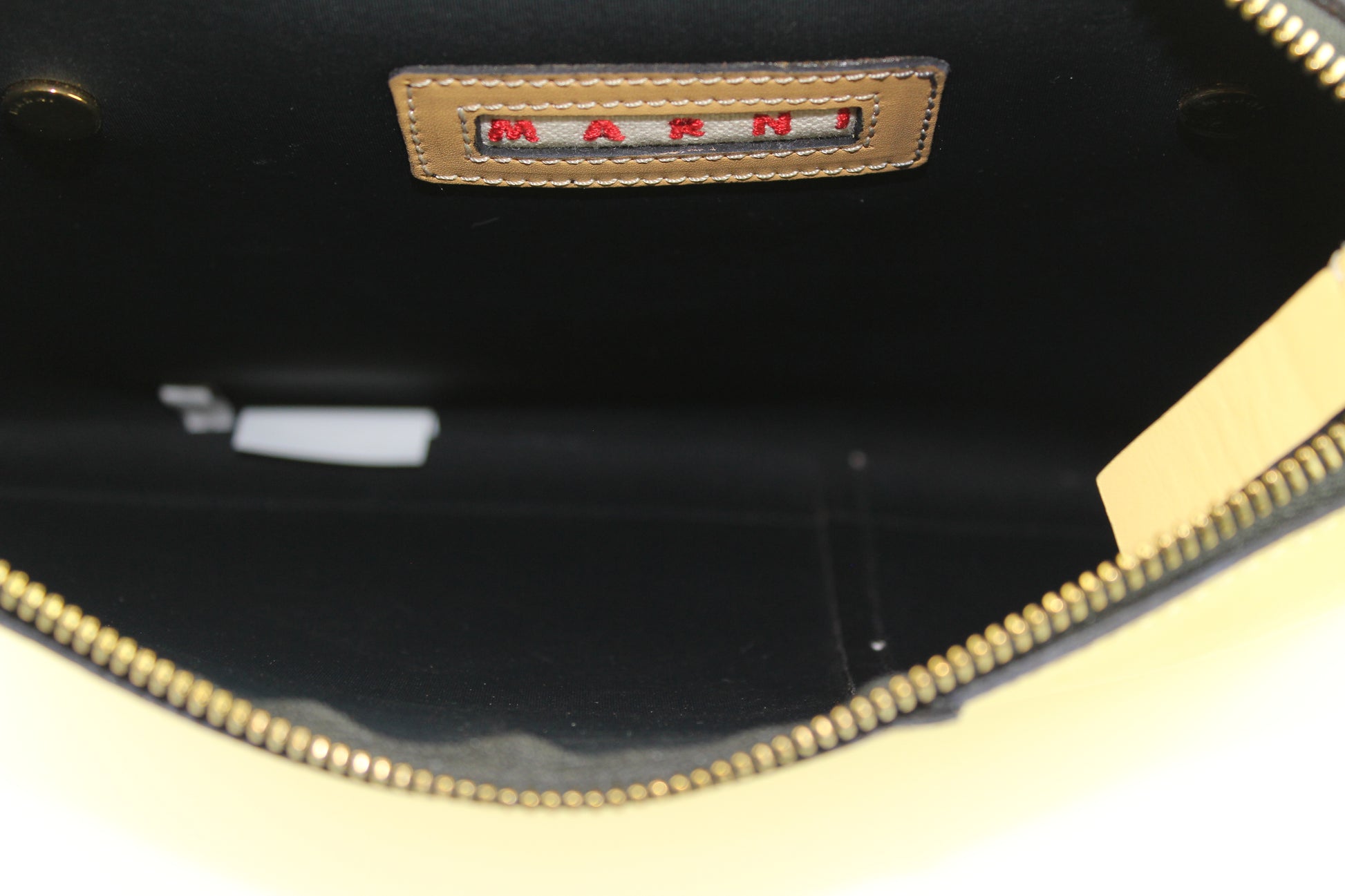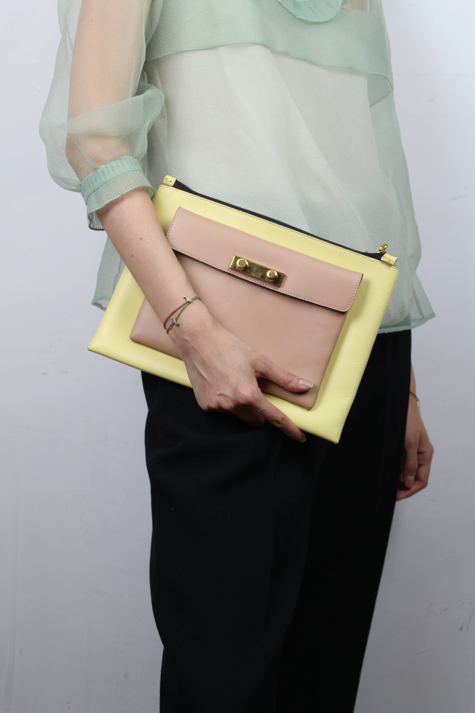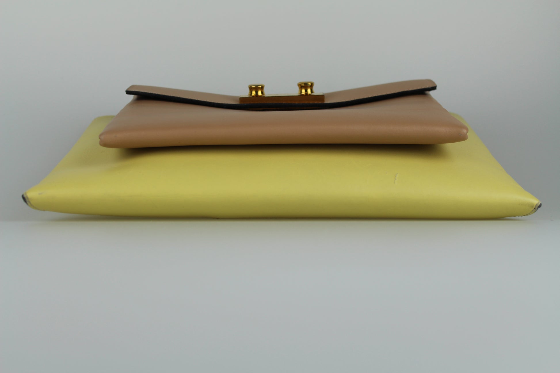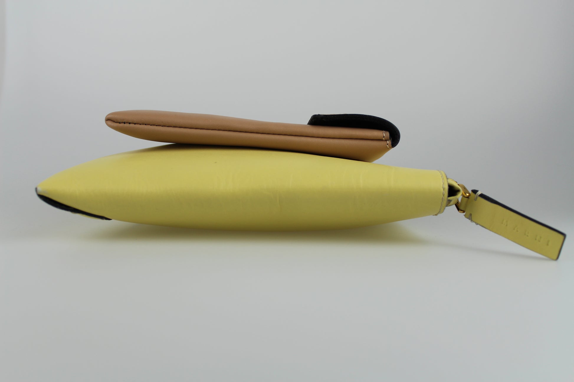 An elegant touch of luxury, this MARNI clutch bag in yellow and powder pink leather is ideal for a woman of style. The sophisticated powder-coloured removable external pocket, the gold snap closure and the practical top zip closure will satisfy your needs for portability and style. The black leather interior gives elegance and practicality, ensuring a perfect user experience.