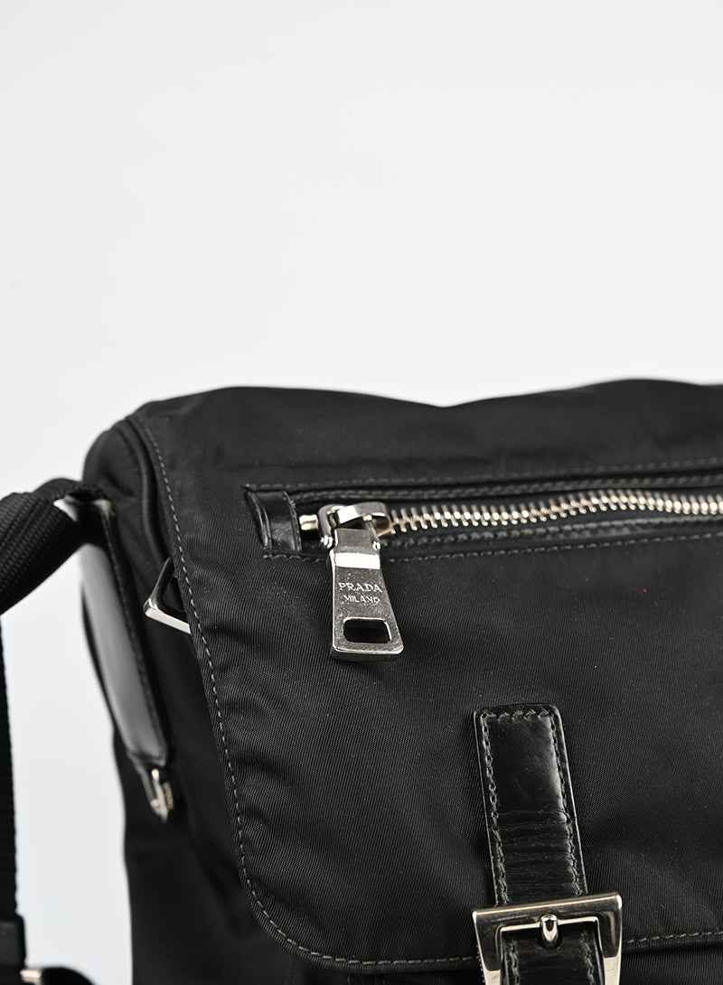 Borsa a tracolla Prada in re-nylon nero, un capolavoro di eleganza e funzionalità. La patta anteriore è dotata di chiusure in cinghie regolabili e zip, impreziosita da hardware in argento lucido. La tracolla in tessuto è completamente regolabile per un comfort personalizzato. All'interno, uno scompartimento principale completamente foderato con logo Prada e una pratica tasca con zip, mentre all'esterno una tasca zip aggiuntiva garantisce accesso rapido agli oggetti essenziali. Un investimento di lusso che unisce stile senza tempo e praticità quotidiana.