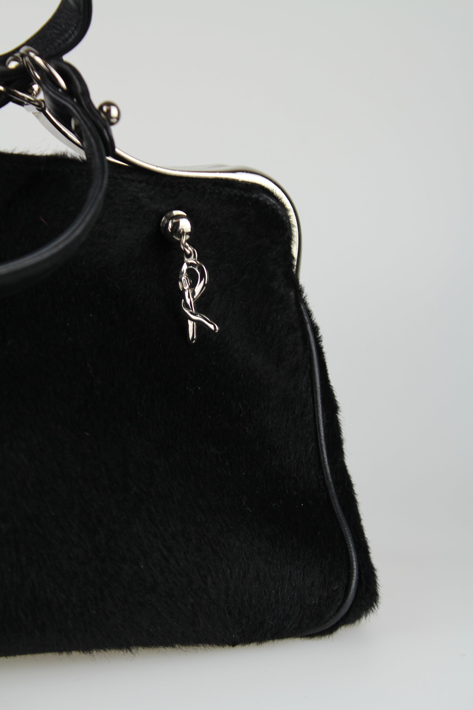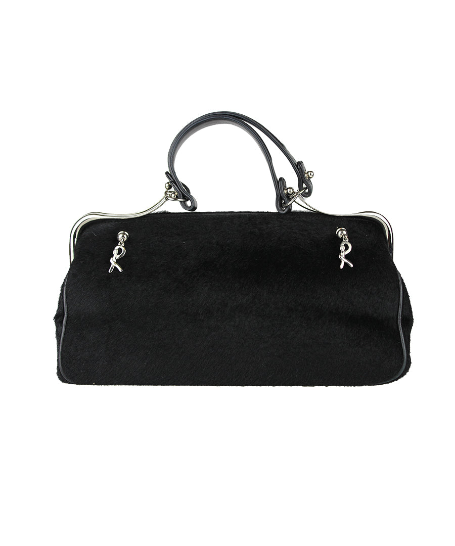 Designed to offer style and exclusivity, this bag is ideal for adding a touch of luxury to your look. Made of fine black pony skin, its refinement is enhanced by two upper handles and silver metal profiles, and it is also completed by a pendant with an R-shaped logo. The black leather interior features an elegant and practical design that will make your style even more more special.