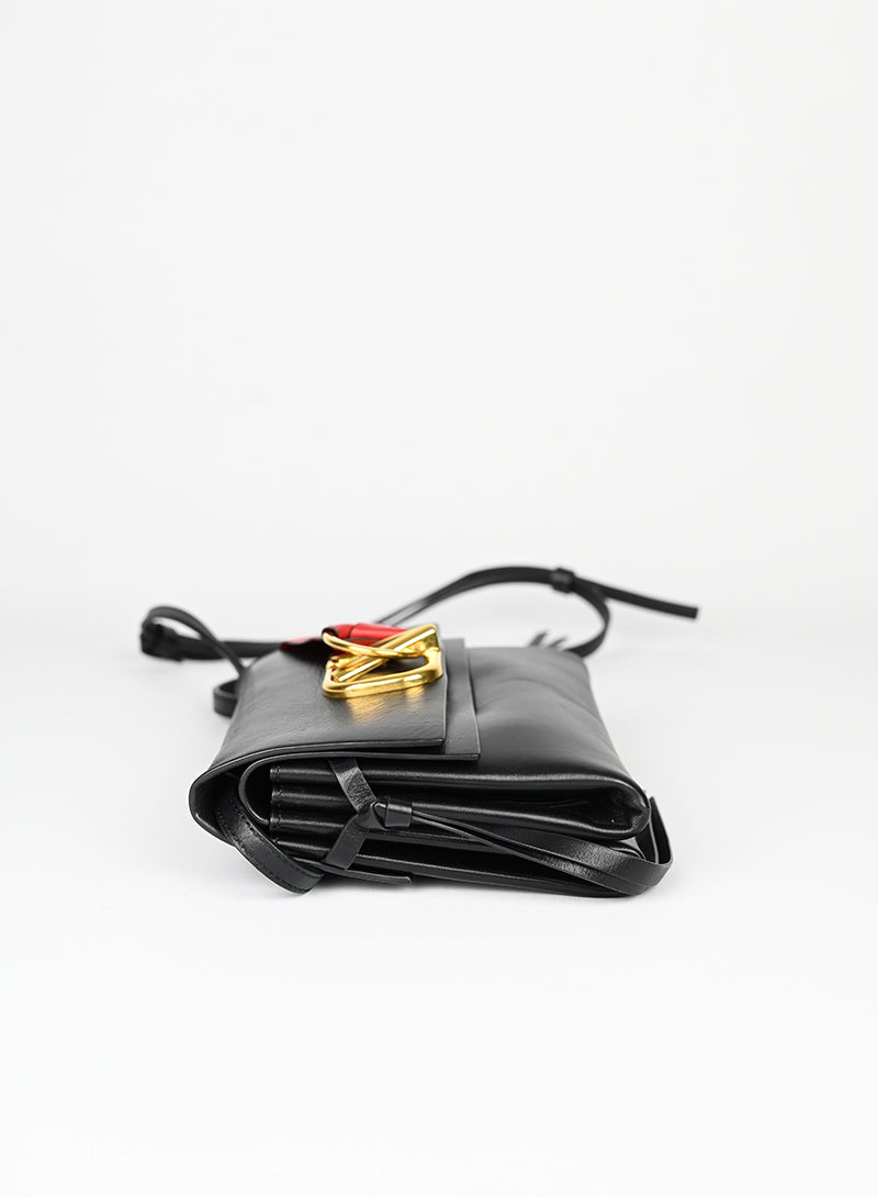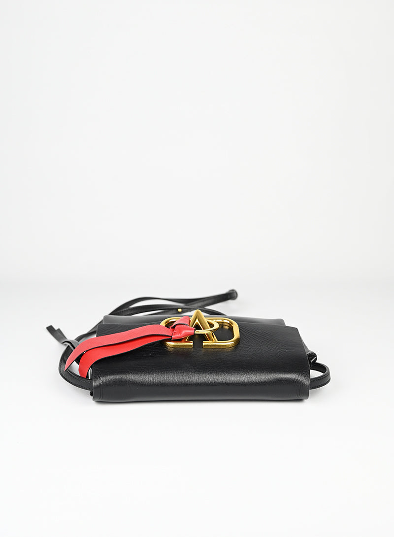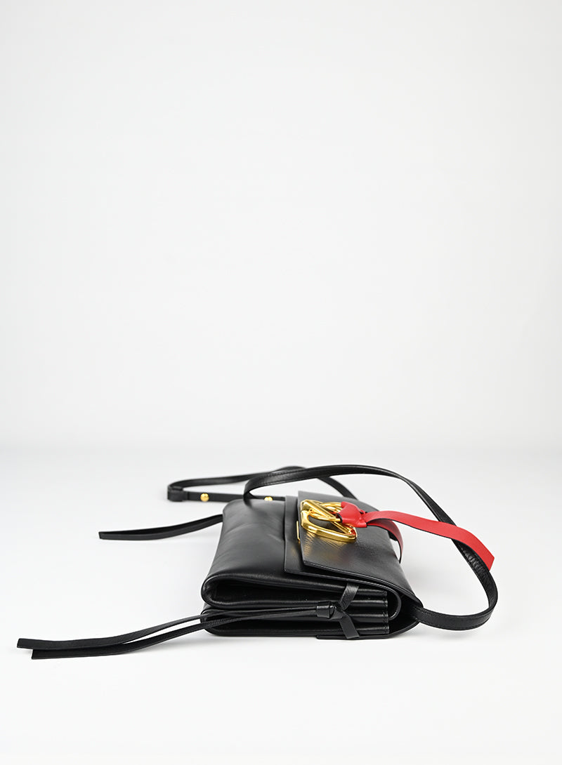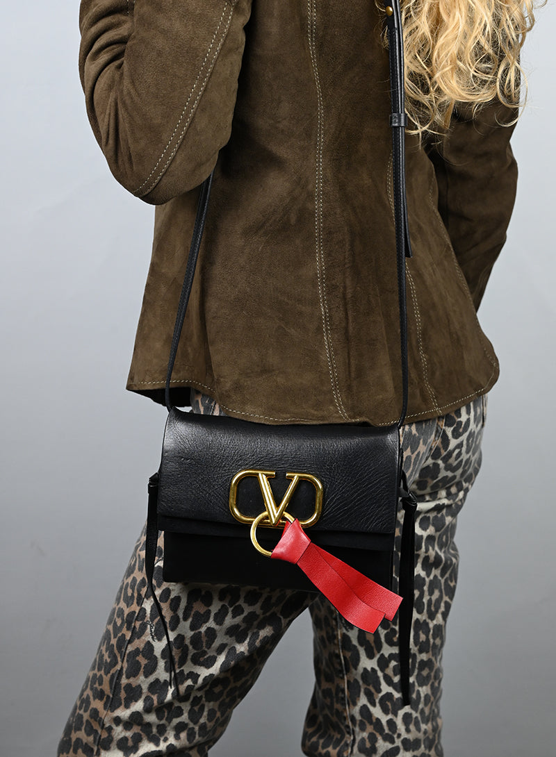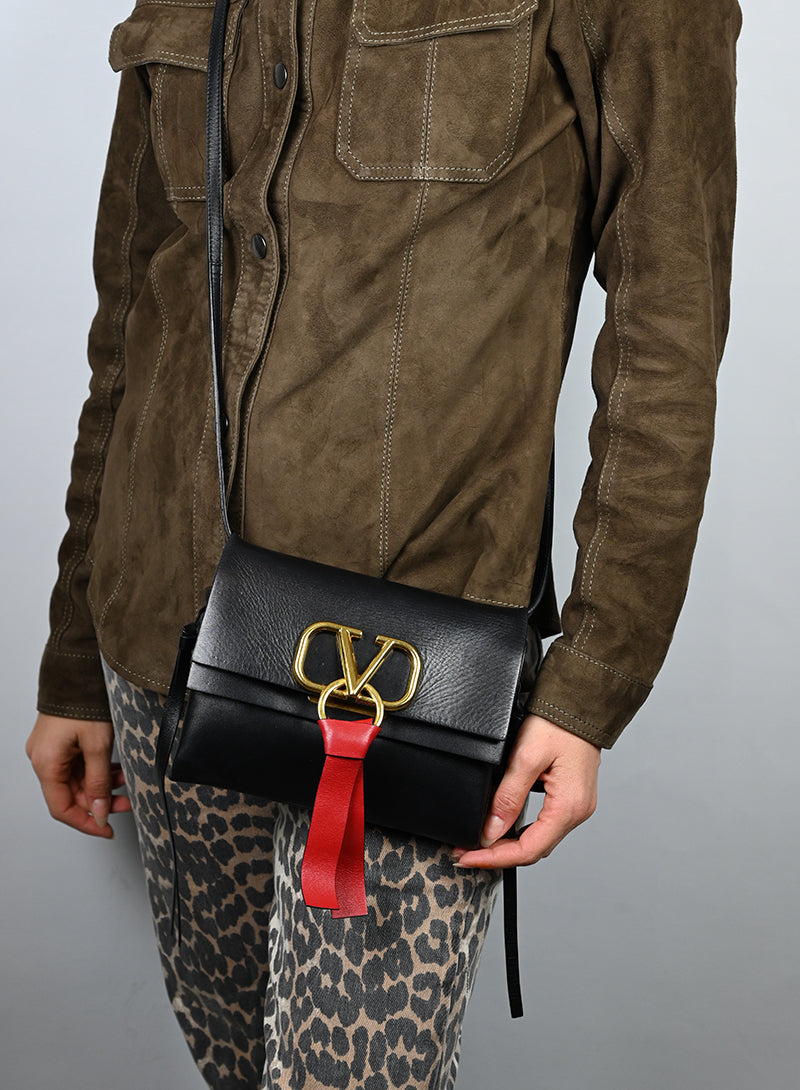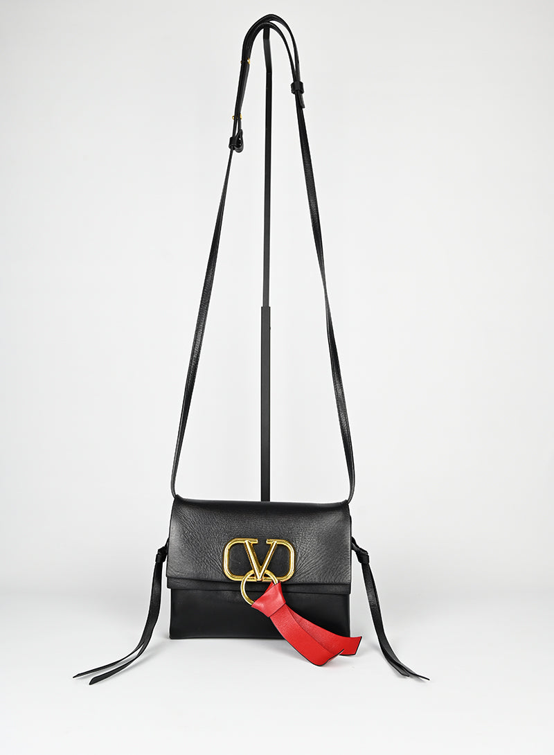 Porta la tua eleganza al livello successivo con la Valentino Borsa a Tracolla Nera con V. Realizzata in pelle nera di alta qualità, presenta un laccio in pelle rossa per un tocco di colore. Con due scomparti interni e una doppia patta, questa borsa offre sia stile che funzionalità. Aggiungi un tocco di lusso al tuo guardaroba con questo iconico design Valentino.