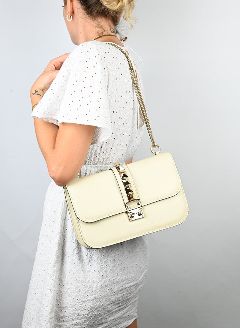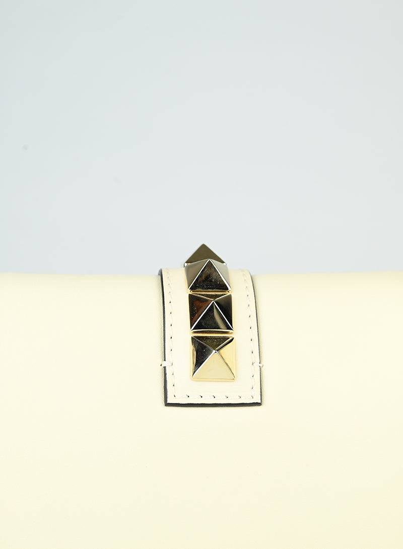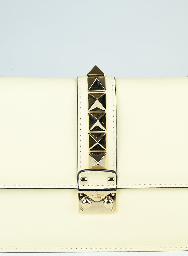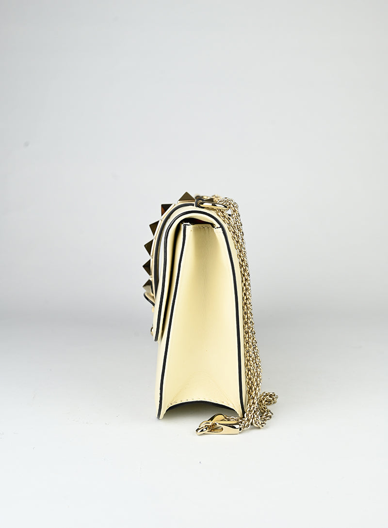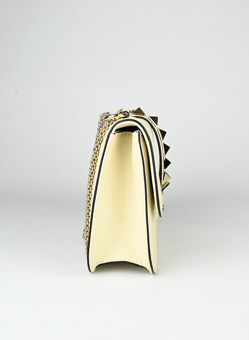 Questa borsa a tracolla Valentino Rockstud in pregiata pelle burro unisce eleganza e carattere grazie alla riga centrale di borchie champagne sulla patta e alla raffinata tracolla a catenella nello stesso tono. La chiusura a scatto garantisce sicurezza, mentre l’interno foderato in tessuto presenta un unico scomparto con due taschine, di cui una con zip, per organizzare al meglio gli oggetti personali. Un accessorio sofisticato che arricchisce ogni look con un tocco di lusso discreto.