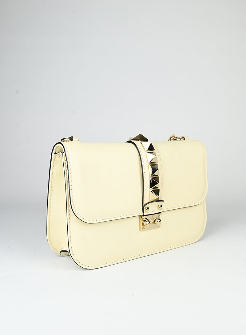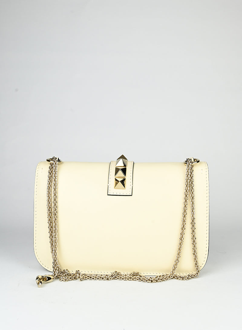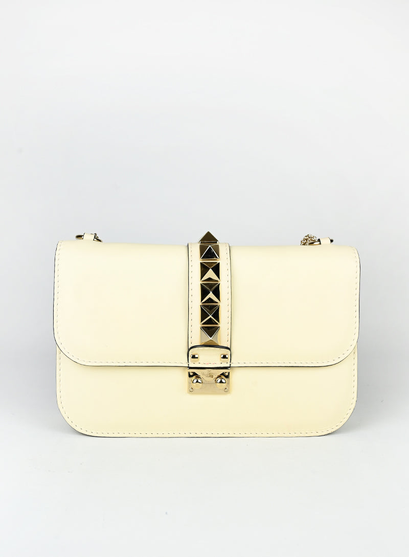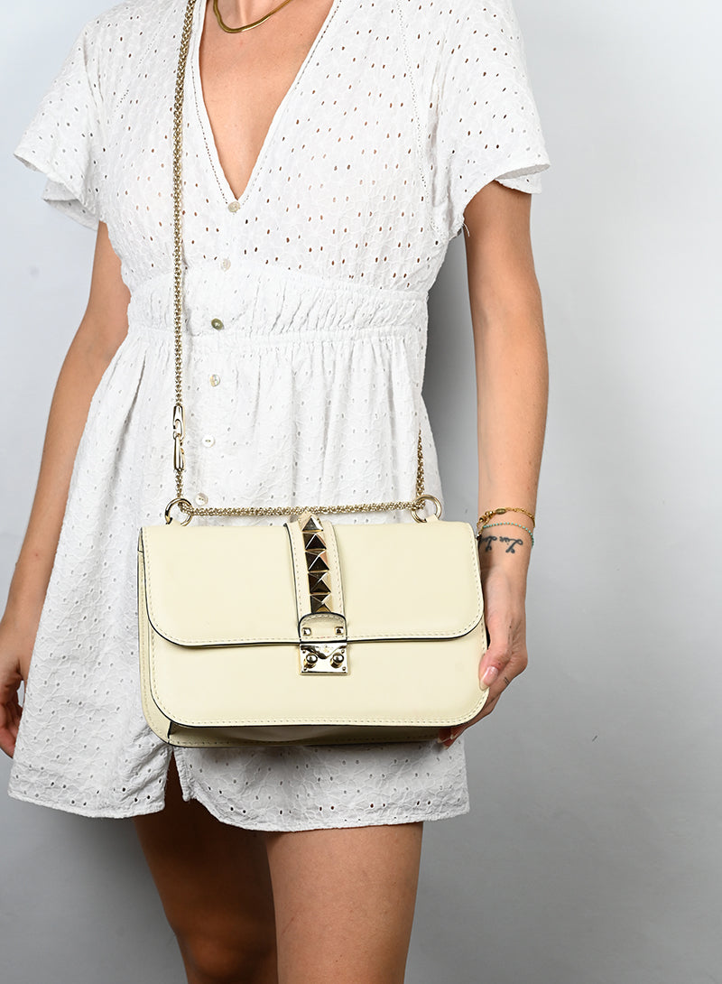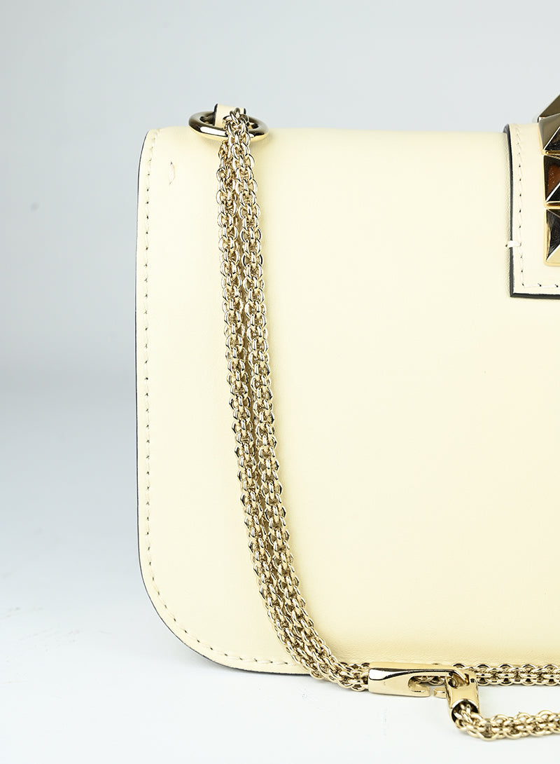 Questa borsa a tracolla Valentino Rockstud in pregiata pelle burro unisce eleganza e carattere grazie alla riga centrale di borchie champagne sulla patta e alla raffinata tracolla a catenella nello stesso tono. La chiusura a scatto garantisce sicurezza, mentre l’interno foderato in tessuto presenta un unico scomparto con due taschine, di cui una con zip, per organizzare al meglio gli oggetti personali. Un accessorio sofisticato che arricchisce ogni look con un tocco di lusso discreto.