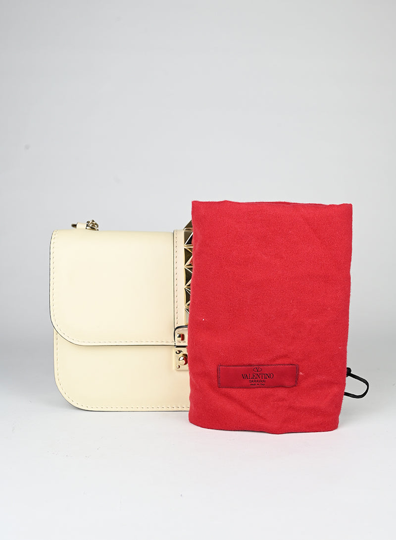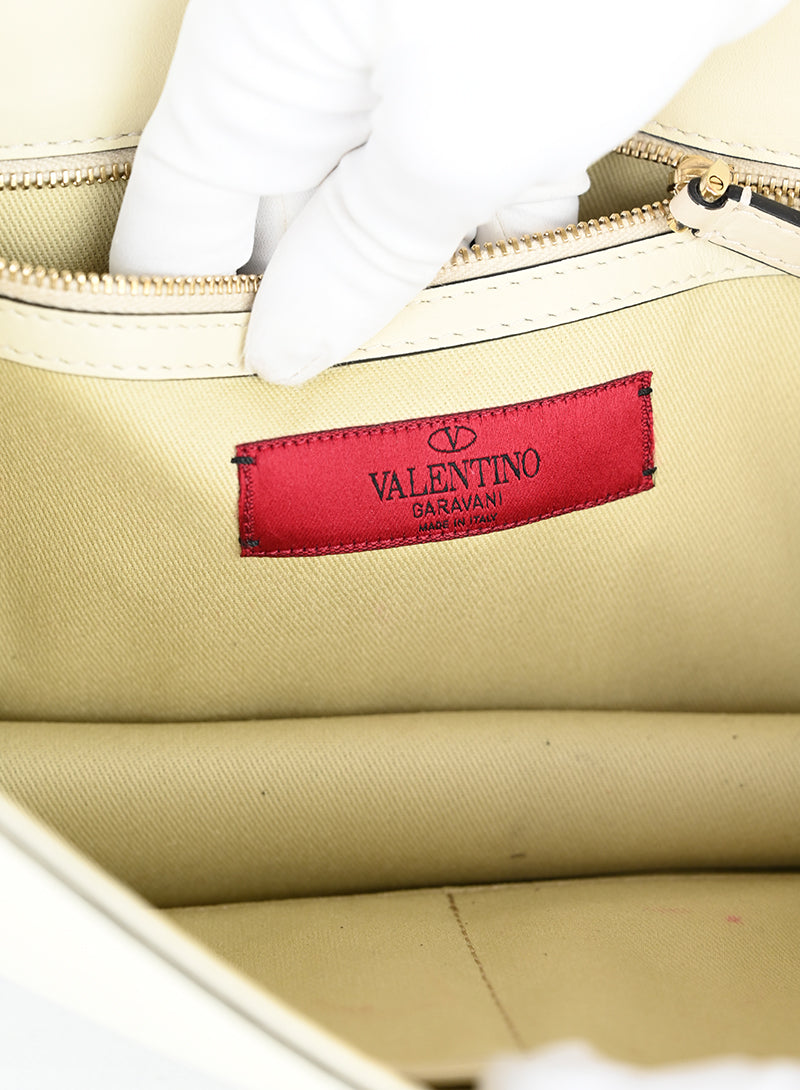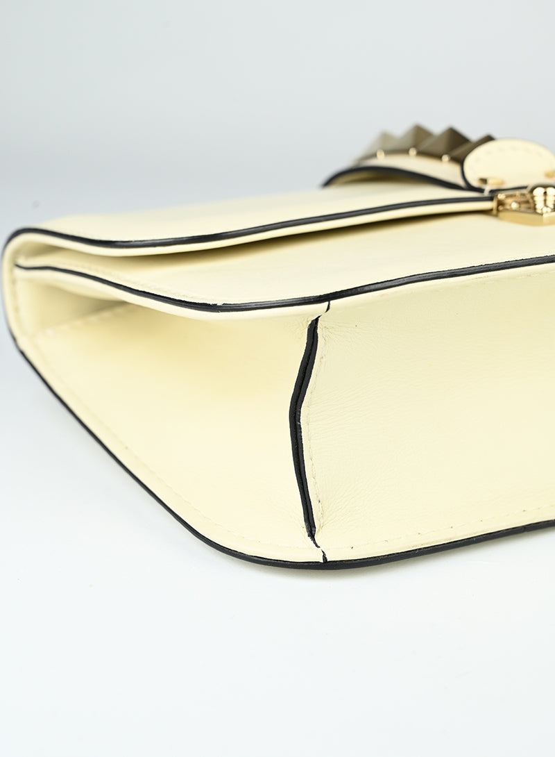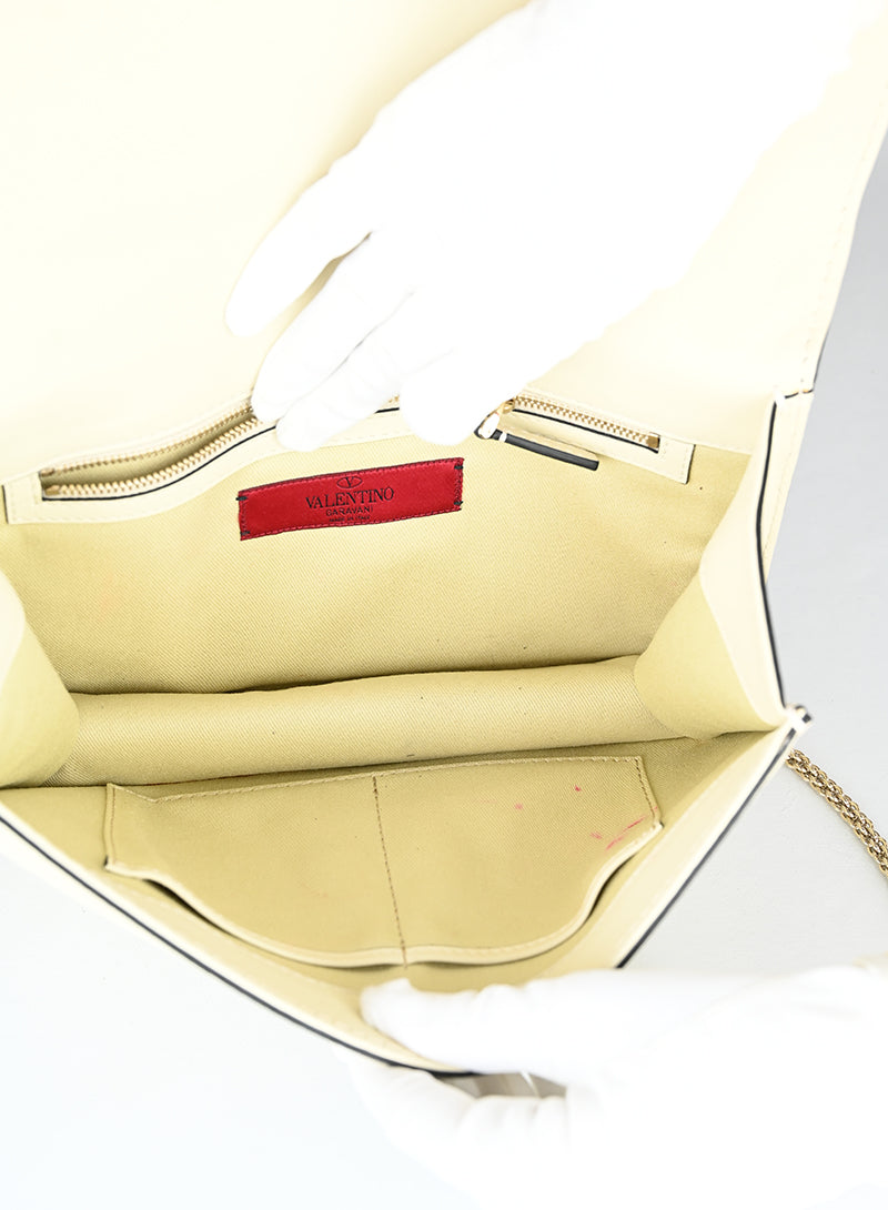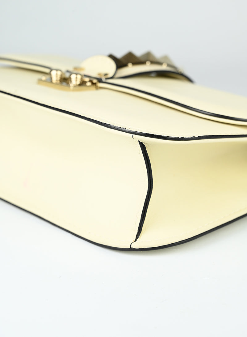 Questa borsa a tracolla Valentino Rockstud in pregiata pelle burro unisce eleganza e carattere grazie alla riga centrale di borchie champagne sulla patta e alla raffinata tracolla a catenella nello stesso tono. La chiusura a scatto garantisce sicurezza, mentre l’interno foderato in tessuto presenta un unico scomparto con due taschine, di cui una con zip, per organizzare al meglio gli oggetti personali. Un accessorio sofisticato che arricchisce ogni look con un tocco di lusso discreto.
