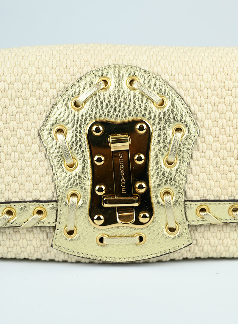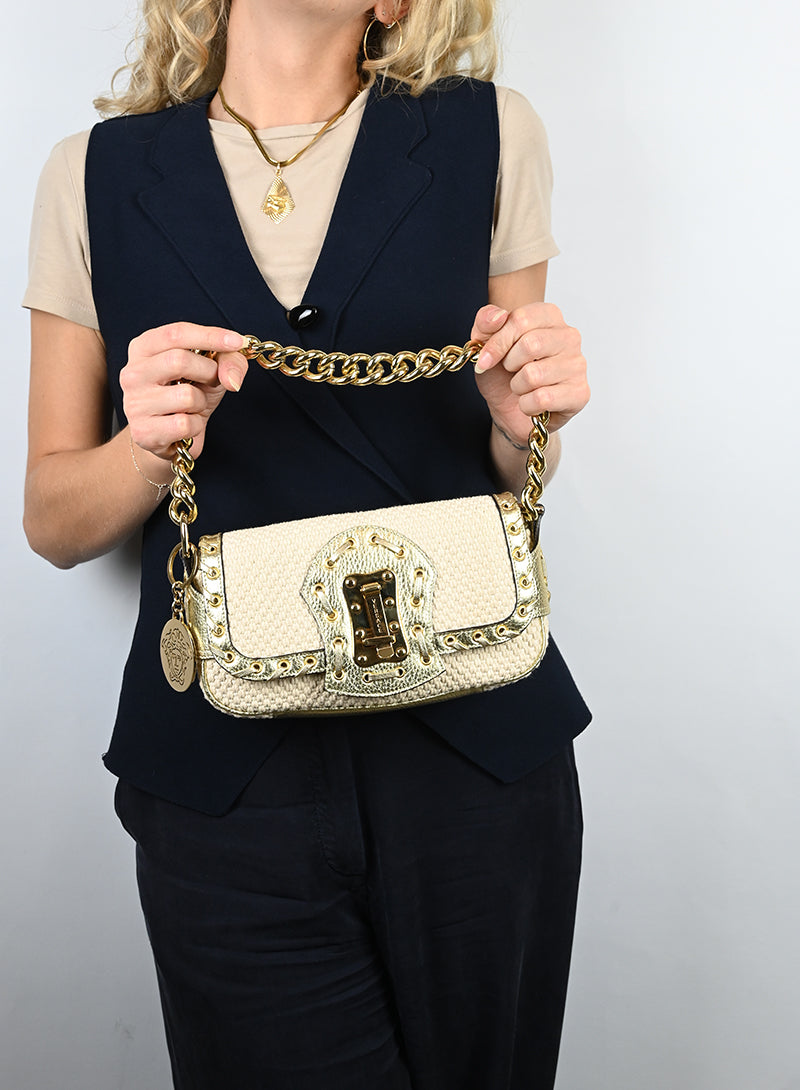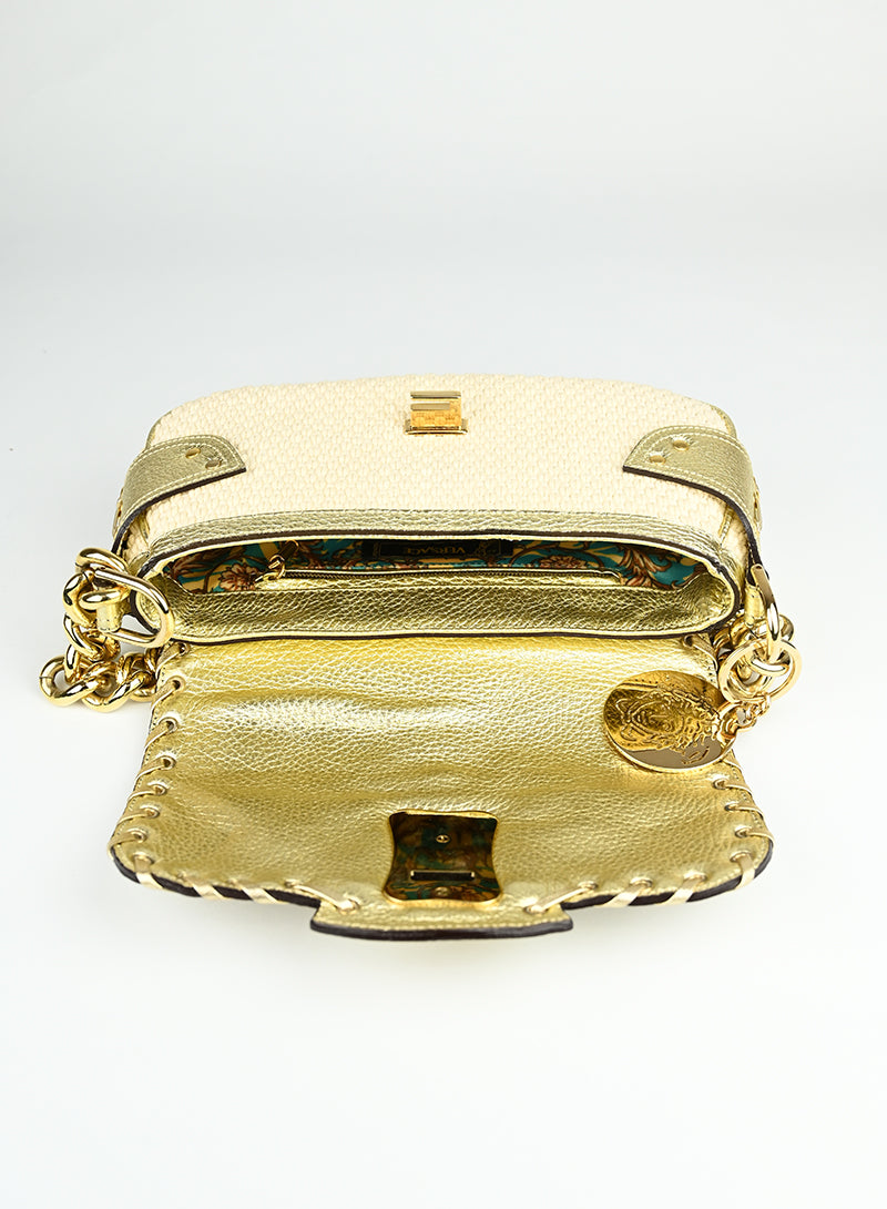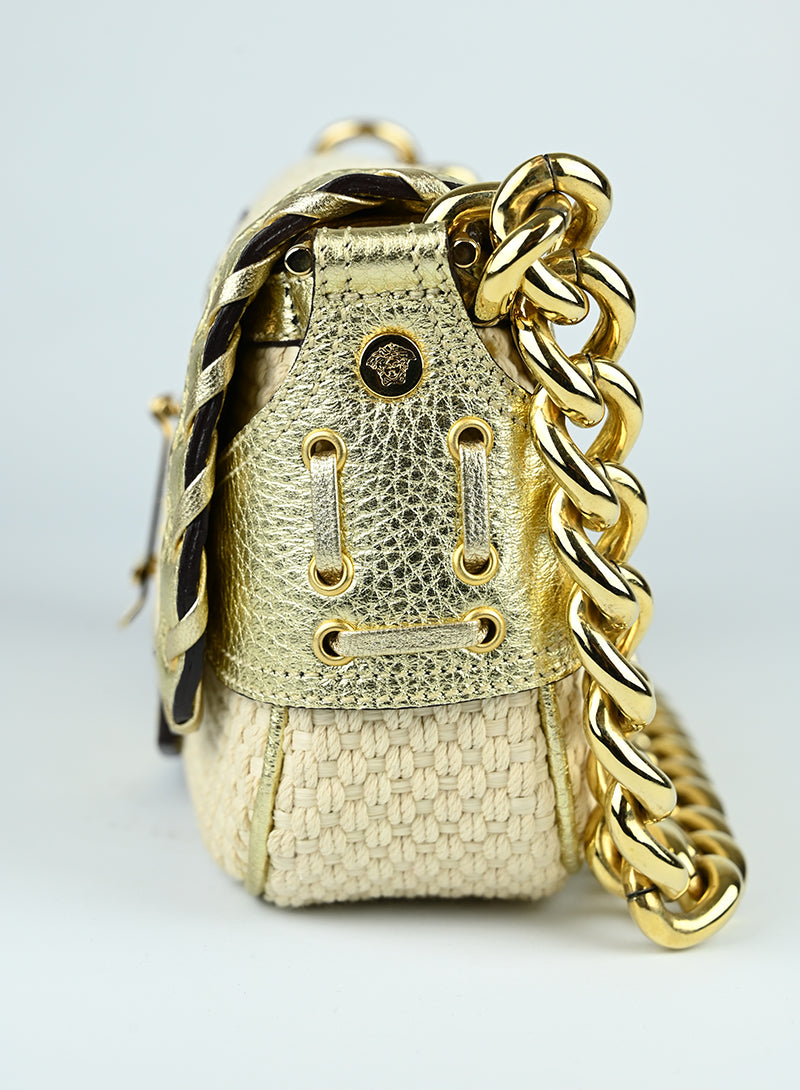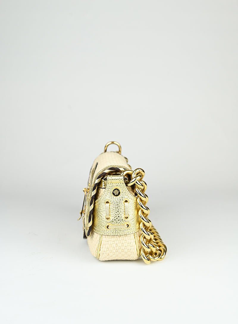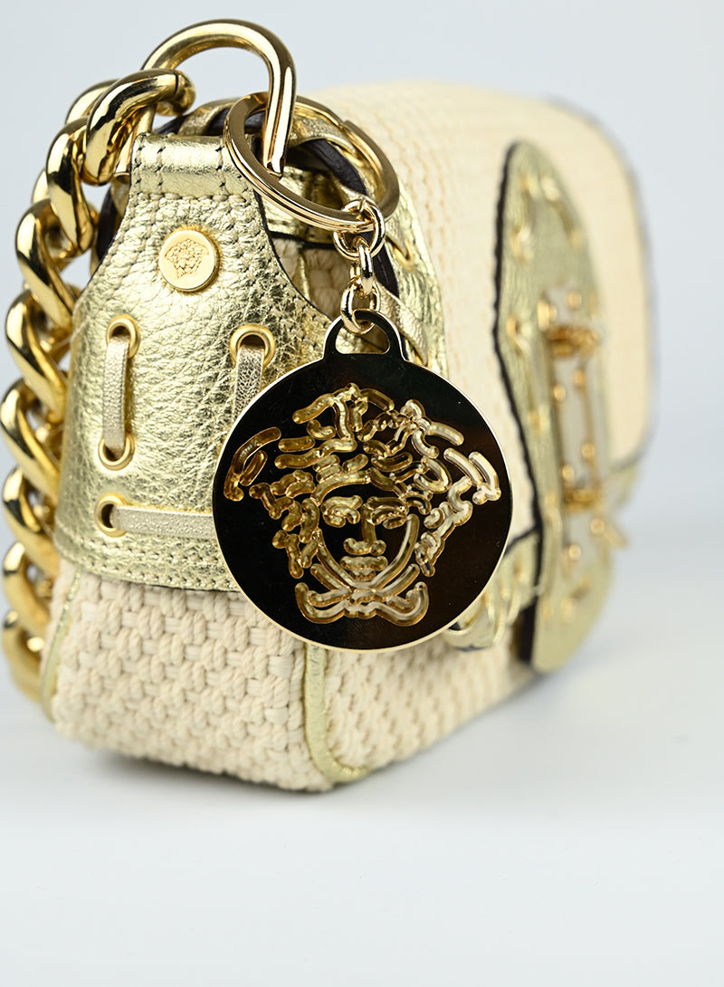 Borsina a spalla Versace in tessuto tricot con profili in pelle oro e maxi impunture. Dettagli in hardware oro, bulloncini e manico a catena oro. Chiusura ad "incastro", interno foderato con scompartimento e taschina con zip. Completata da un maxi charms Medusa, per un tocco iconico e sofisticato.