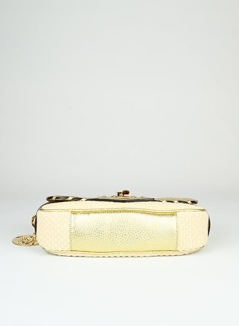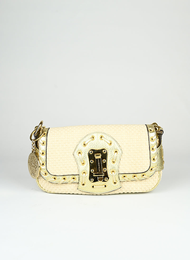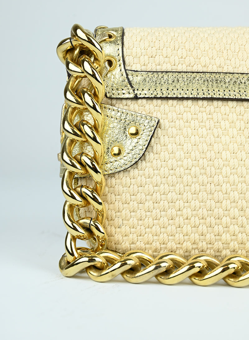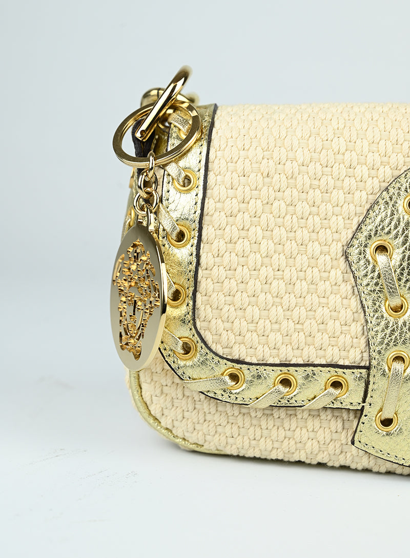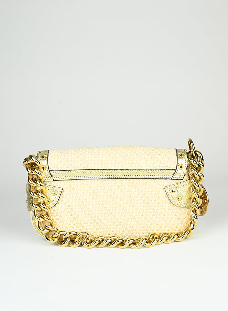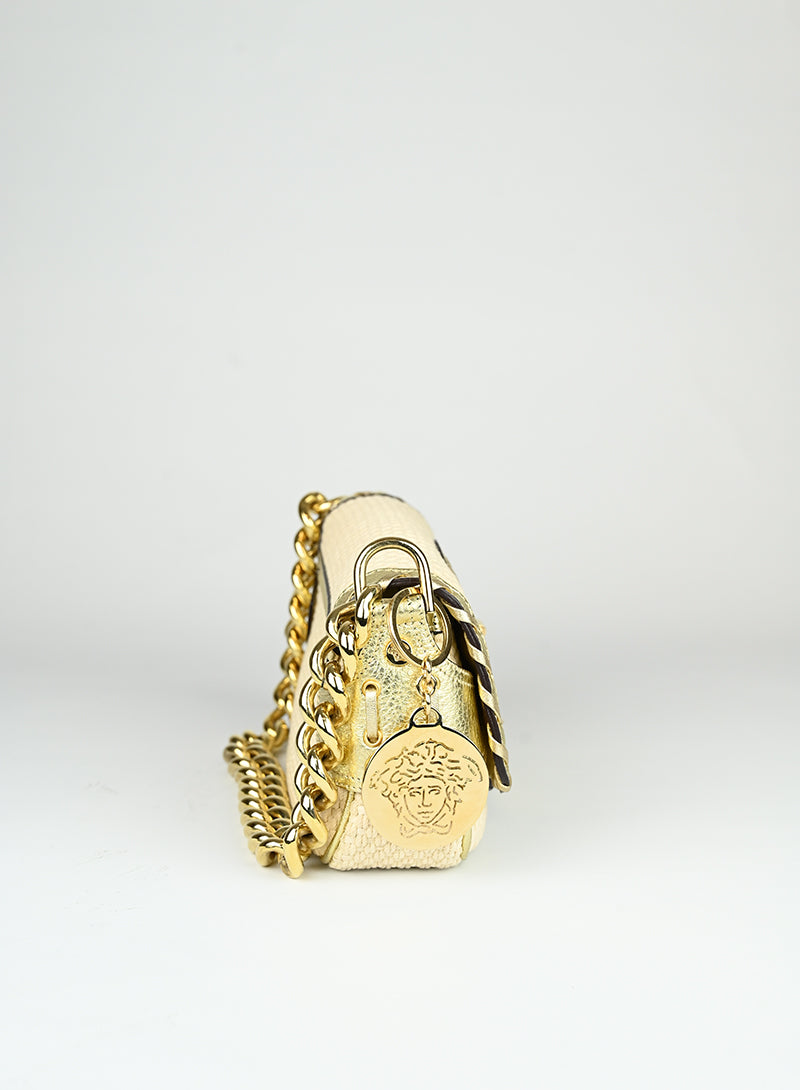 Borsina a spalla Versace in tessuto tricot con profili in pelle oro e maxi impunture. Dettagli in hardware oro, bulloncini e manico a catena oro. Chiusura ad "incastro", interno foderato con scompartimento e taschina con zip. Completata da un maxi charms Medusa, per un tocco iconico e sofisticato.