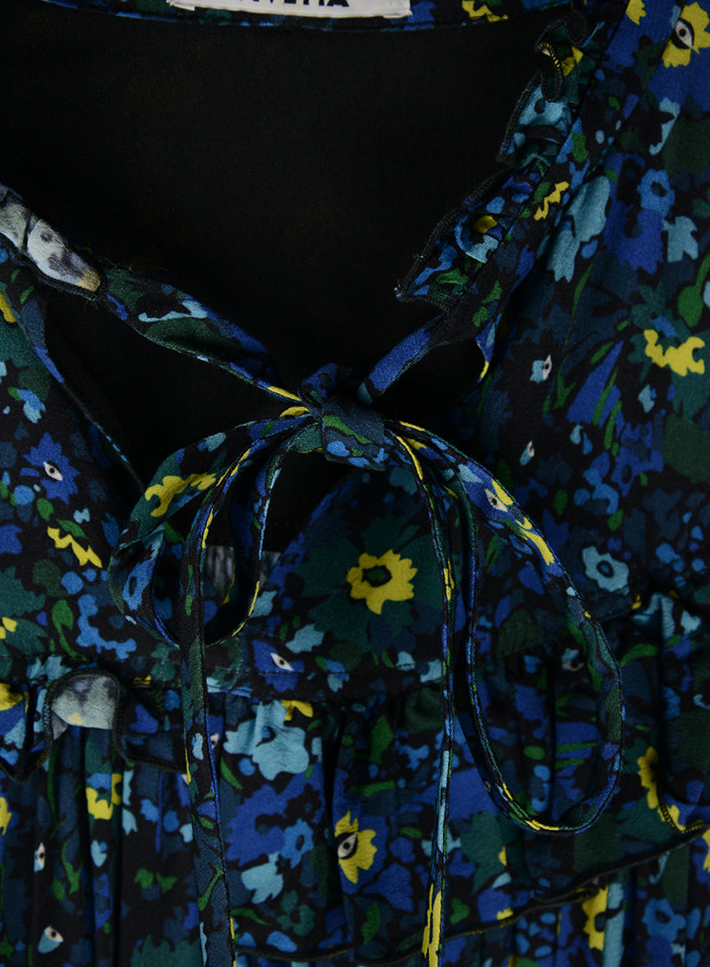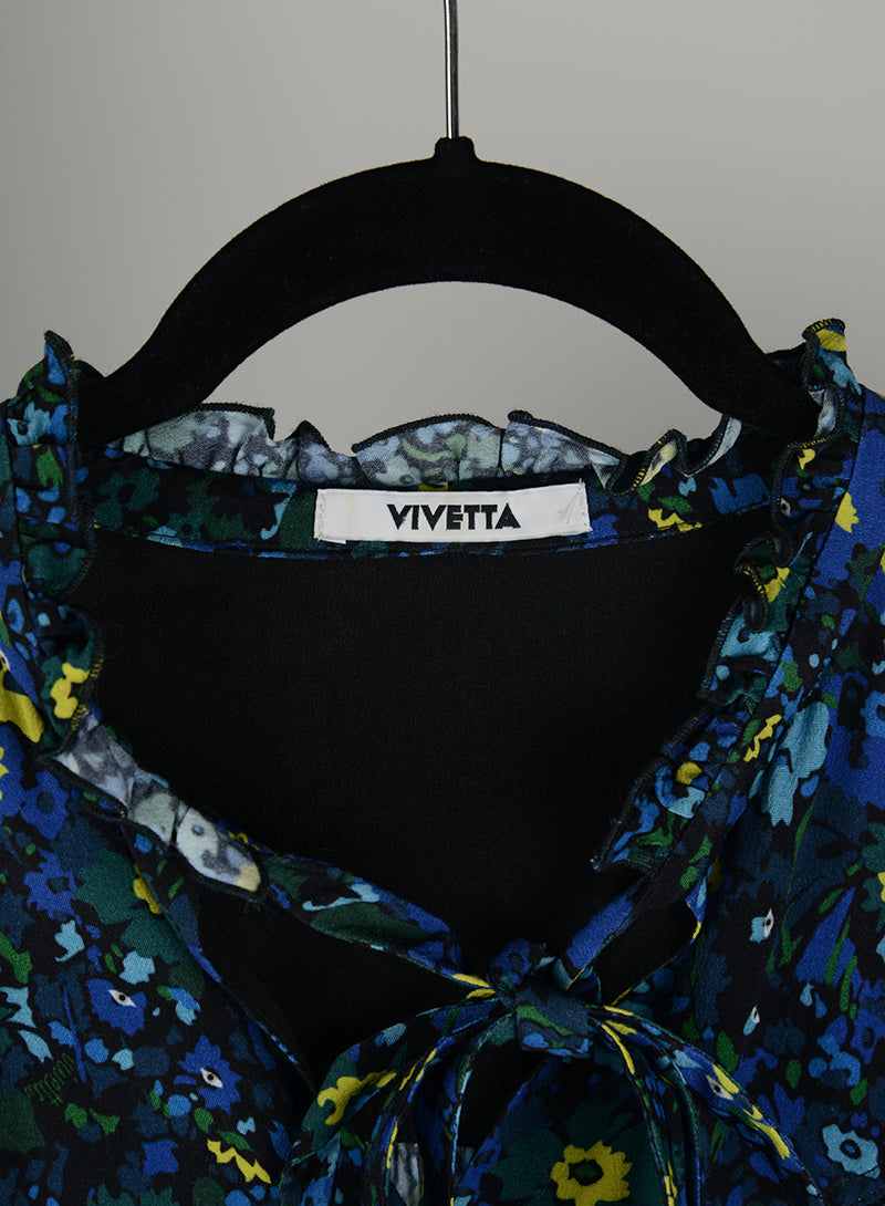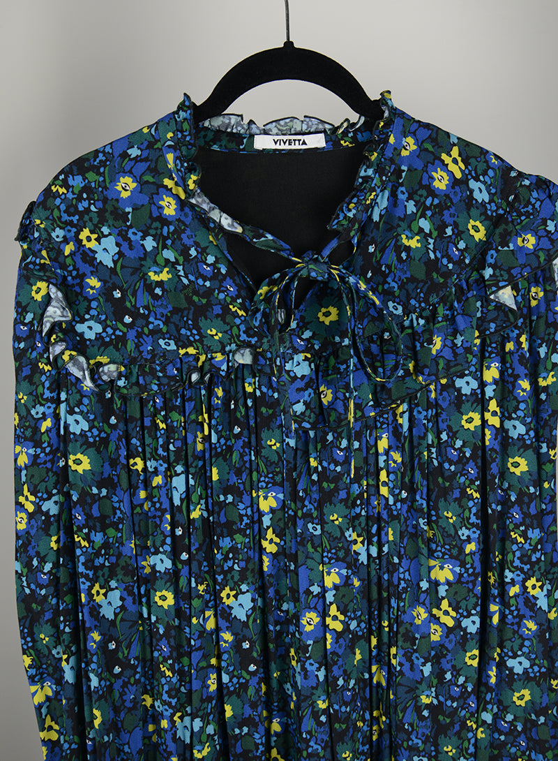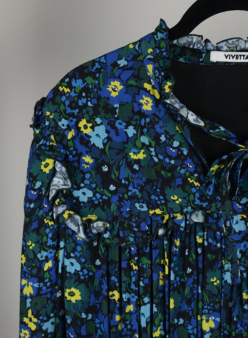 Esaltate la grazia e l'eleganza con questo abito lungo Vivetta in blu con fiori. Con maniche lunghe e svasato, è decorato con ruches e un fiocchetto al collo, per una silhouette femminile e sofisticata. Perfetto per serate speciali e catturare lo sguardo.
