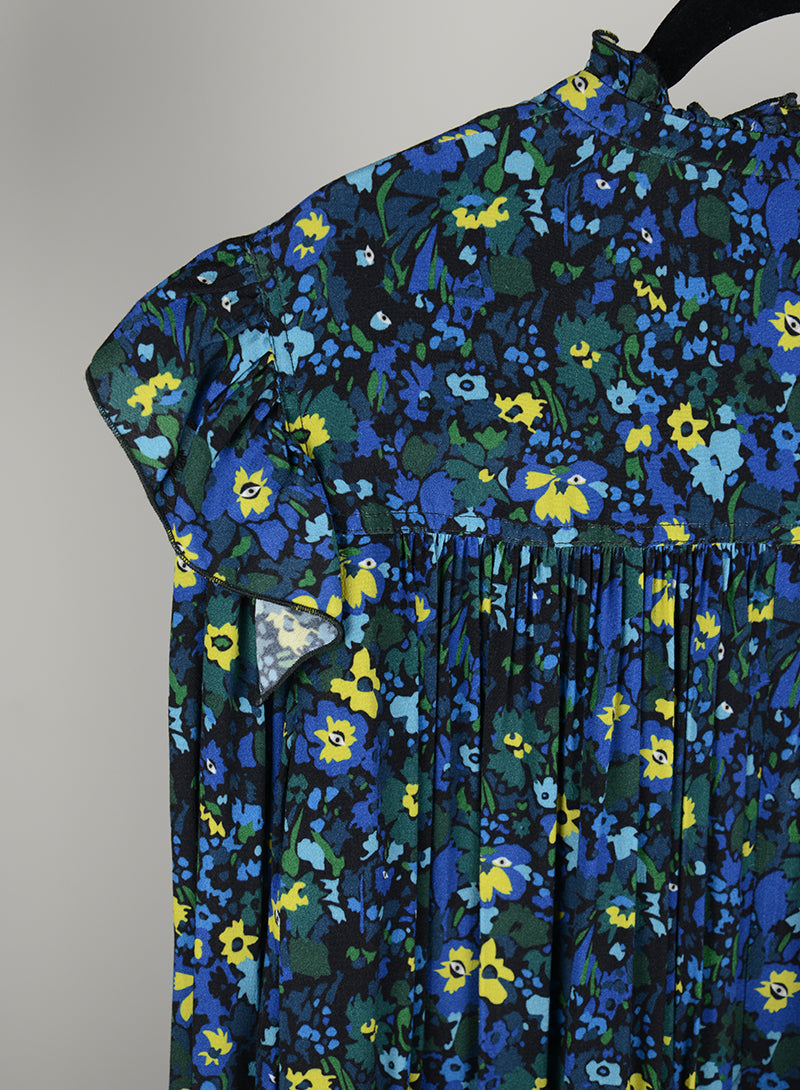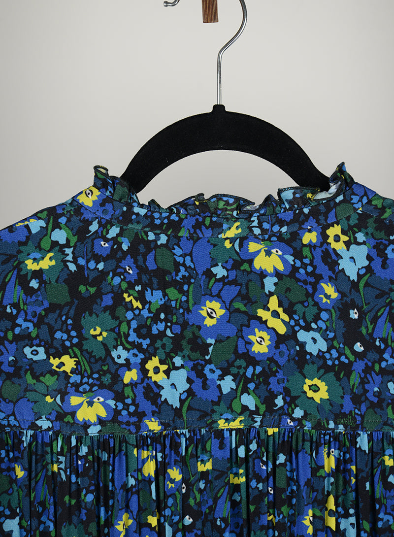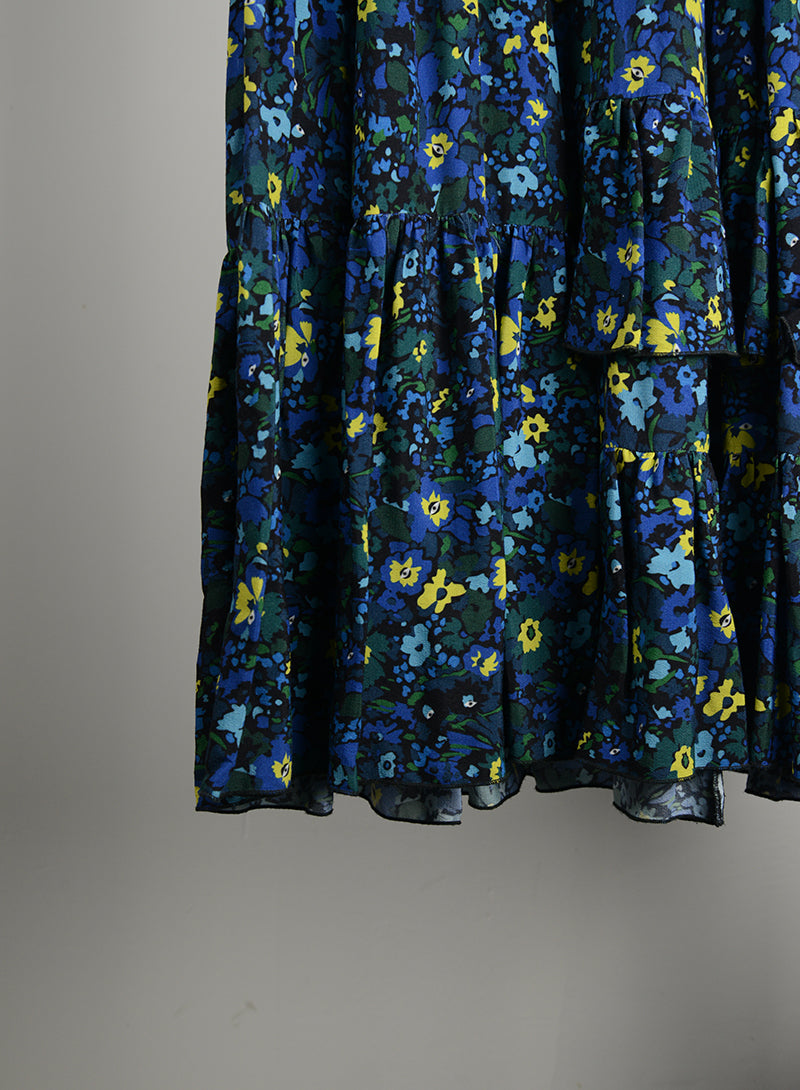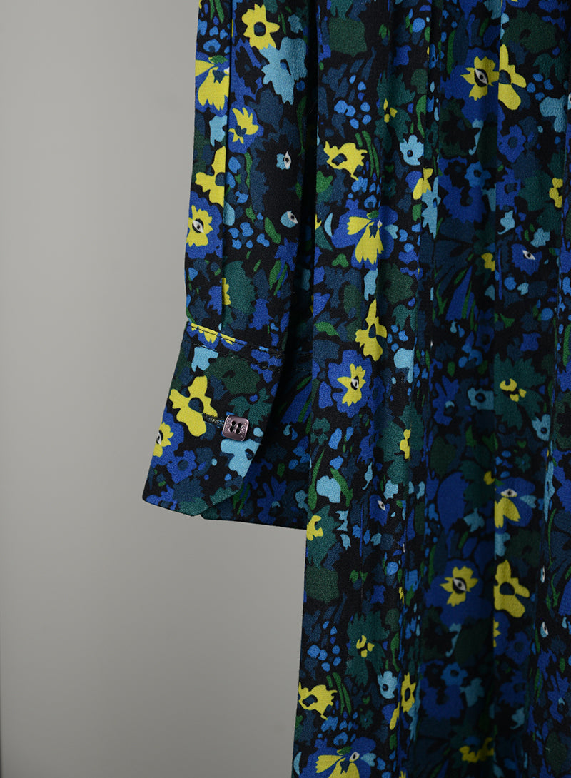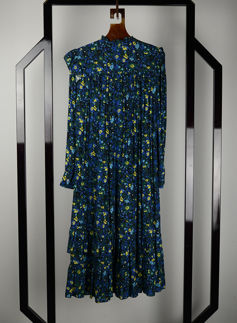 Esaltate la grazia e l'eleganza con questo abito lungo Vivetta in blu con fiori. Con maniche lunghe e svasato, è decorato con ruches e un fiocchetto al collo, per una silhouette femminile e sofisticata. Perfetto per serate speciali e catturare lo sguardo.