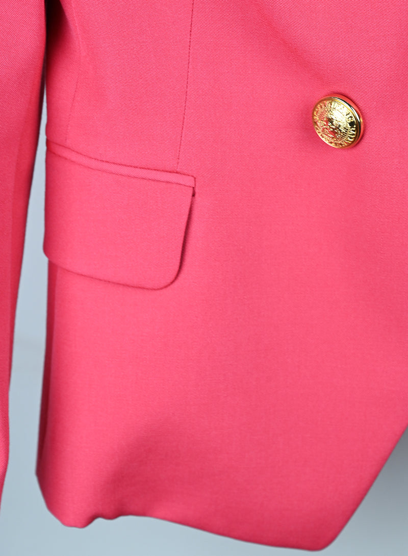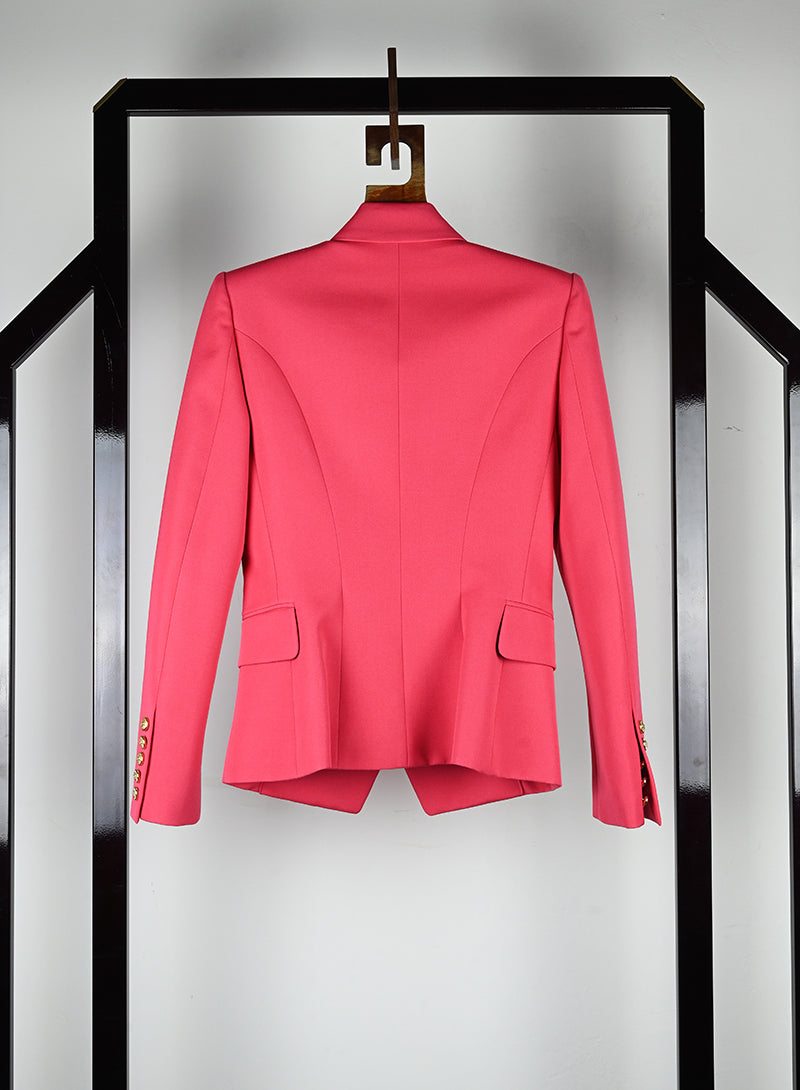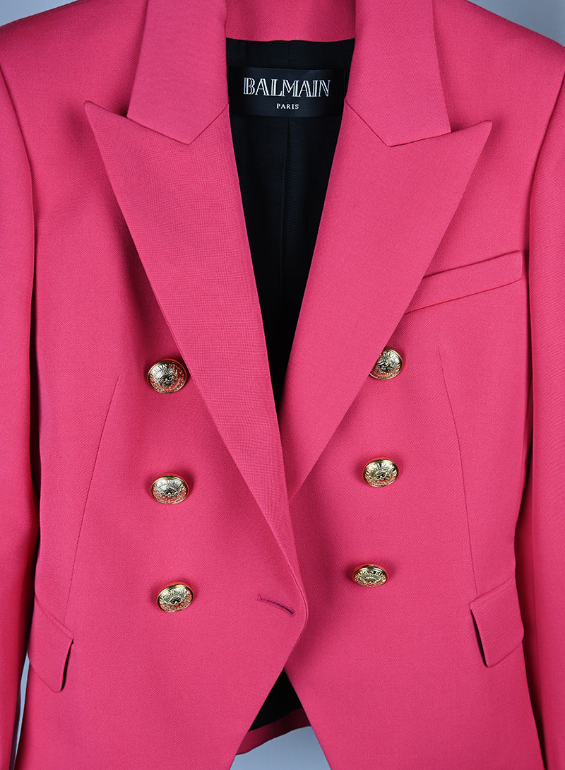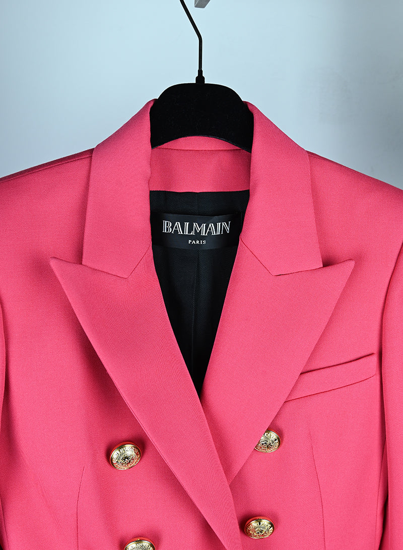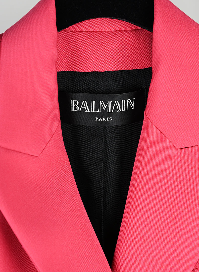Esaltate il vostro stile con il Blazer Balmain in color fragola. Con il suo doppiopetto avvitato abbinato ai sei bottoni in oro con stemma e i dettagli come il rever e le tasche, vi sentirete chic e sofisticate. La fodera e le spalline garantiscono una vestibilità impeccabile.