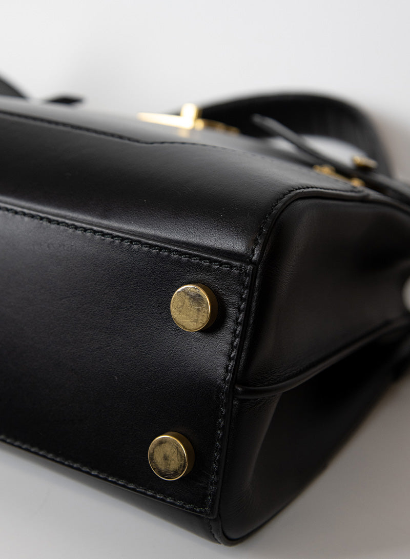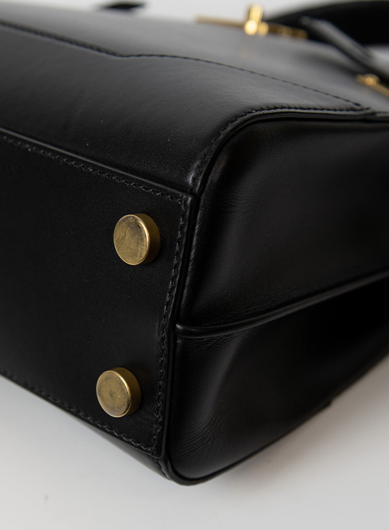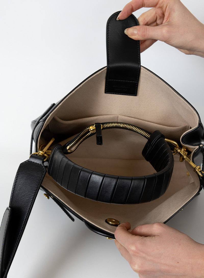 Borsa Balmain in pelle di vitello nera. Un manico superiore con intreccio in nappa+, tracolla removibile in pelle nera. Hardware oro, logo applicato frontale. Chiusura con bottone interno, due scomparti interni suede.