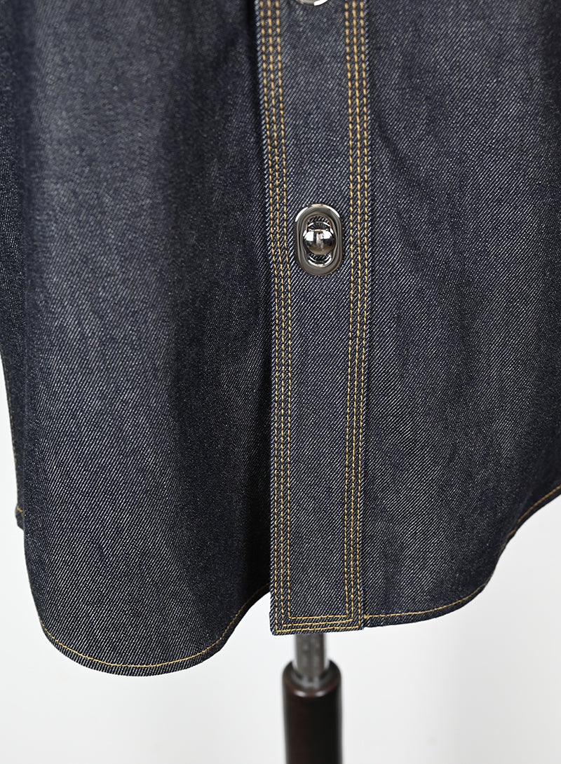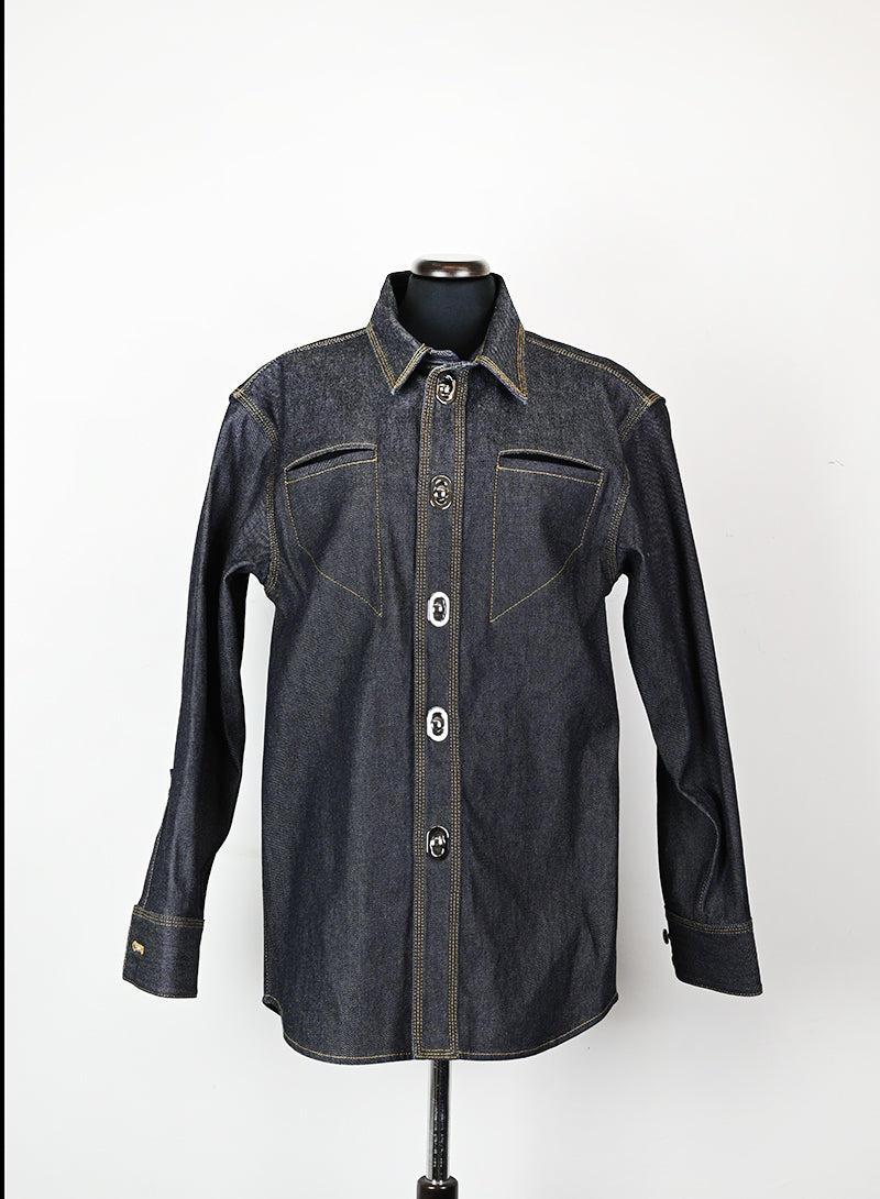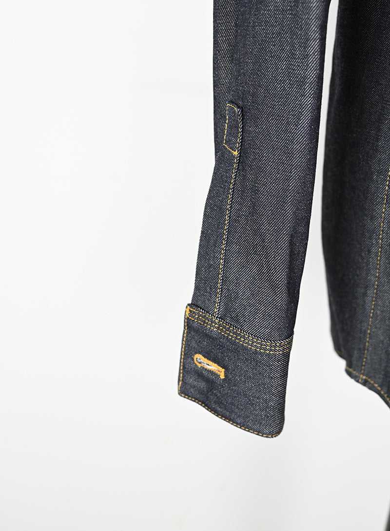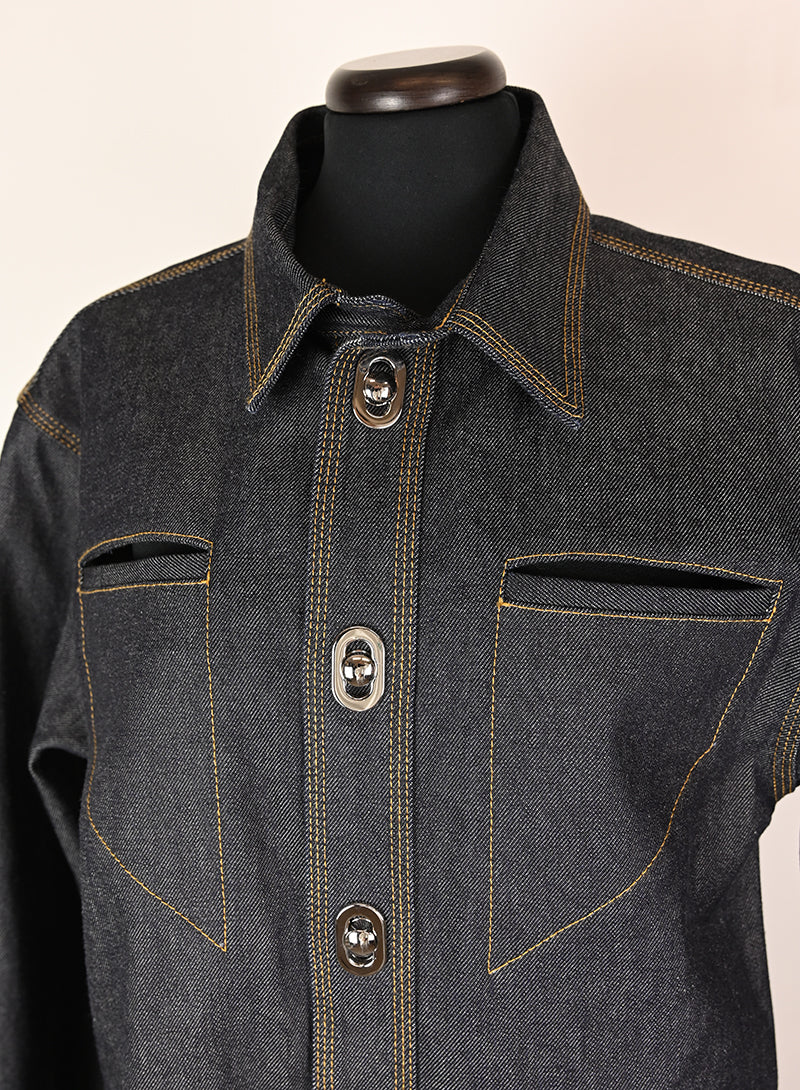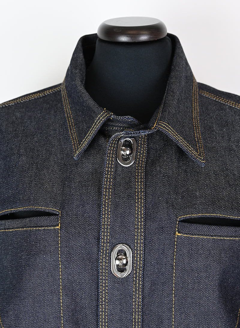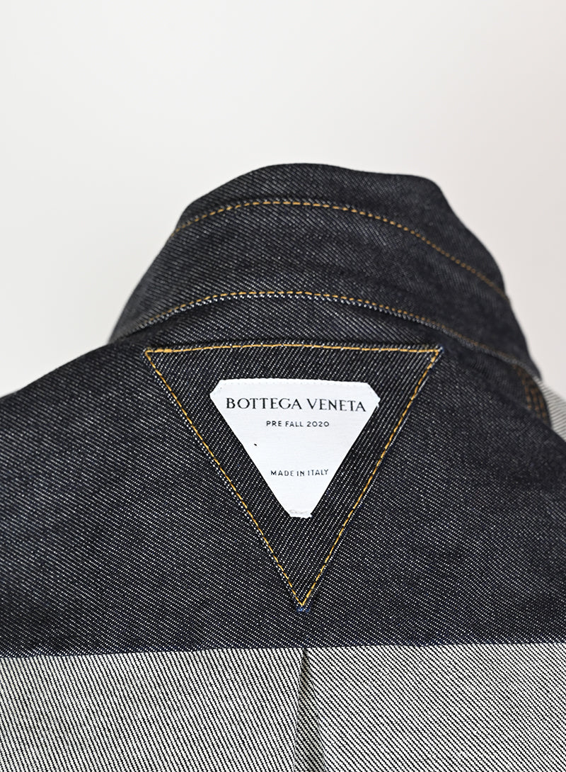 La giacca in denim Bottega Veneta, taglia 40, è un capo di alta qualità. Il denim scuro e le impunture color ocra conferiscono un tocco di eleganza. Dotata di due tasche e di una chiusura a 5 bottoni metallici, questa giacca è un must-have per un look raffinato e di lusso.
