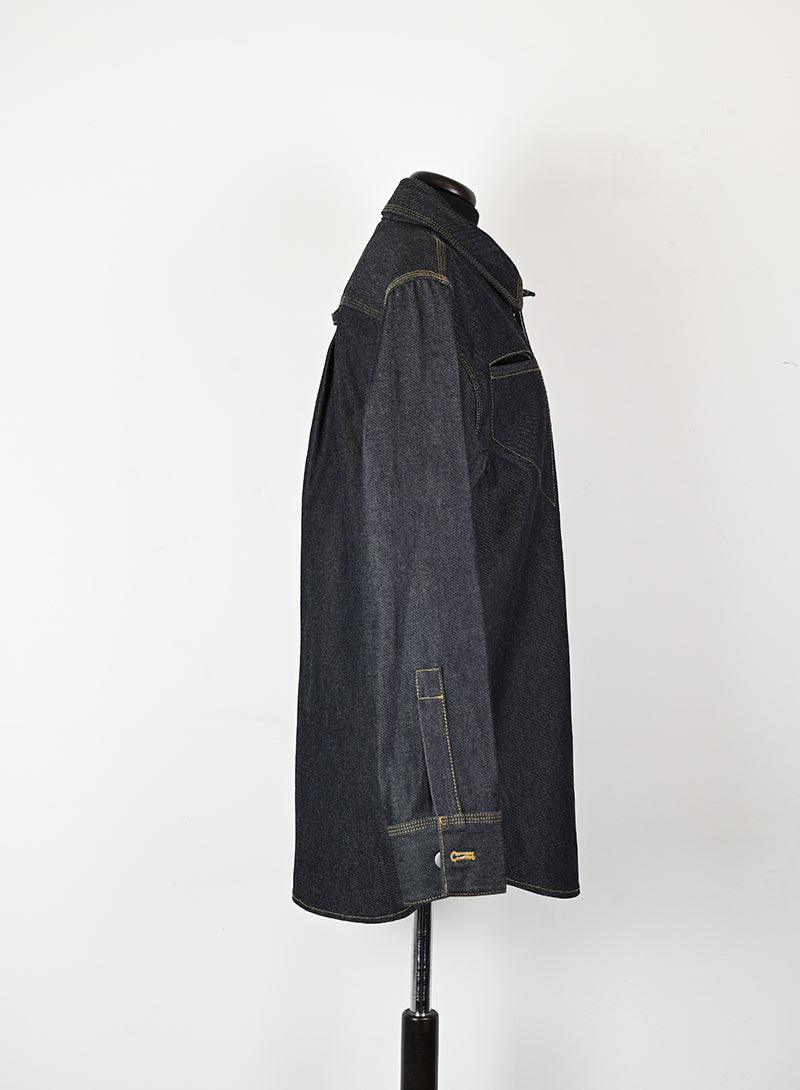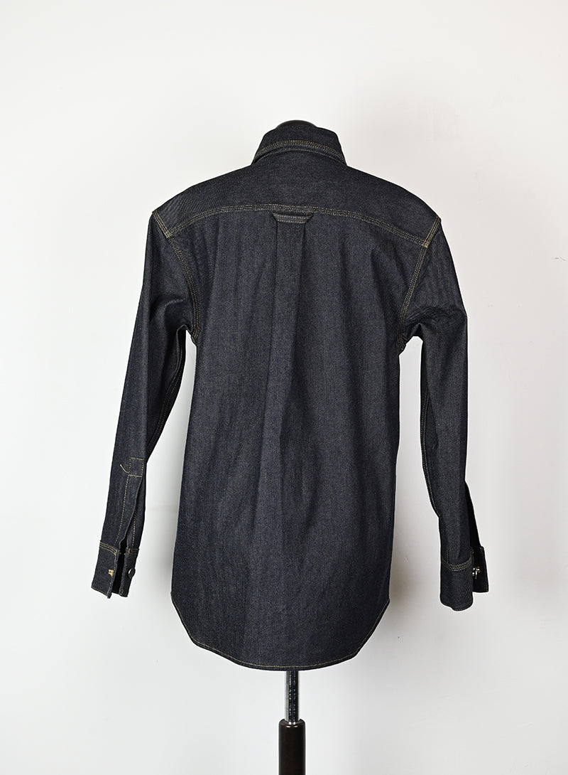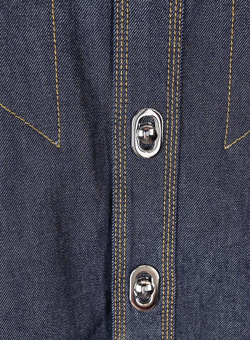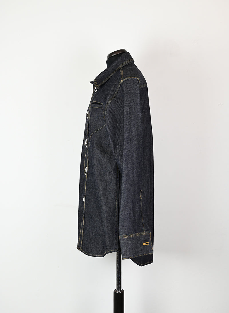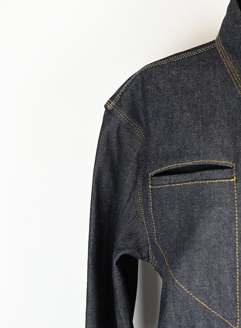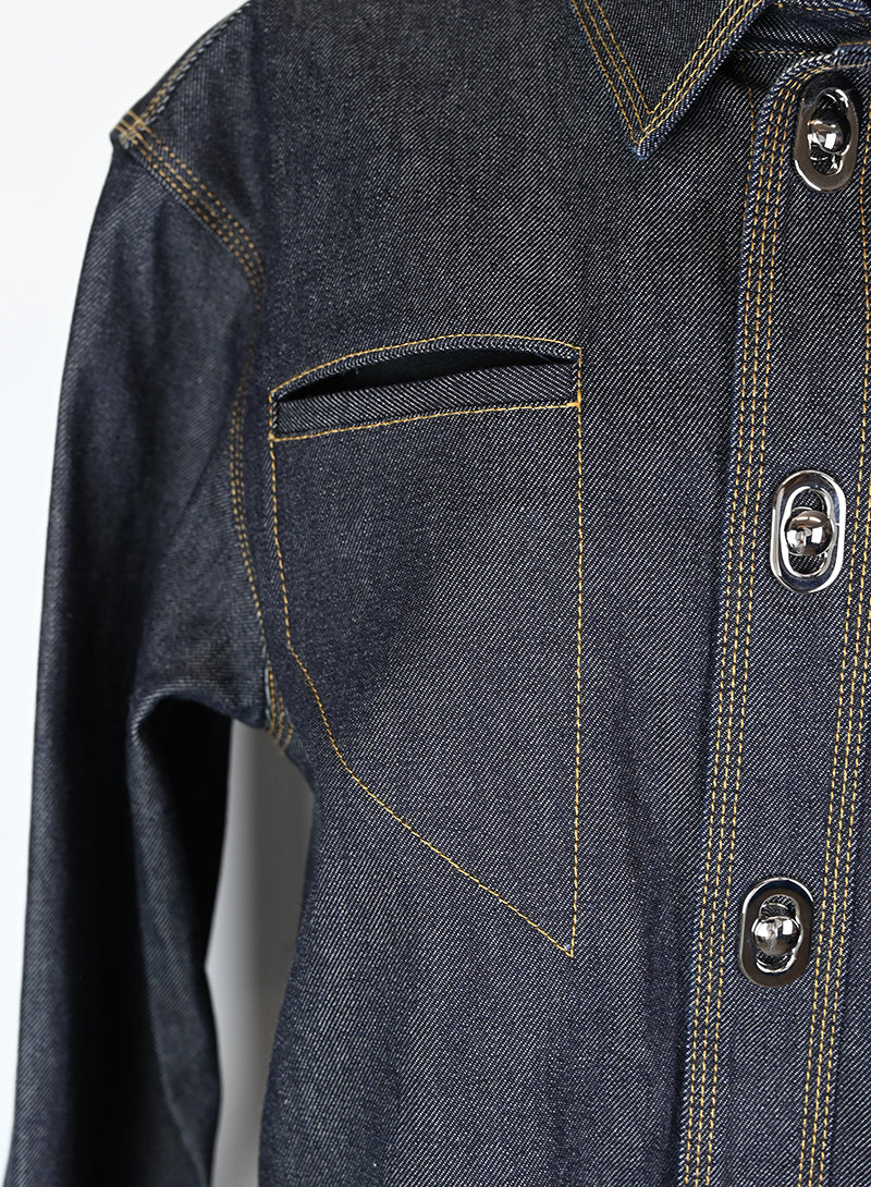 La giacca in denim Bottega Veneta, taglia 40, è un capo di alta qualità. Il denim scuro e le impunture color ocra conferiscono un tocco di eleganza. Dotata di due tasche e di una chiusura a 5 bottoni metallici, questa giacca è un must-have per un look raffinato e di lusso.