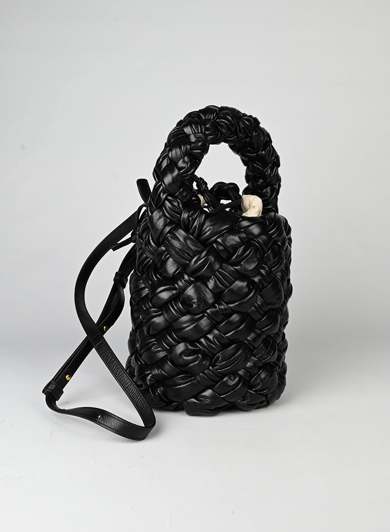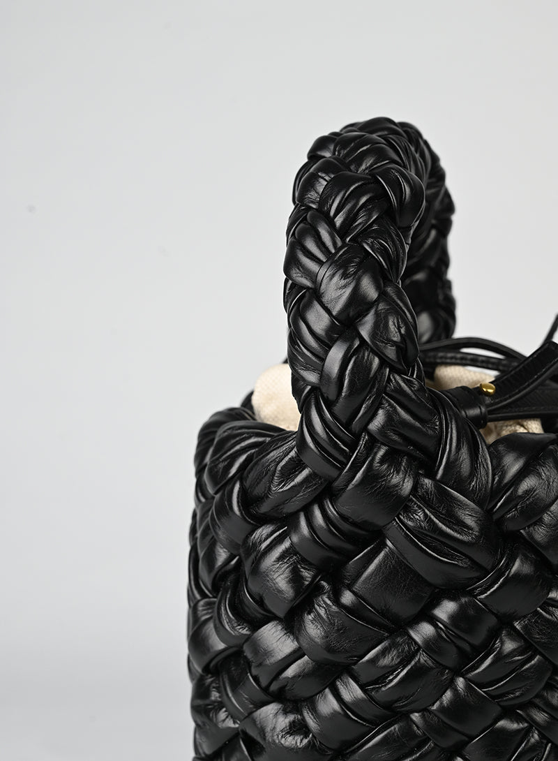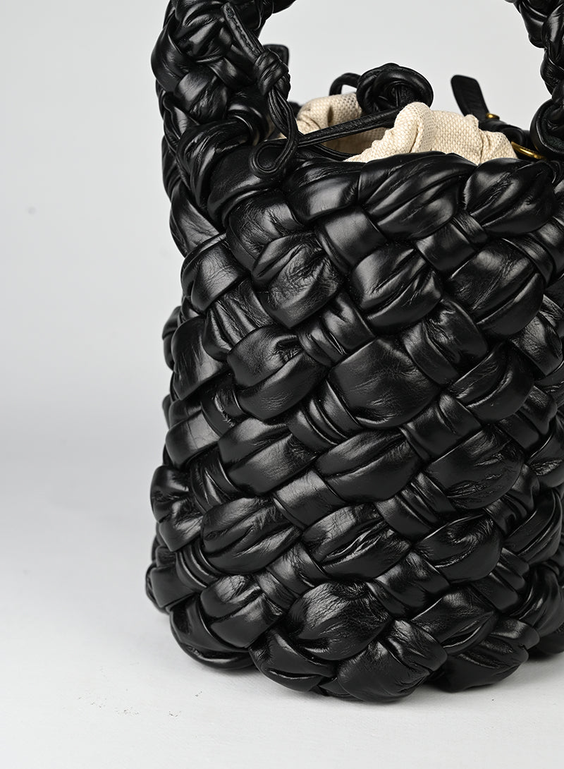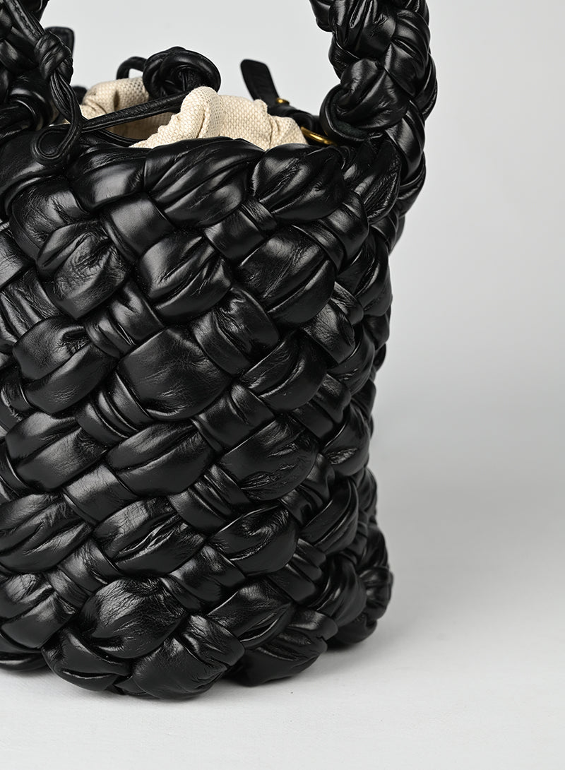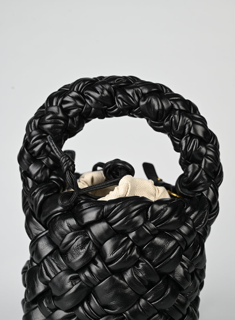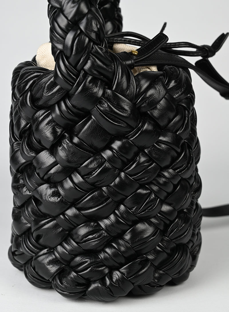 La Bottega Veneta Kalimero Bucket 2023 in pelle nera intrecciata unisce eleganza e funzionalità. Dotata di un manico e una tracolla in pelle removibile, offre versatilità nel trasporto. L’interno con chiusura a sacchetto in canvas garantisce sicurezza e stile discreto, perfetto per chi cerca un accessorio raffinato e pratico.