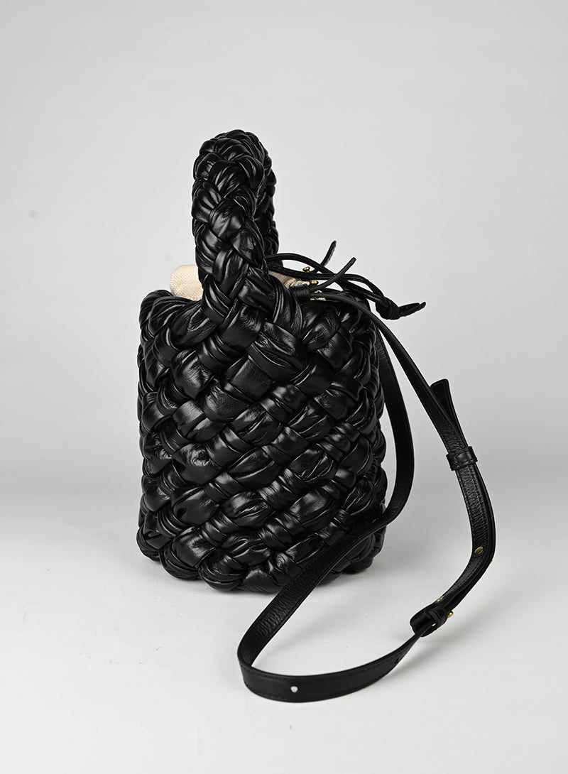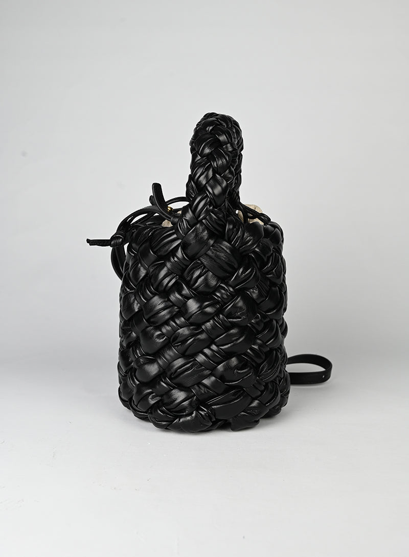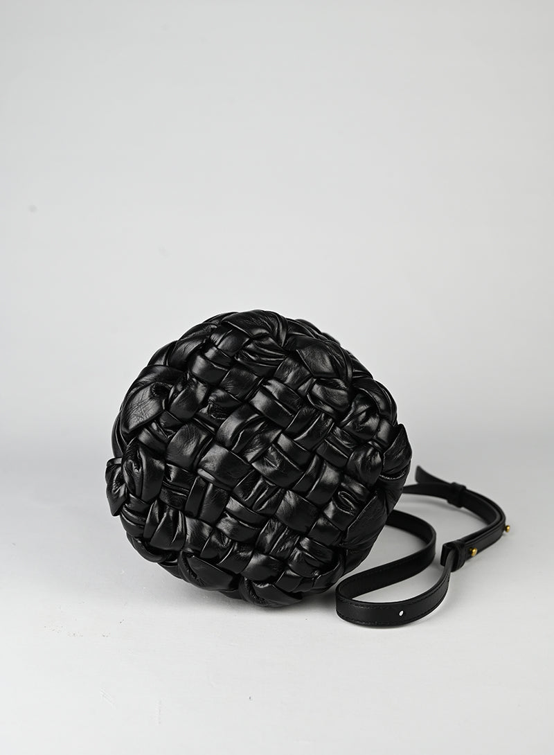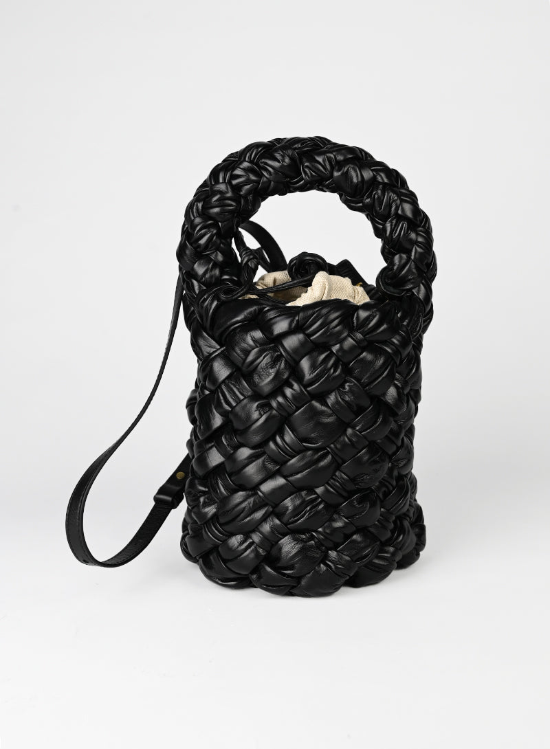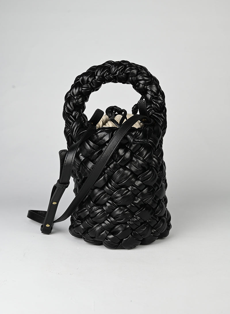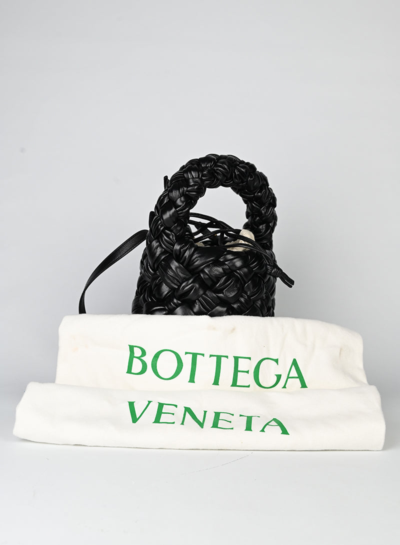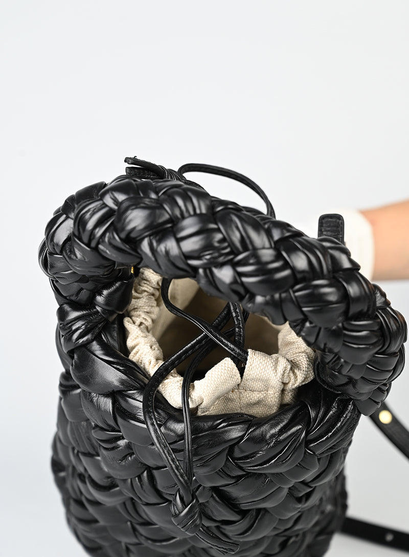 La Bottega Veneta Kalimero Bucket 2023 in pelle nera intrecciata unisce eleganza e funzionalità. Dotata di un manico e una tracolla in pelle removibile, offre versatilità nel trasporto. L’interno con chiusura a sacchetto in canvas garantisce sicurezza e stile discreto, perfetto per chi cerca un accessorio raffinato e pratico.