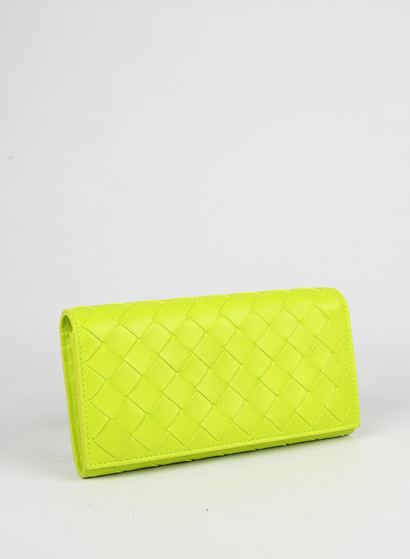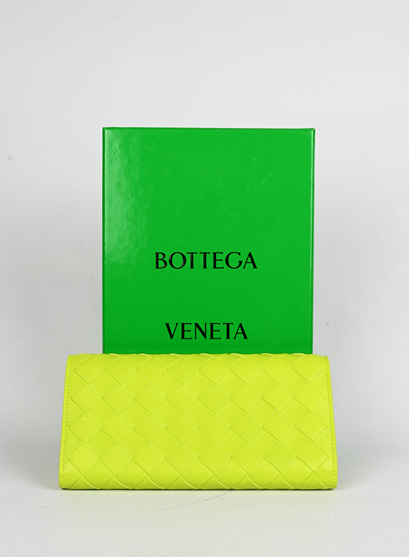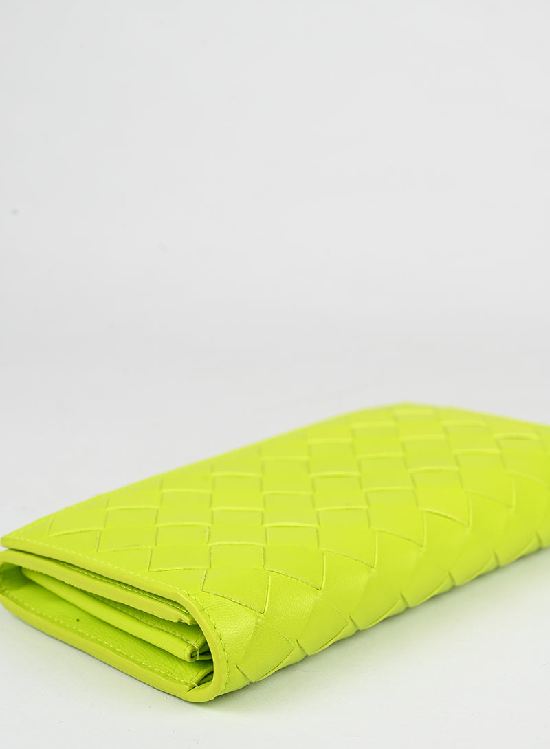 Portafogli Bottega Veneta in pelle intrecciata verde lime, un'essenza di lusso minimalista. Caratterizzato dalla celebre lavorazione intrecciata a mano, presenta una pratica chiusura click e una patta protettiva. L'interno è intelligentemente organizzato con uno scompartimento dedicato alle monete con cerniera e molteplici divisori per le carte di credito. Un accessorio sofisticato che unisce funzionalità e eleganza senza tempo.