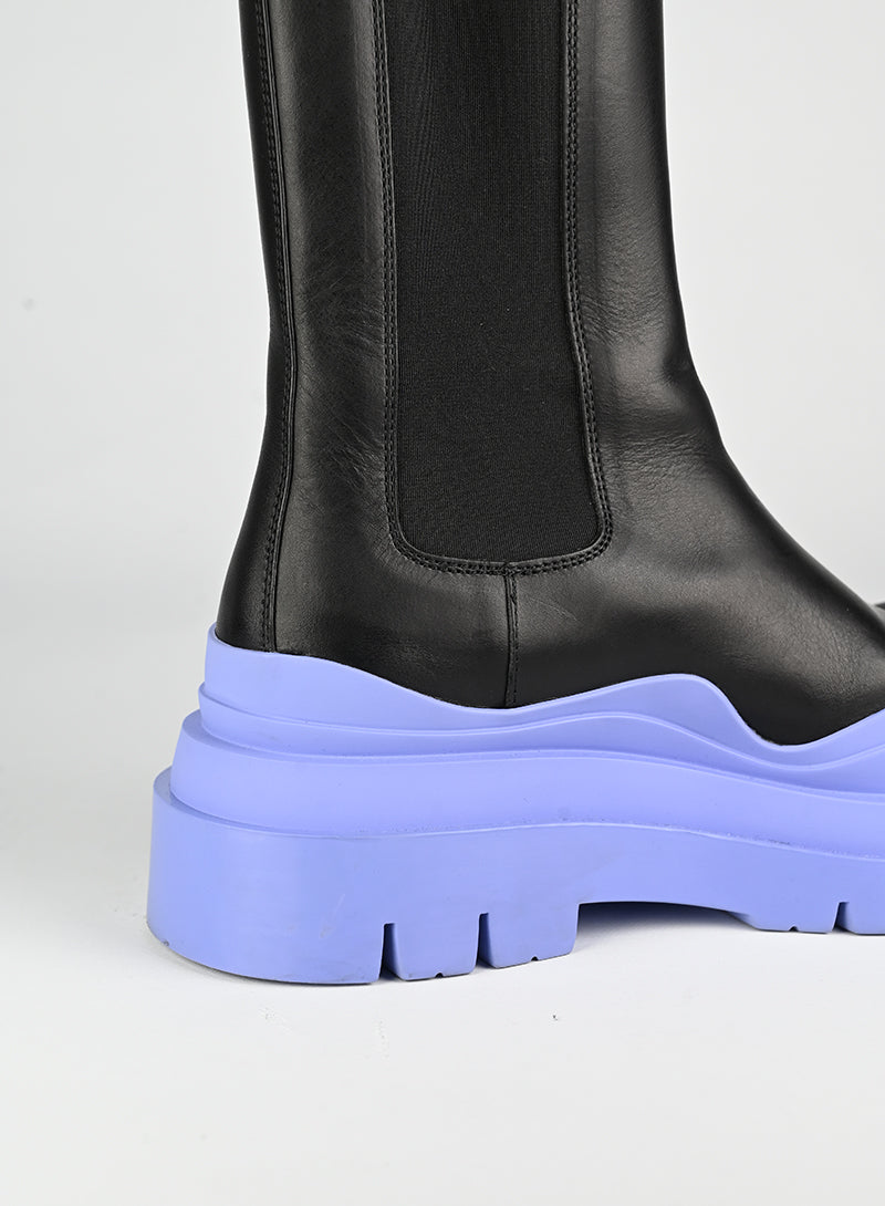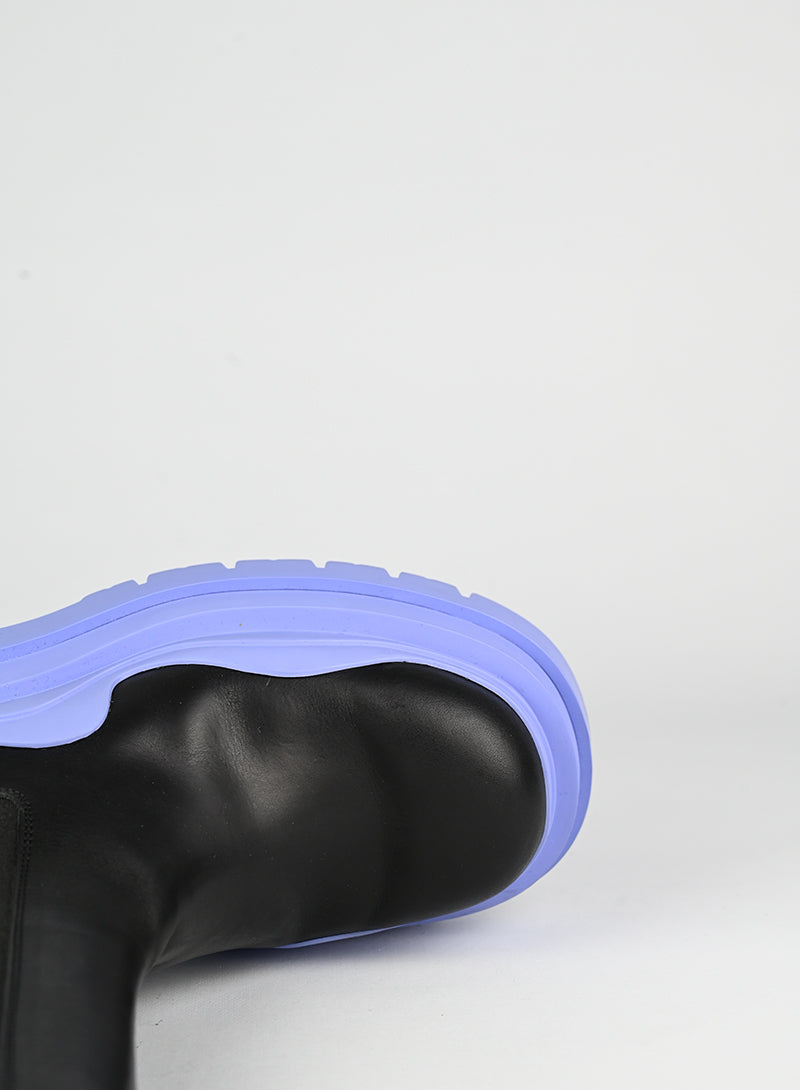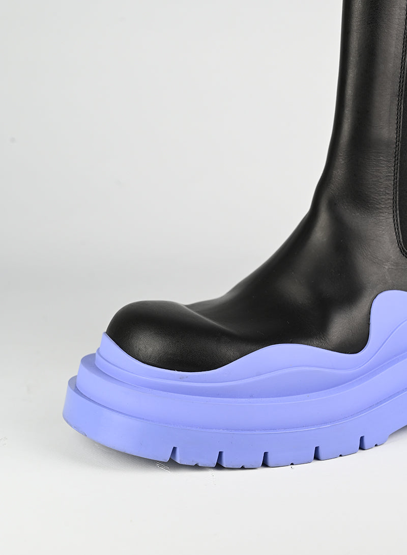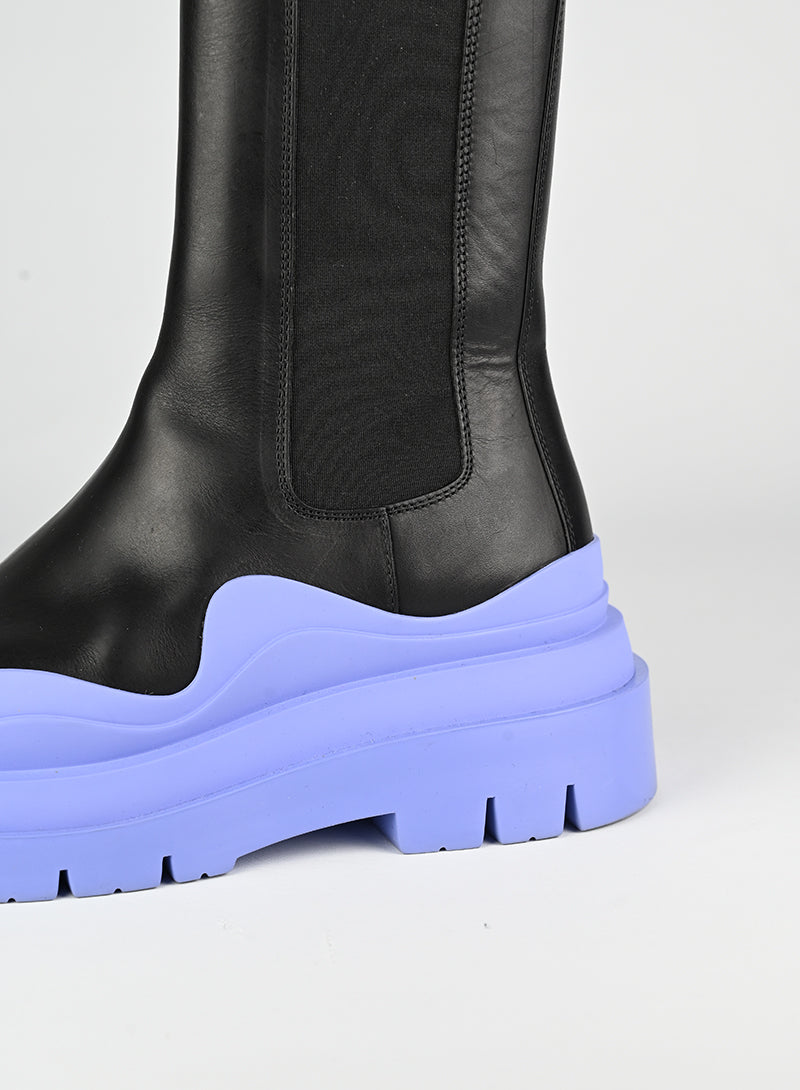 Cammina con stile in questi stivali Bottega Veneta in pelle nera, dotati di una para alta in gomma sagomata ad onde lilla per un tocco di eleganza. L'elastico alla caviglia garantisce un'ottima vestibilità e comfort. Perfetti per un look unico e sofisticato.