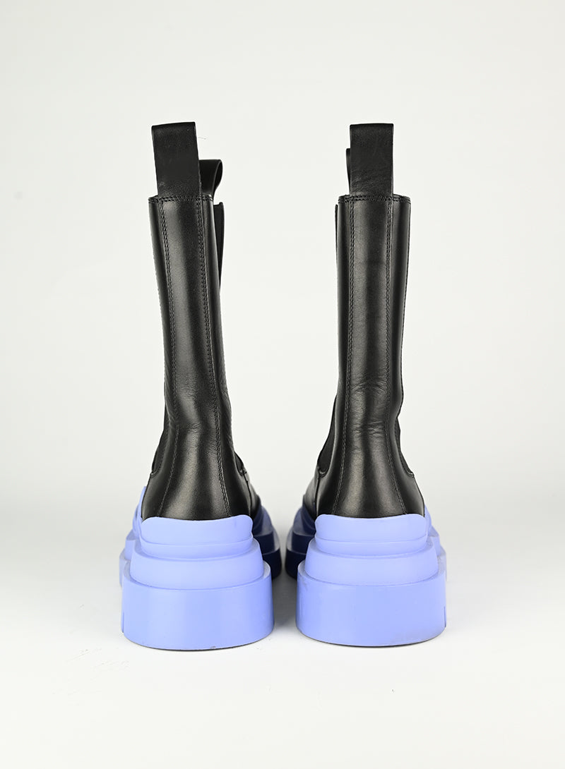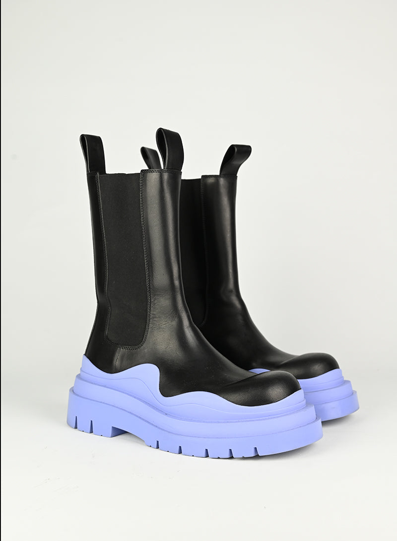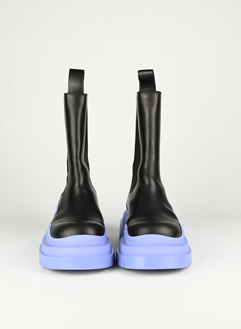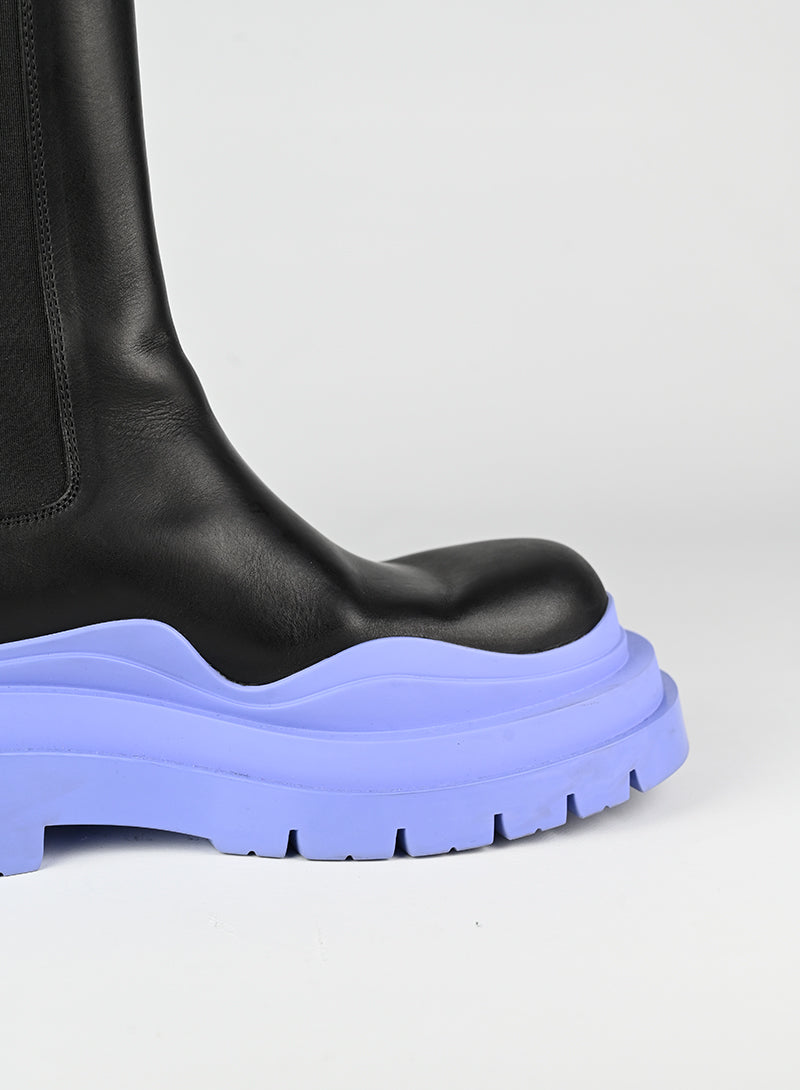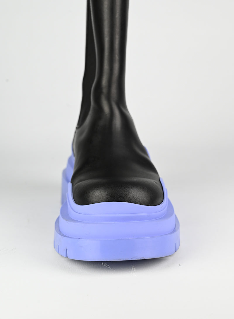Cammina con stile in questi stivali Bottega Veneta in pelle nera, dotati di una para alta in gomma sagomata ad onde lilla per un tocco di eleganza. L'elastico alla caviglia garantisce un'ottima vestibilità e comfort. Perfetti per un look unico e sofisticato.