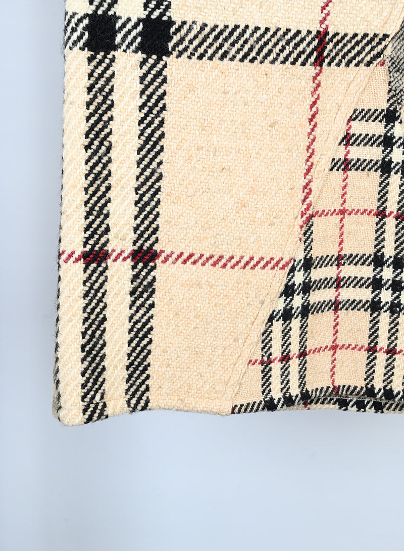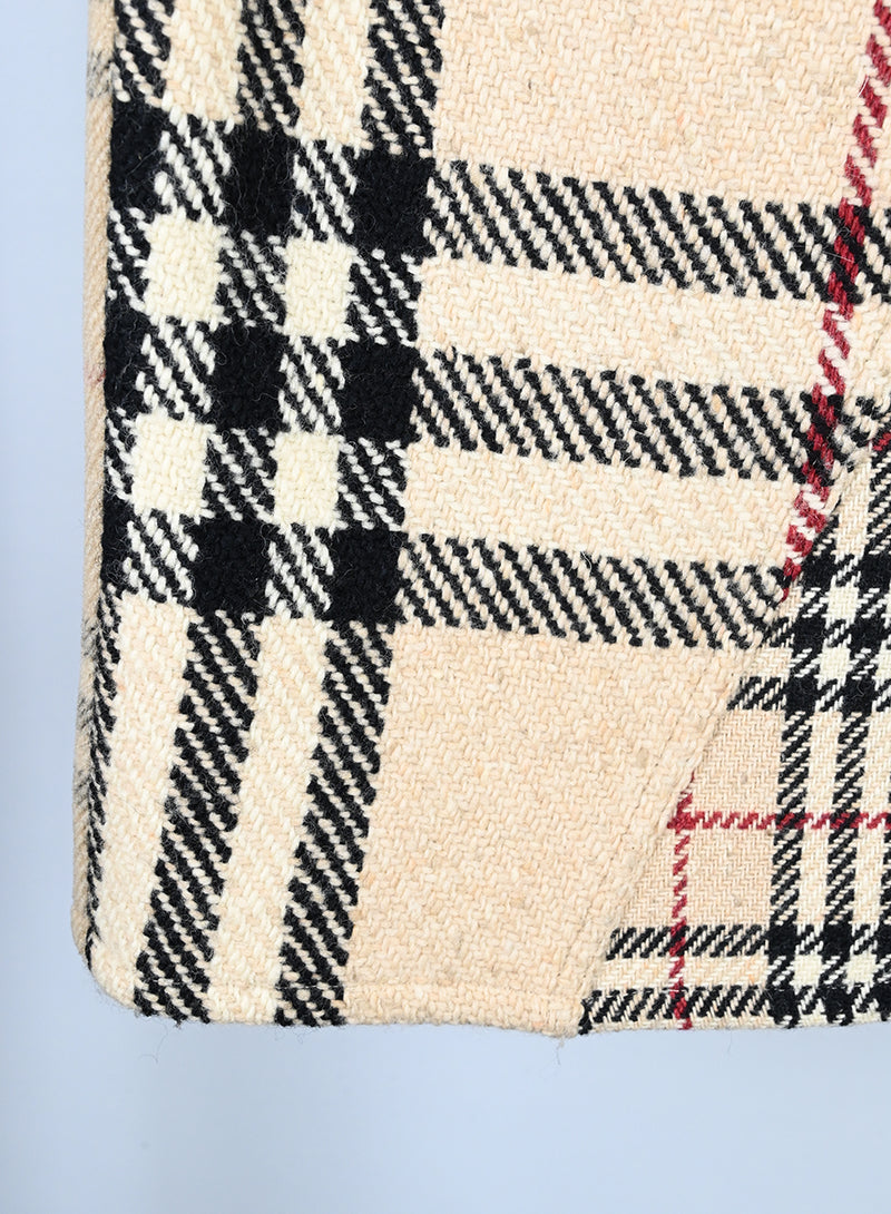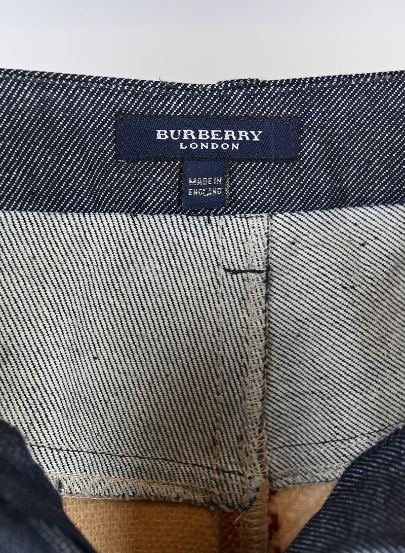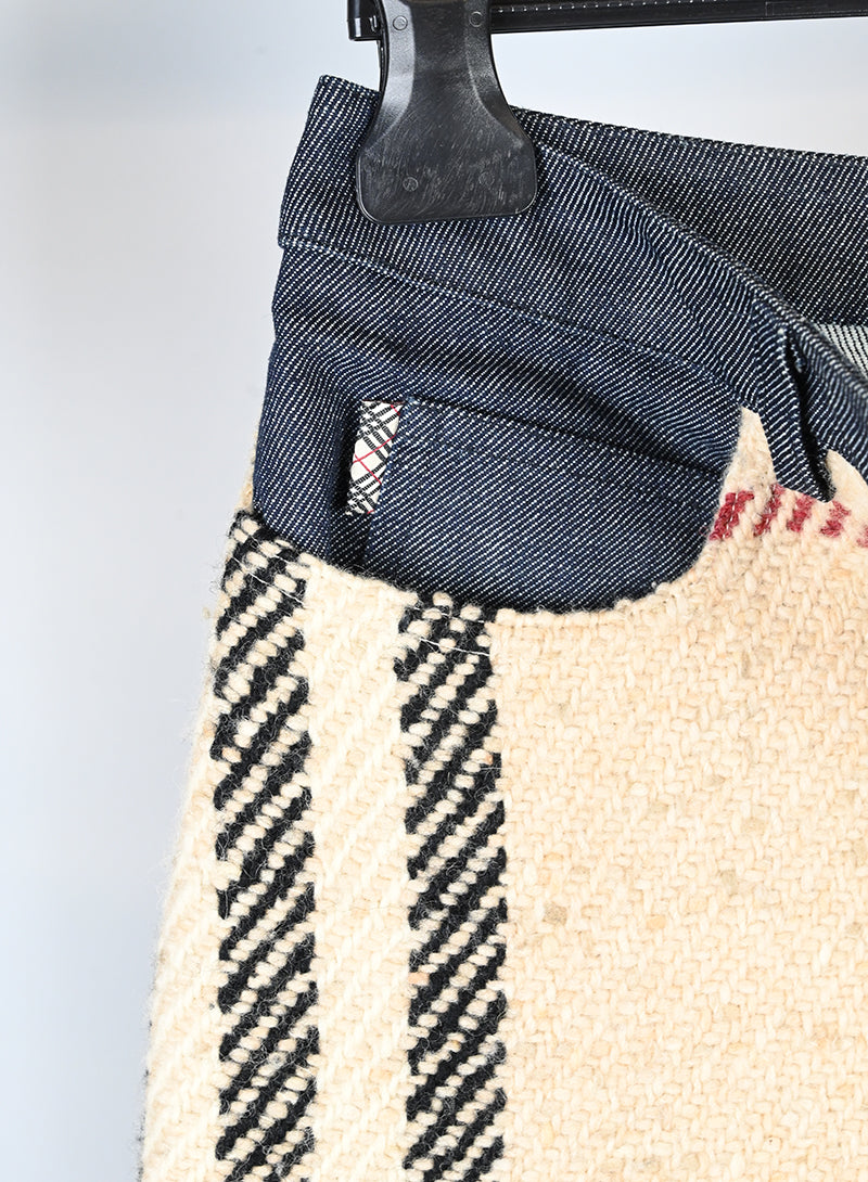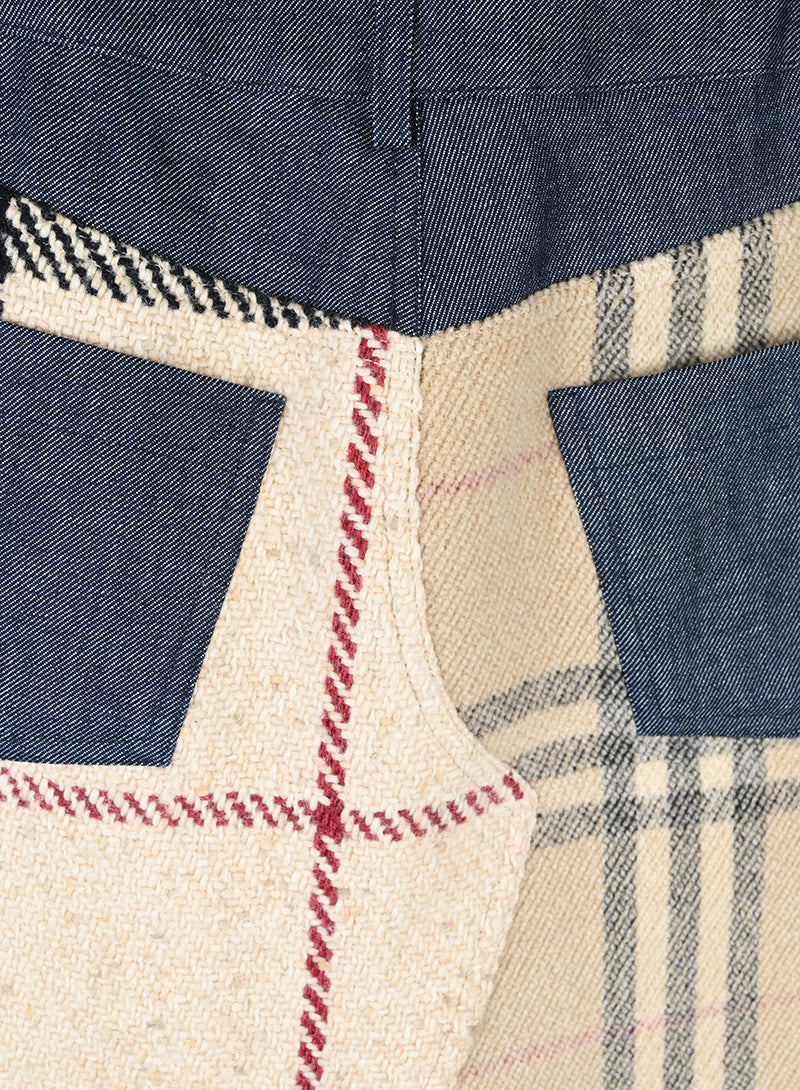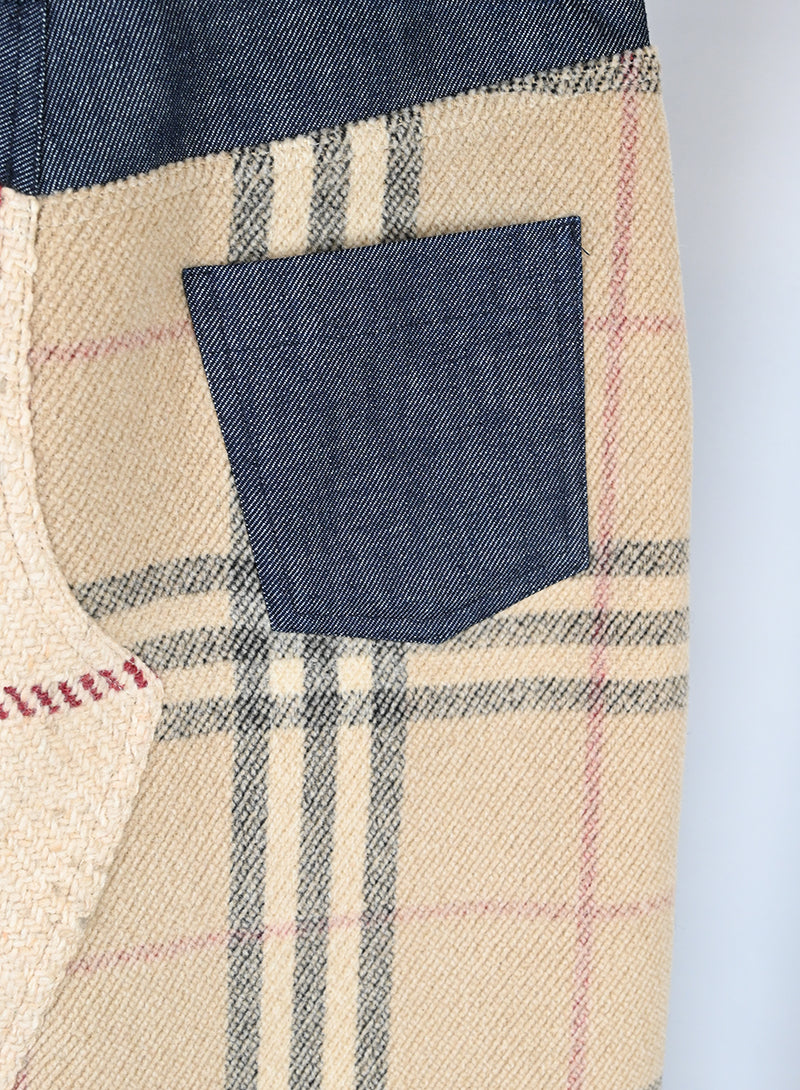 Gonna longuette Burberry in panno di lana con l'iconica fantasia check. Presenta un profilo superiore in denim, due tasche frontali integrate e due tasche in denim sul retro. Un modello unico che unisce il classico stile britannico a dettagli moderni in denim, ideale per un look sofisticato e contemporaneo.