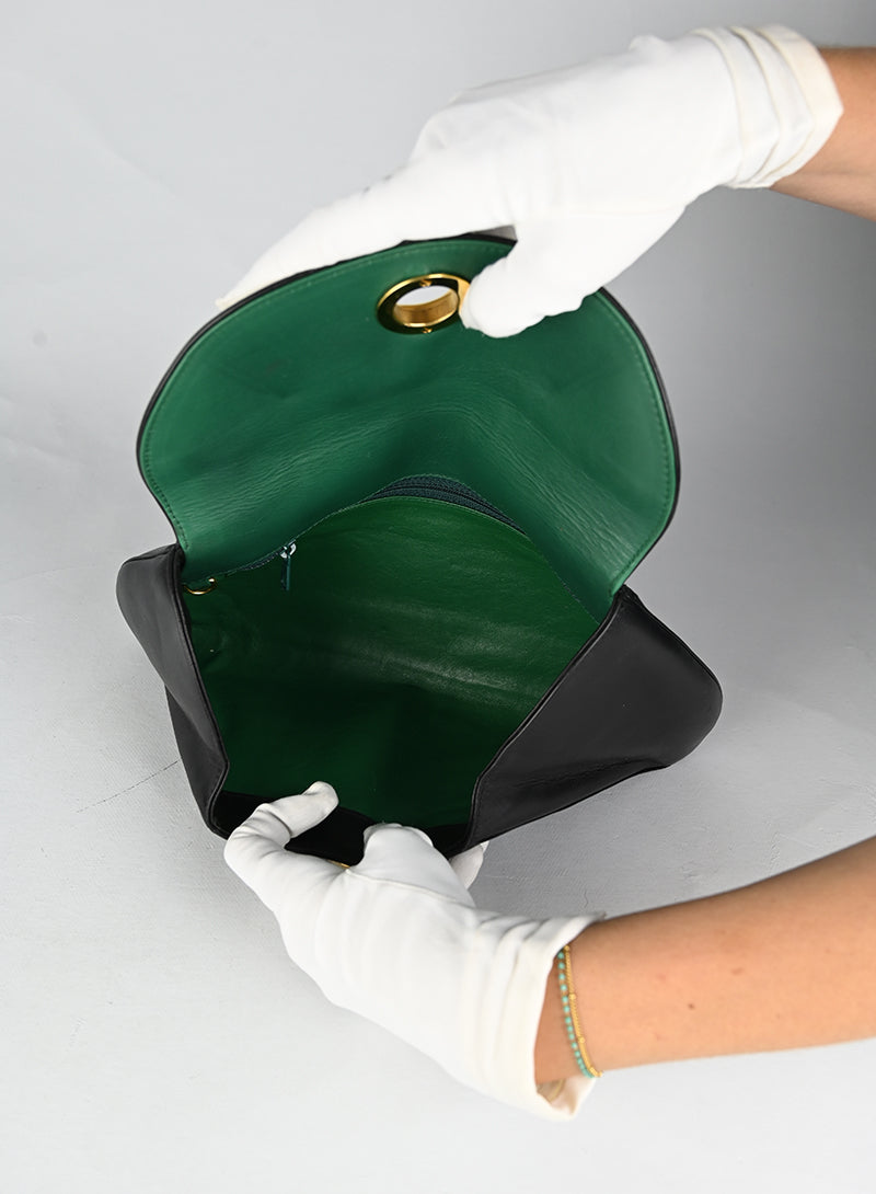 Cartier Pochette in pelle nera con chiusura a logo Pantera dorata e patta. L'interno presenta un elegante scompartimento in pelle verde e una pratica taschina con zip. Un accessorio di lusso che unisce funzionalità e raffinatezza, perfetto per chi apprezza i dettagli esclusivi del design Cartier.