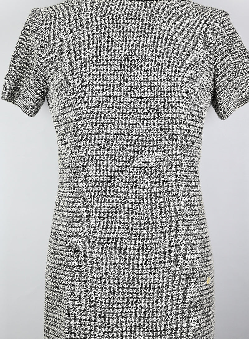 Esalta la tua eleganza con l'Abito tubino bianco nero Chanel. Realizzato in morbido cotone bouclè, presenta maniche corte e un raffinato bordo in gros panna. La chiusura con zip posteriore aggiunge un tocco di modernità, mentre il piccolo logo su una placca trasparente svela il tuo gusto per il lusso senza eguali.