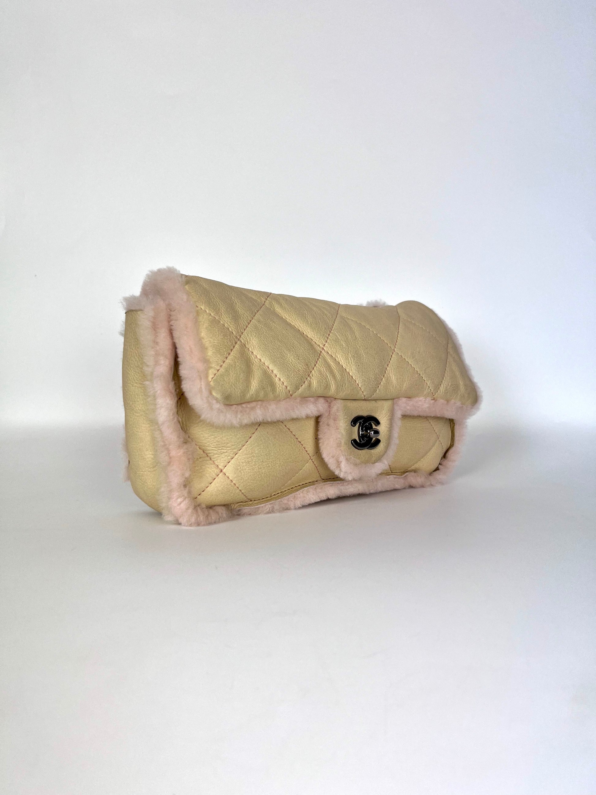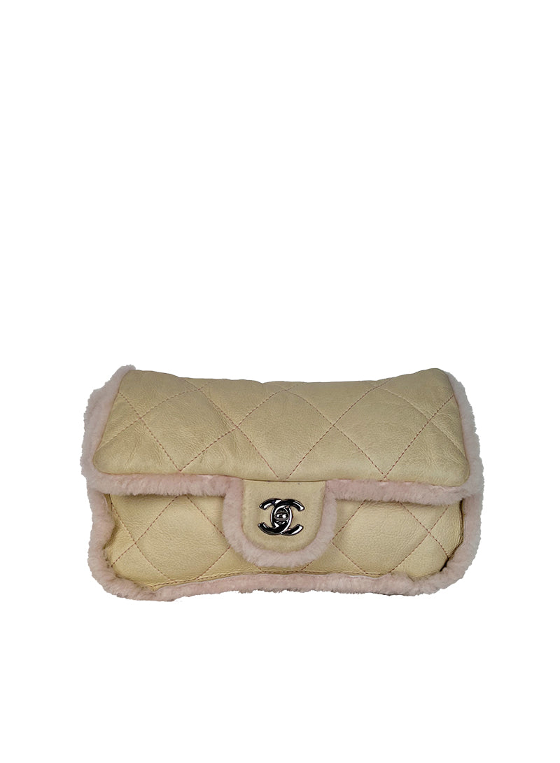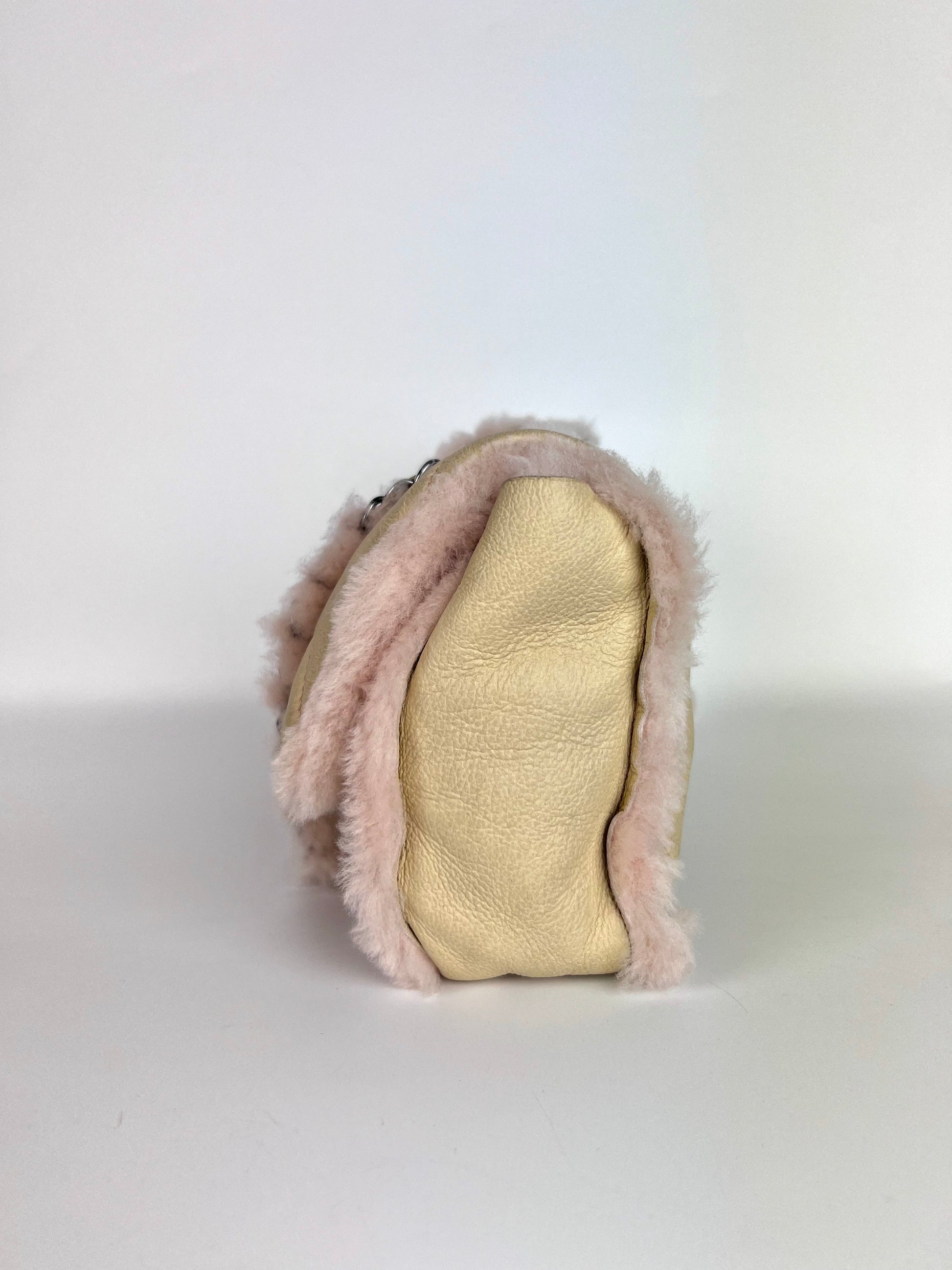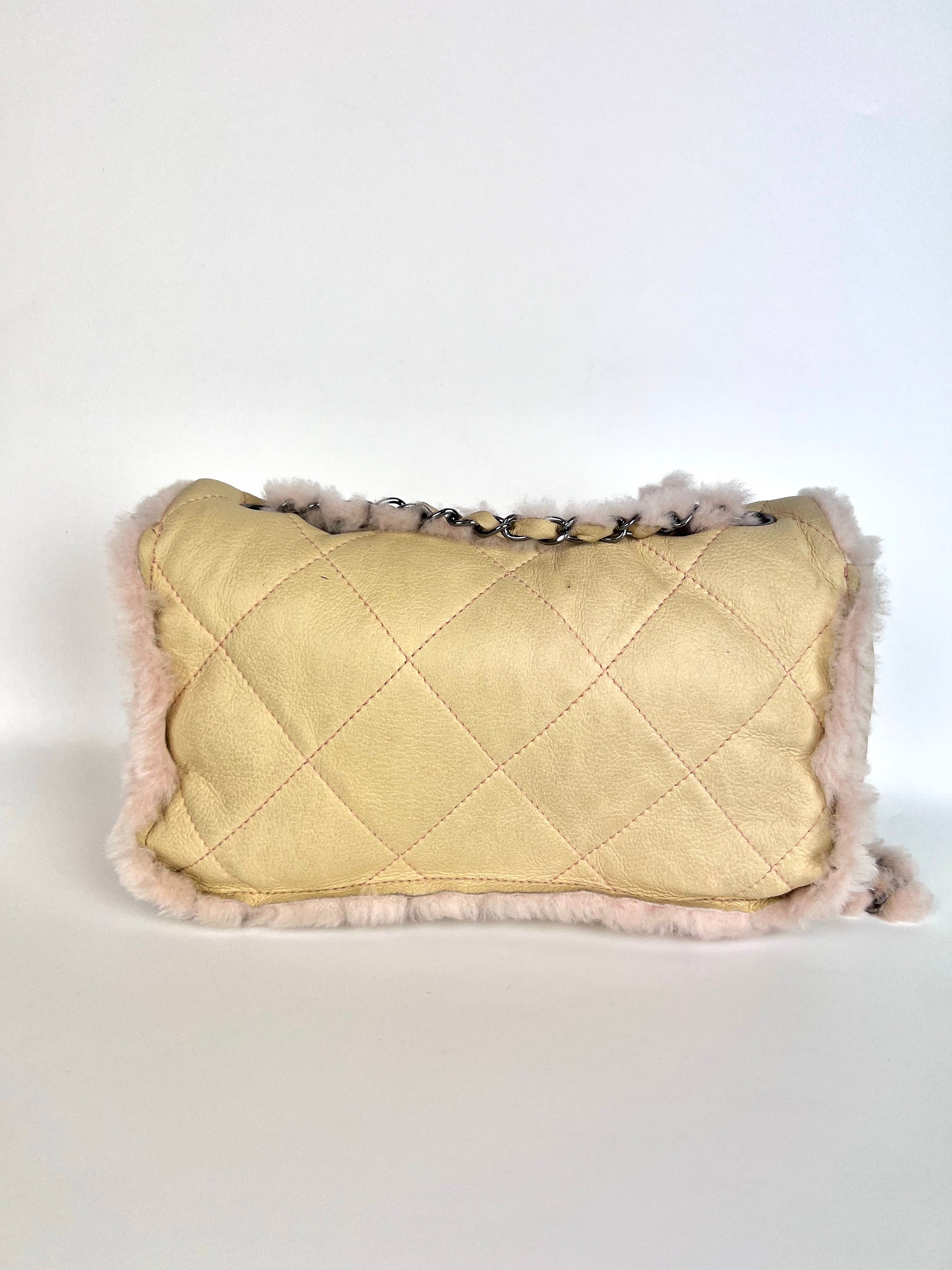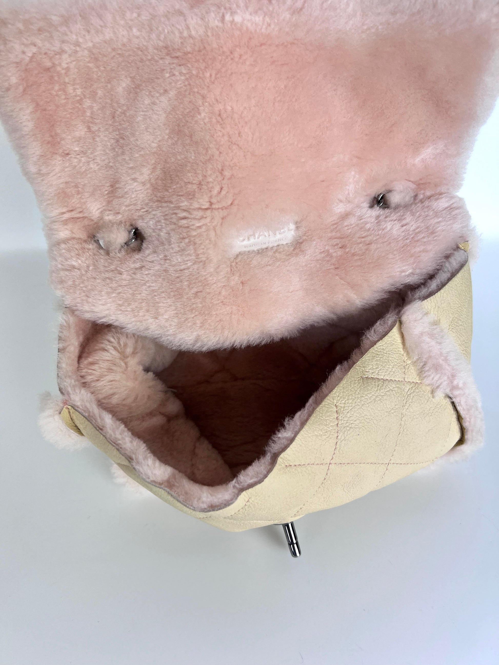 Borsa Chanel 2.55 in pelle beige profili montone shirling rosa. Manico shirling rosa intrecciato con catena argento. Chiusura patta frontale con logo CC argento, interno con pelo rosa.