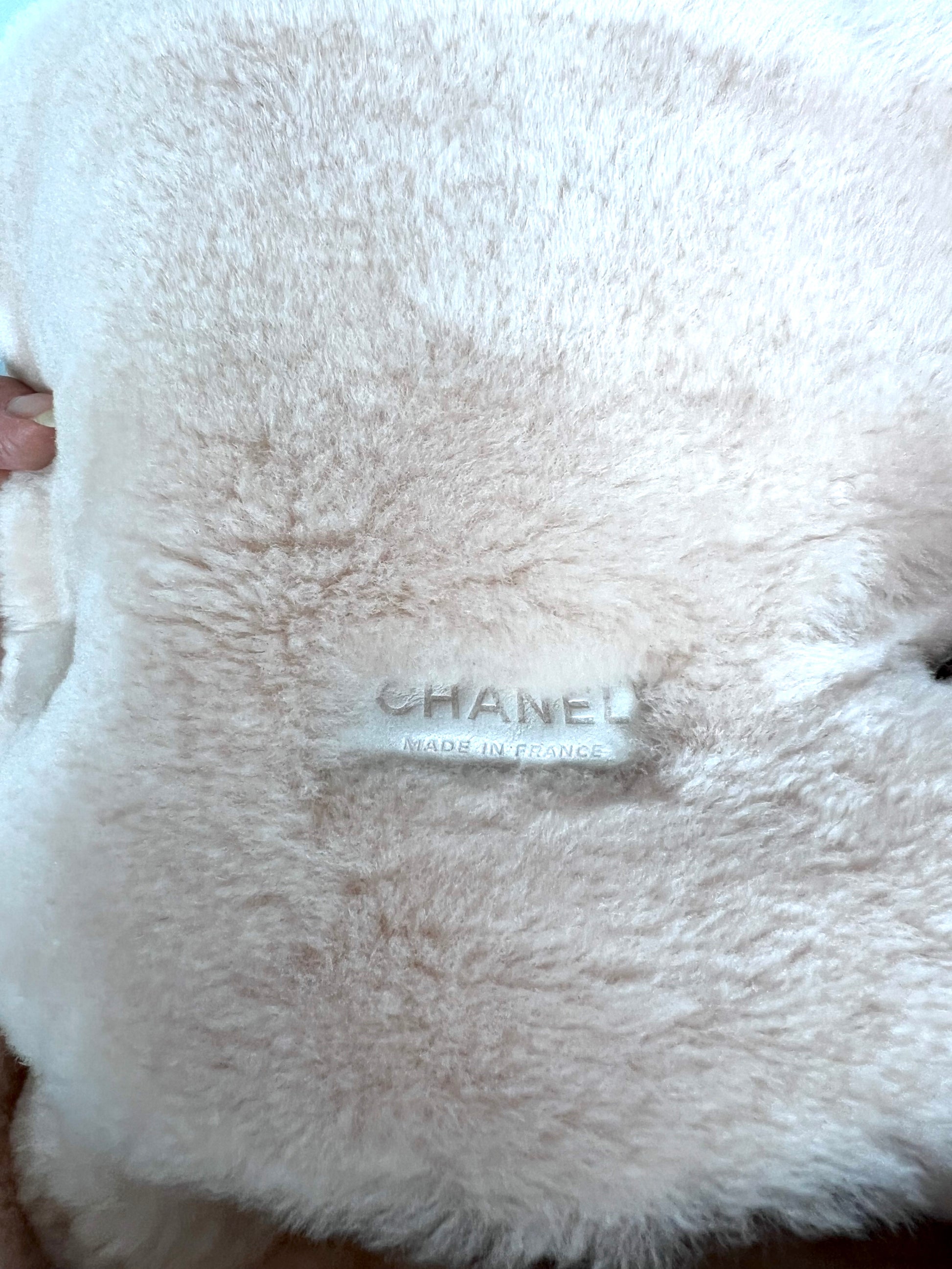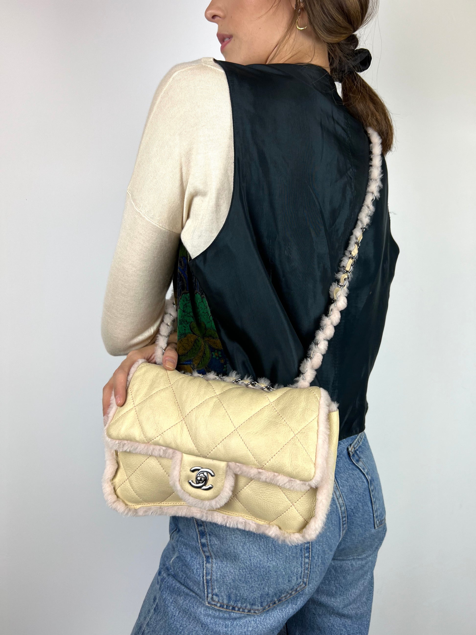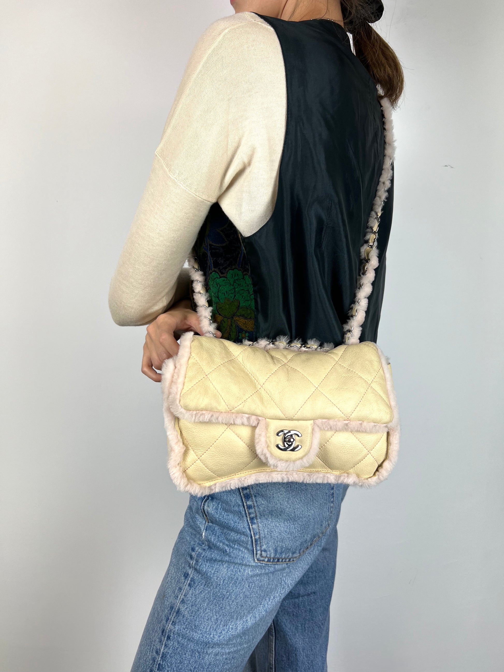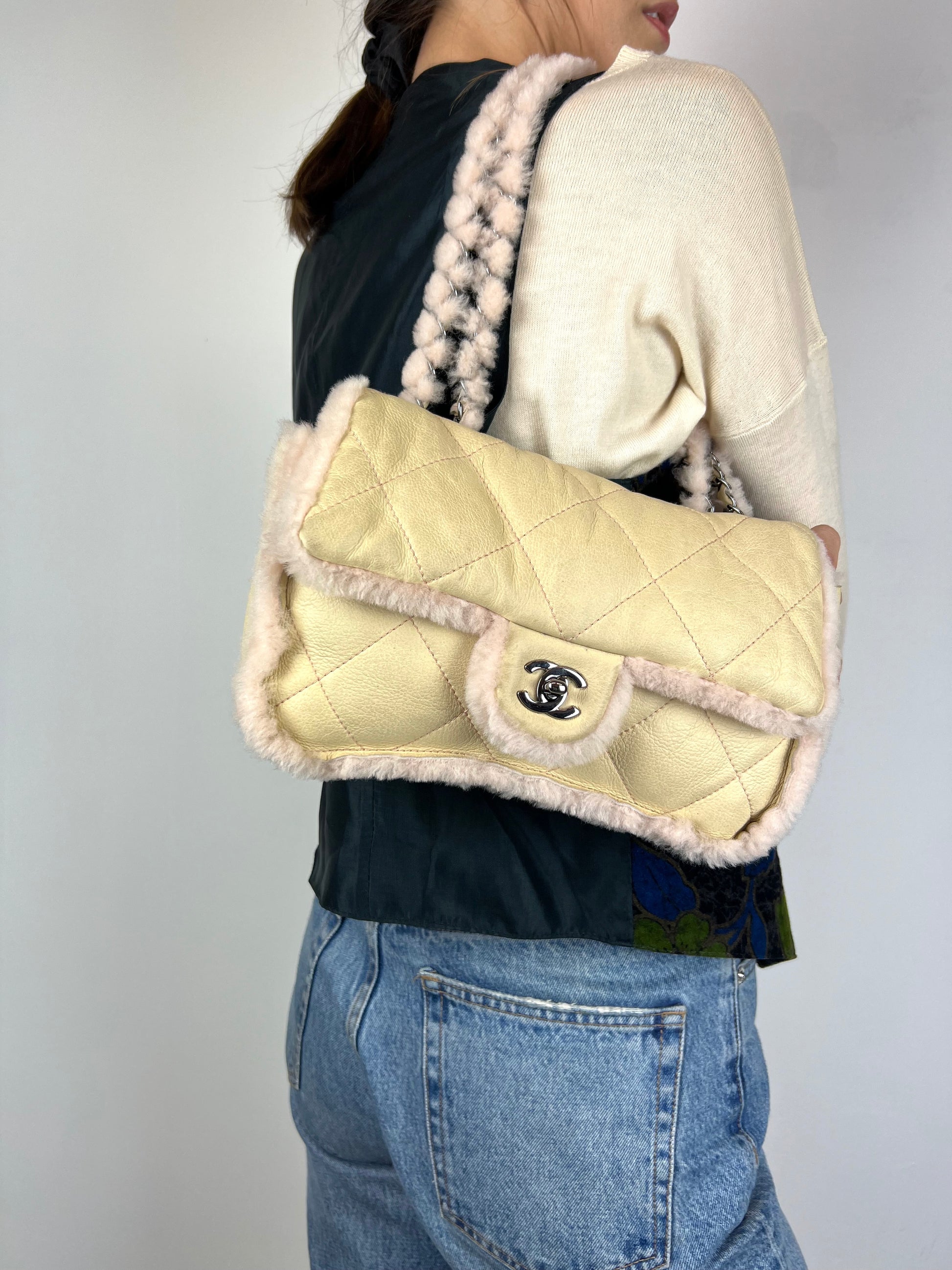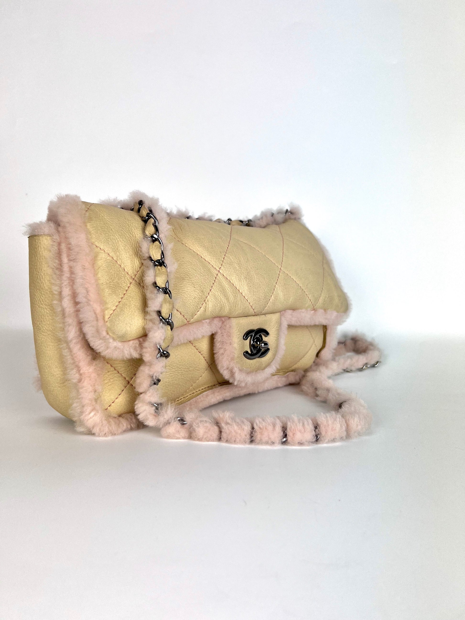 Borsa Chanel 2.55 in pelle beige profili montone shirling rosa. Manico shirling rosa intrecciato con catena argento. Chiusura patta frontale con logo CC argento, interno con pelo rosa.