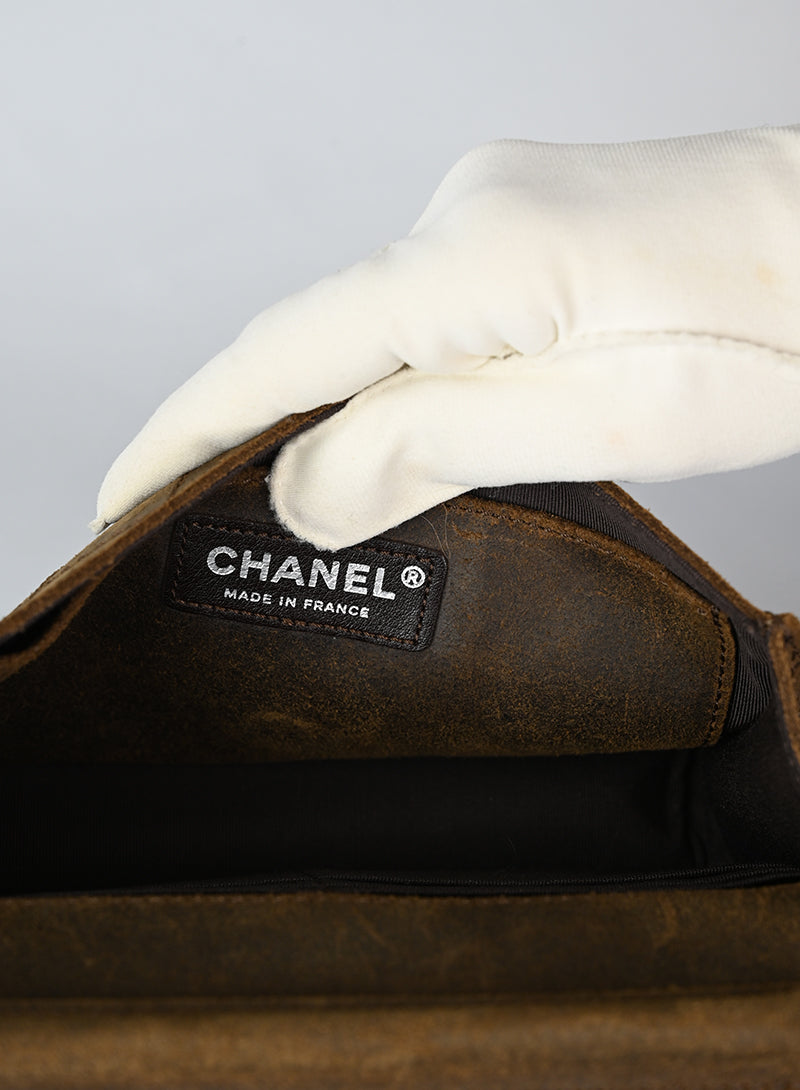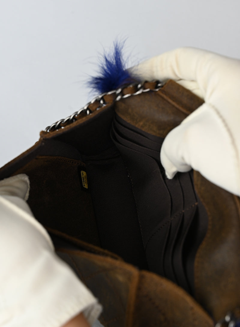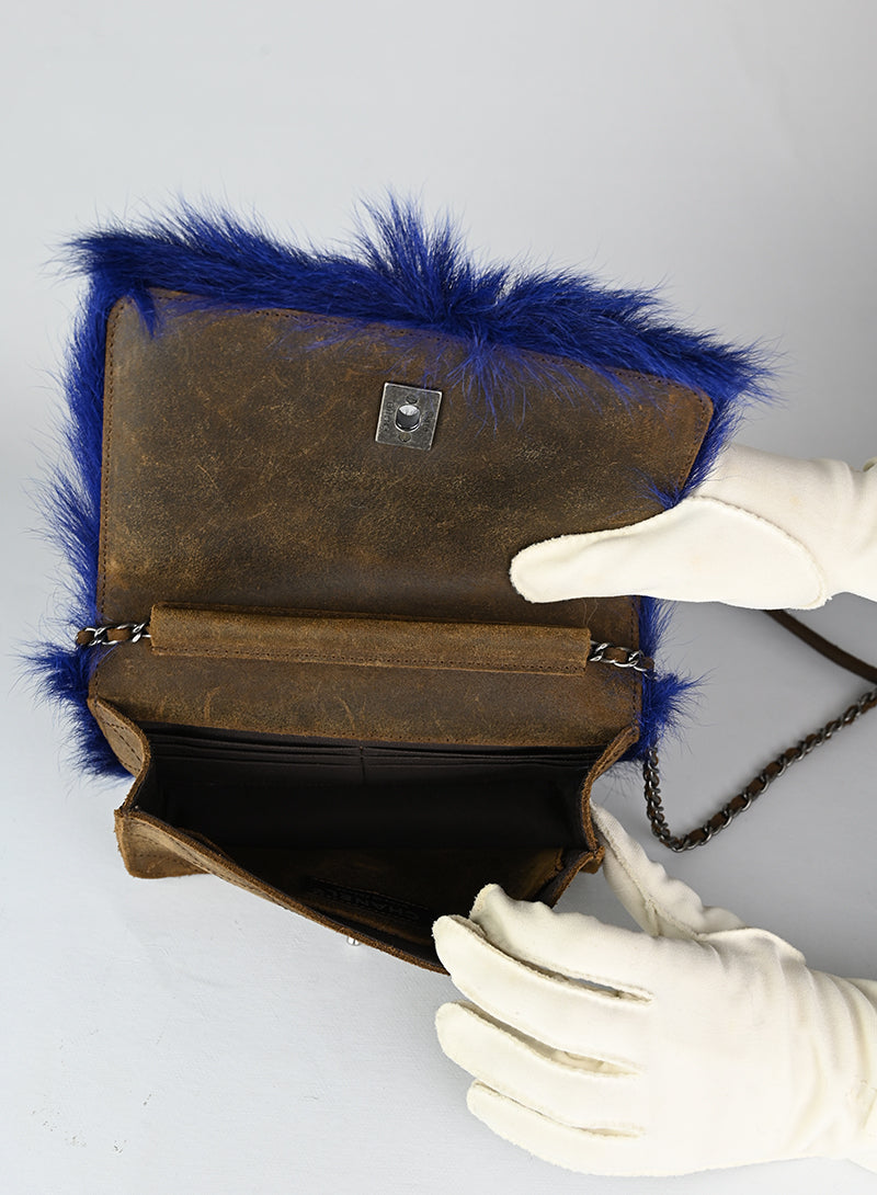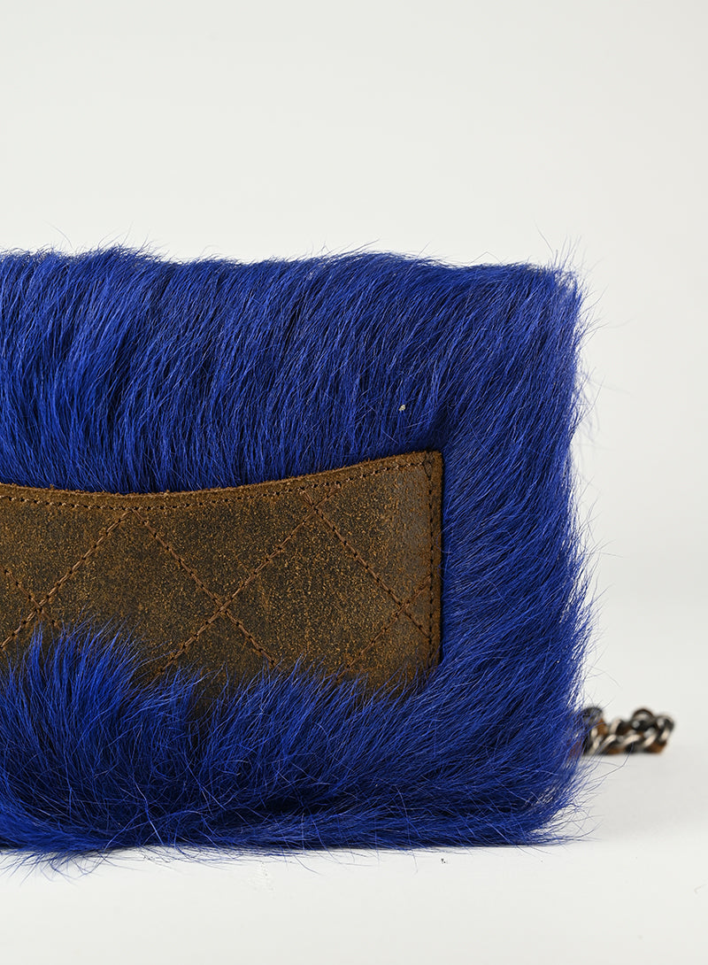 Aggiungi un tocco di lusso al tuo look con la Borsa a tracolla Chanel in Fur bluette. Realizzata in morbida mongolia e con dettagli in argento brunito, questa borsina presenta uno scompartimento interno marrone con tasche per carte e una tasca posteriore. Perfetta per un look sofisticato e alla moda.