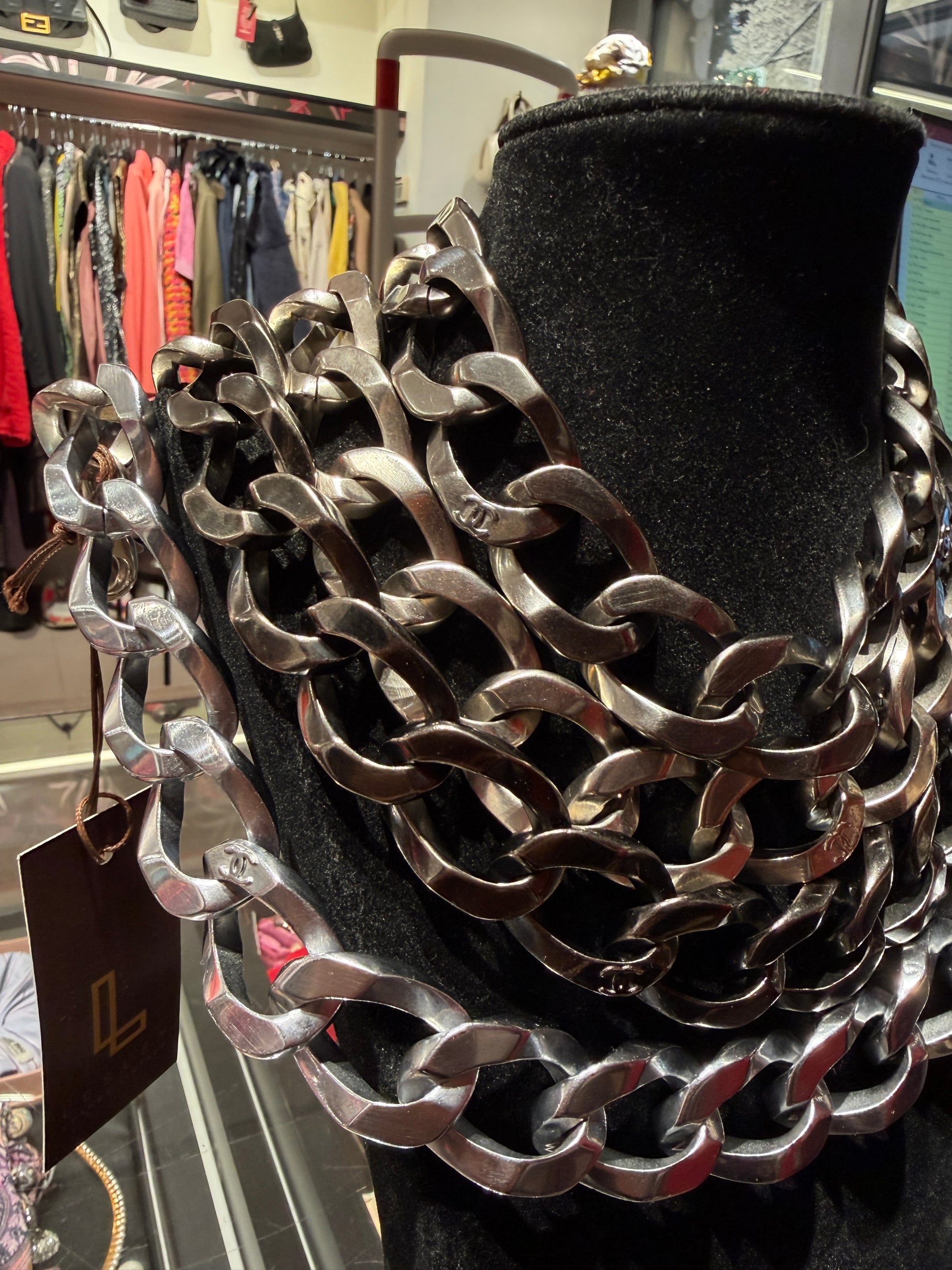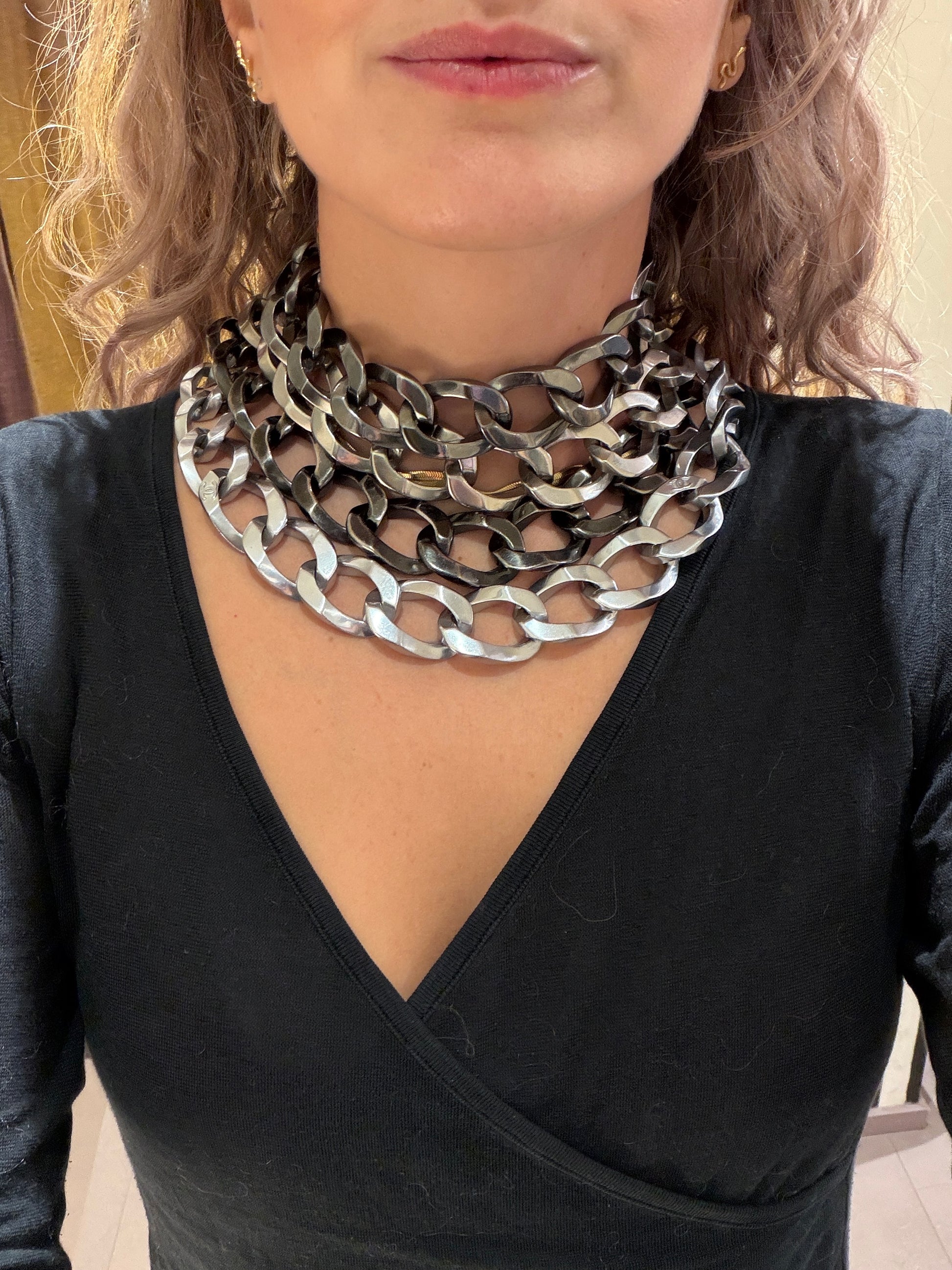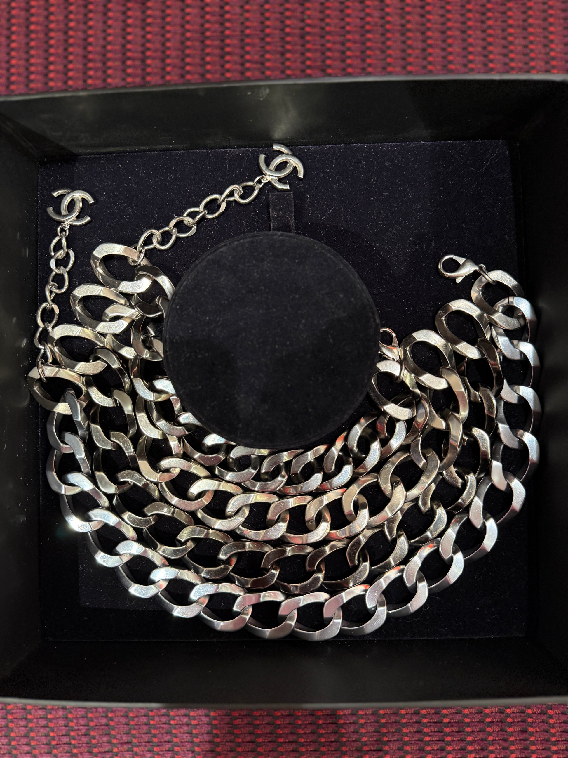 Chanel collana 4 catene in metallo argento e brunito. Presenta due chiusure regolabili.