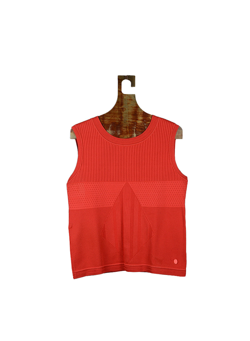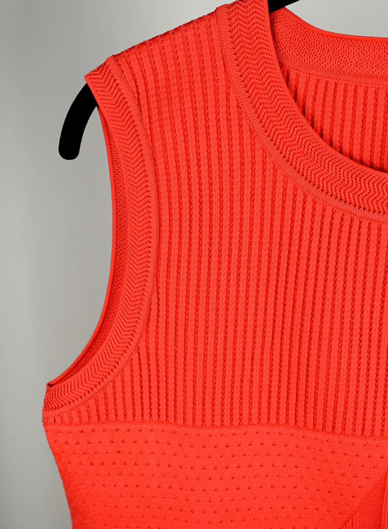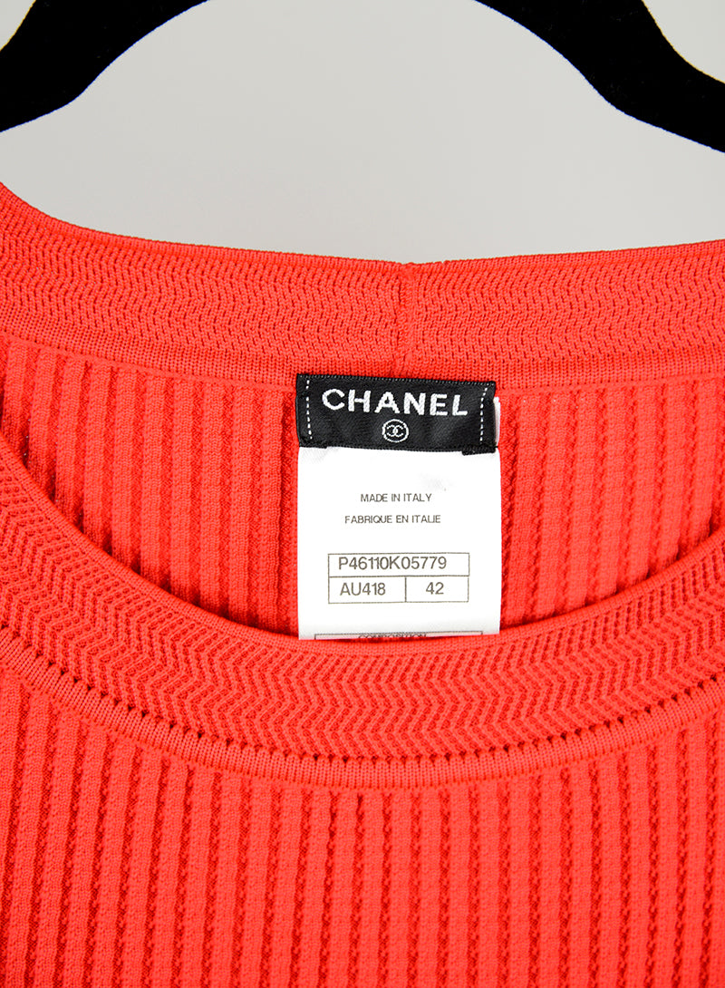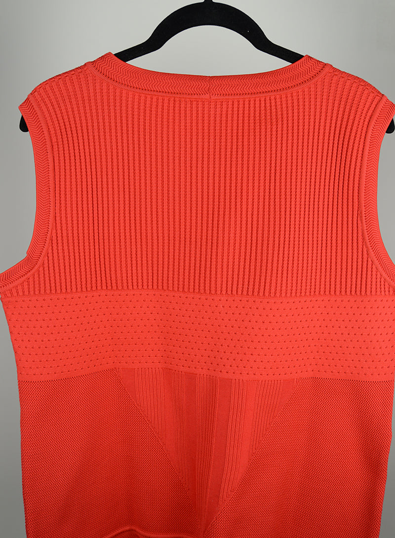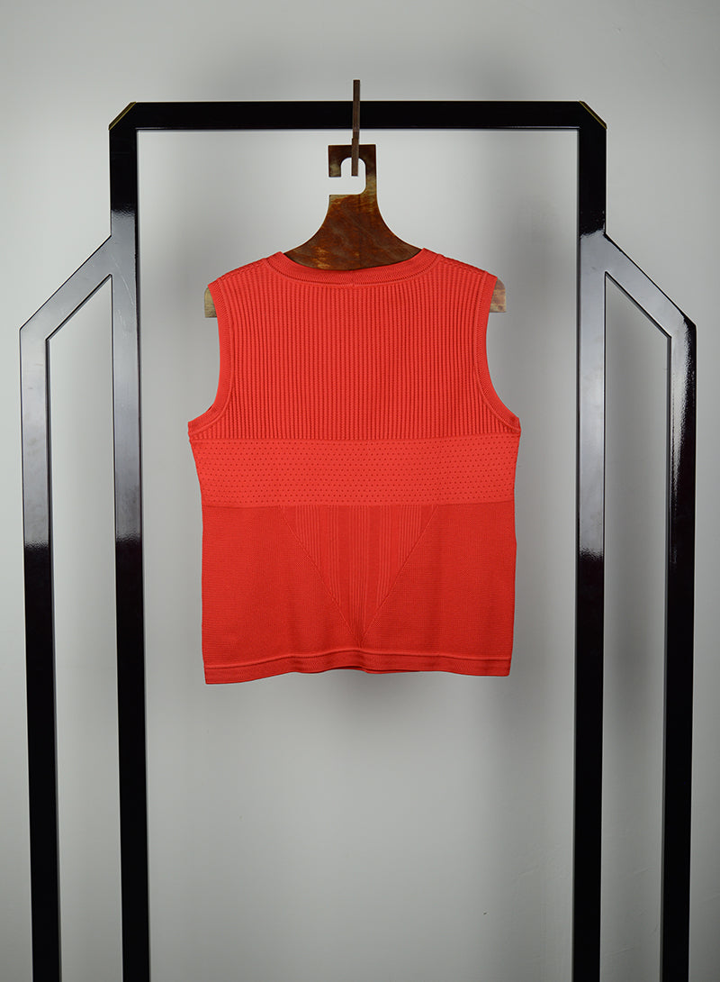 Esalta il tuo guardaroba con il Gilet lavorato Chanel in rosso. Con un'intrigante lavorazione tridimensionale sul davanti e sul retro, questo gilet aggiunge un tocco di eleganza e sofisticazione al tuo stile. Perfetto per l'abbigliamento formale o informale, questo capo unico è sicuramente un must-have per chi ama il lusso.
