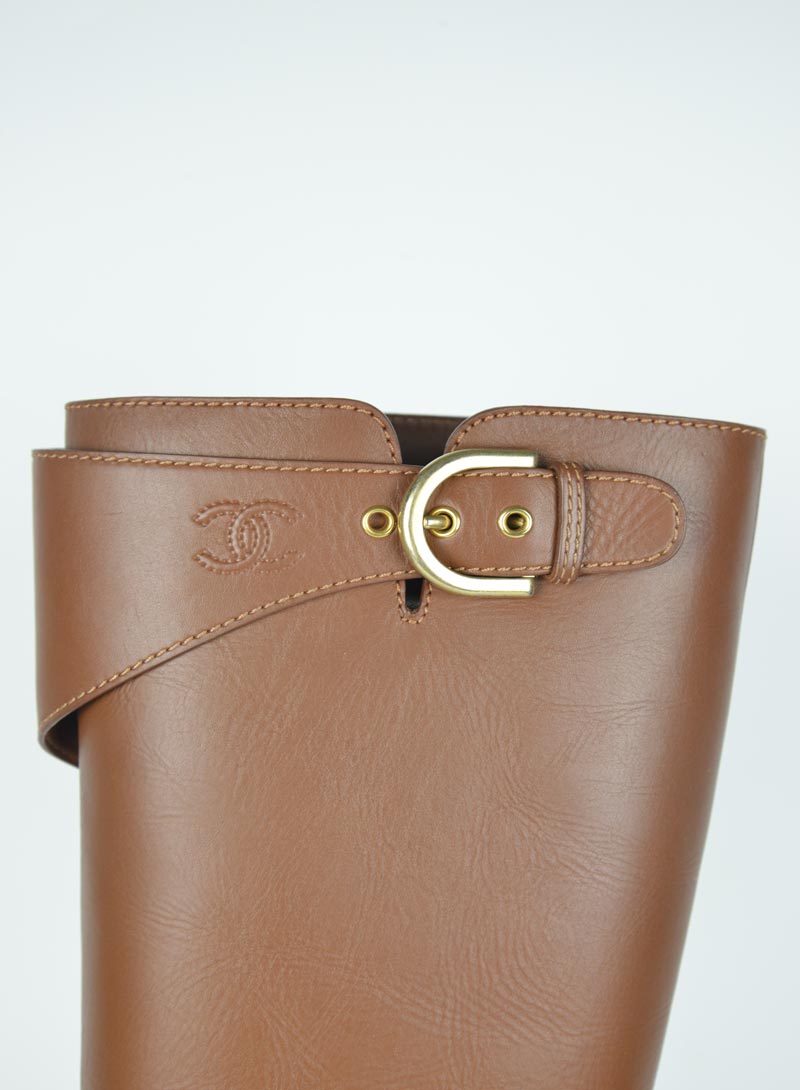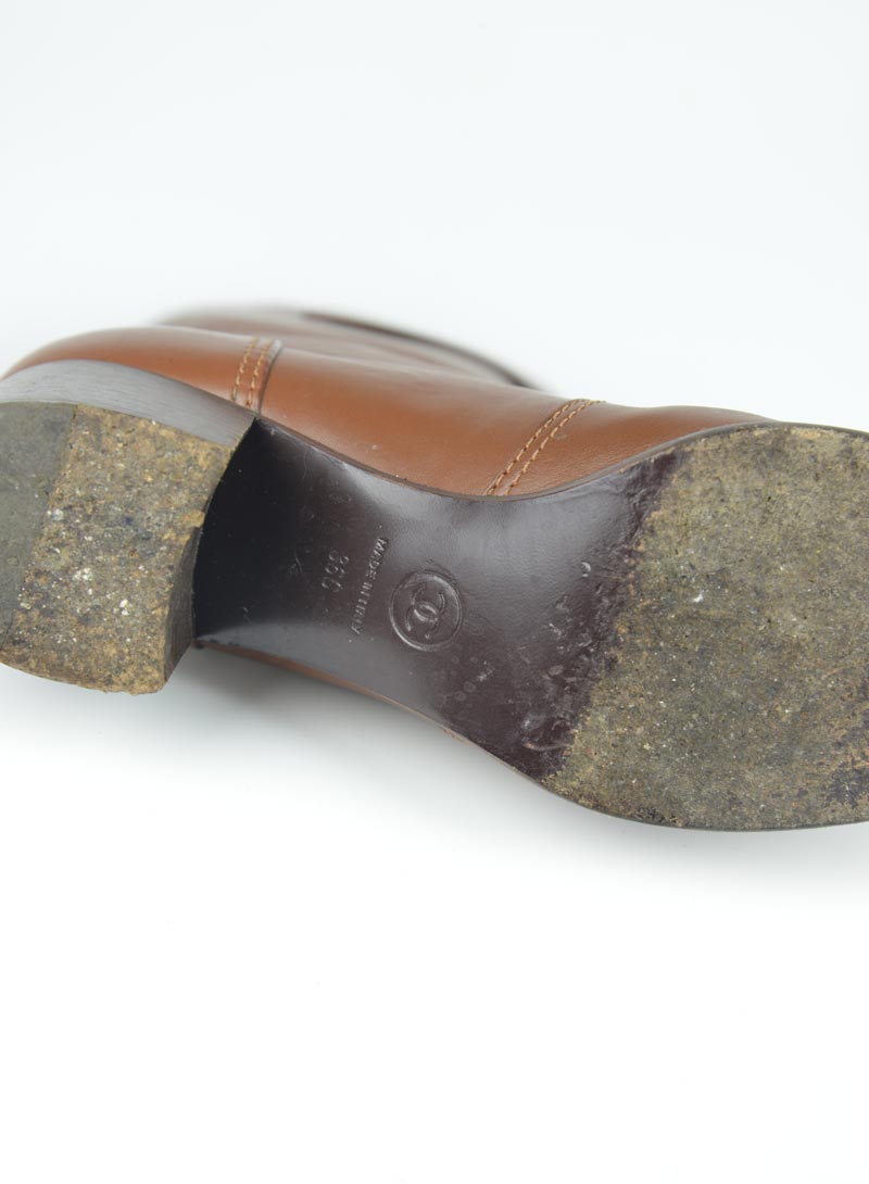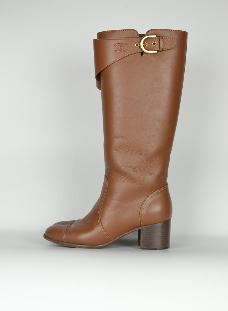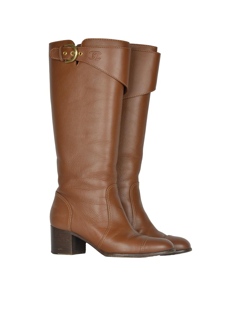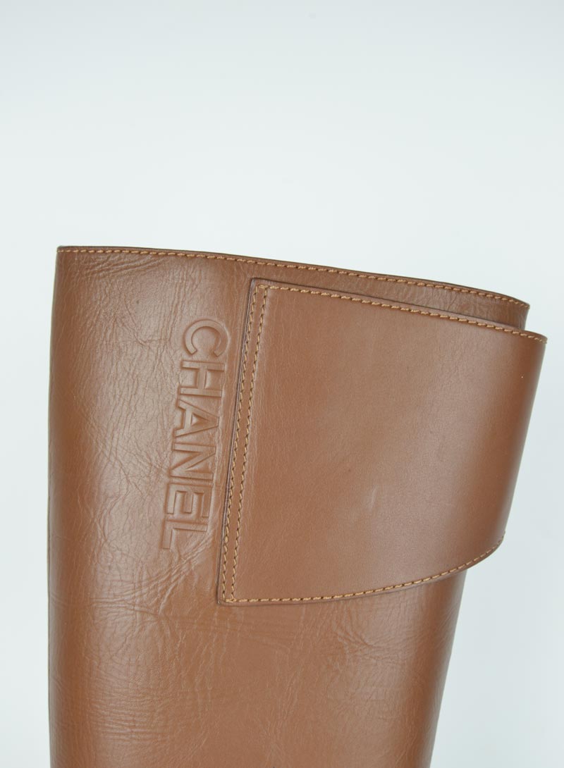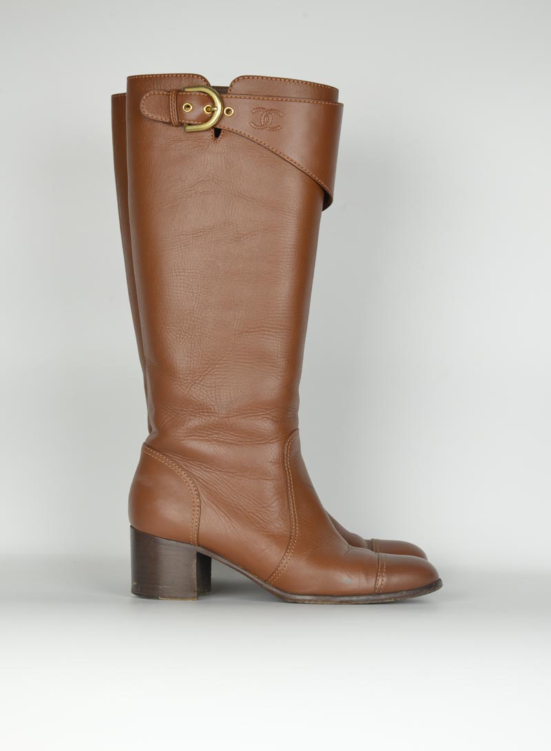 I lussuosi stivali di Chanel in pelle cognac sono l'epitome dello stile di vita chic. La punta tonda con impunture iconiche, l'inserto logato e la fibbia dorata accentuano l'eleganza di questi stivali, rendendoli perfetti per i giorni di festa. Lasciatevi trasportare nella raffinatezza del brand con questi stivali di classe.