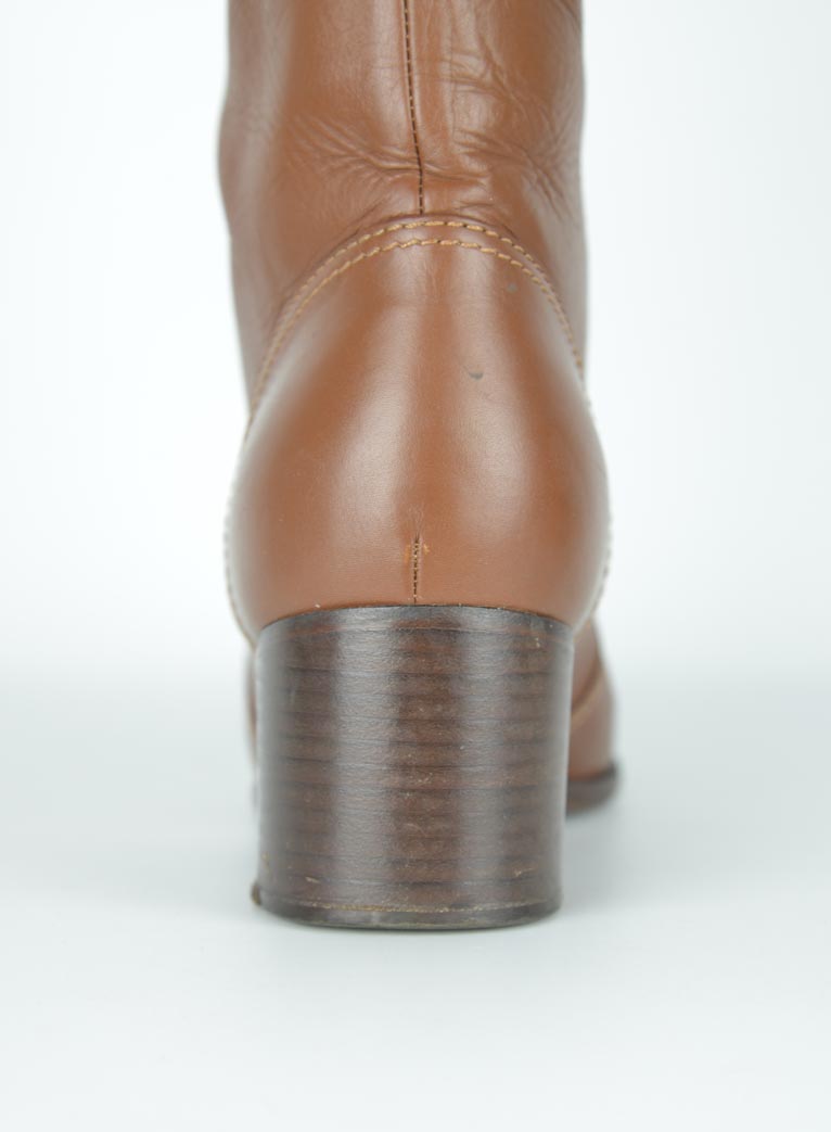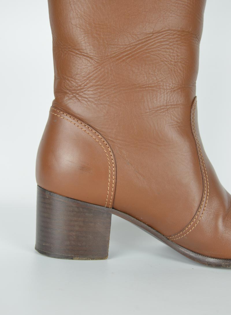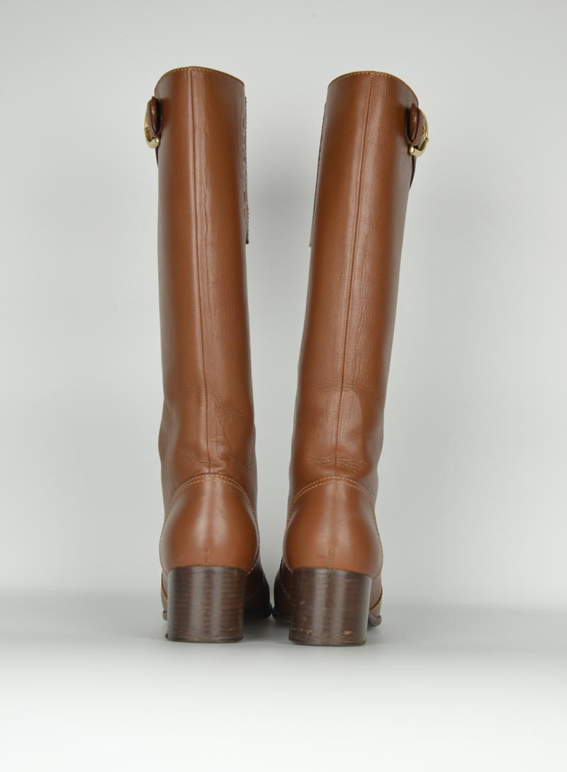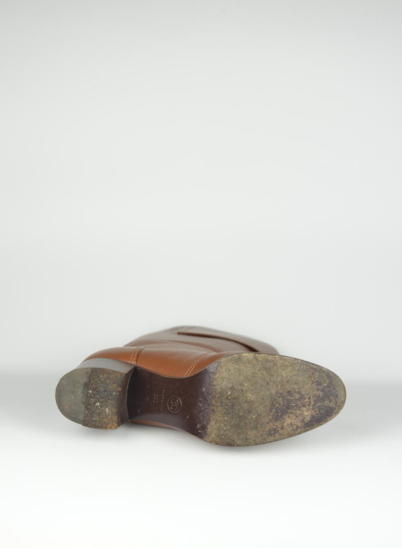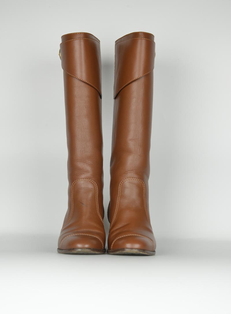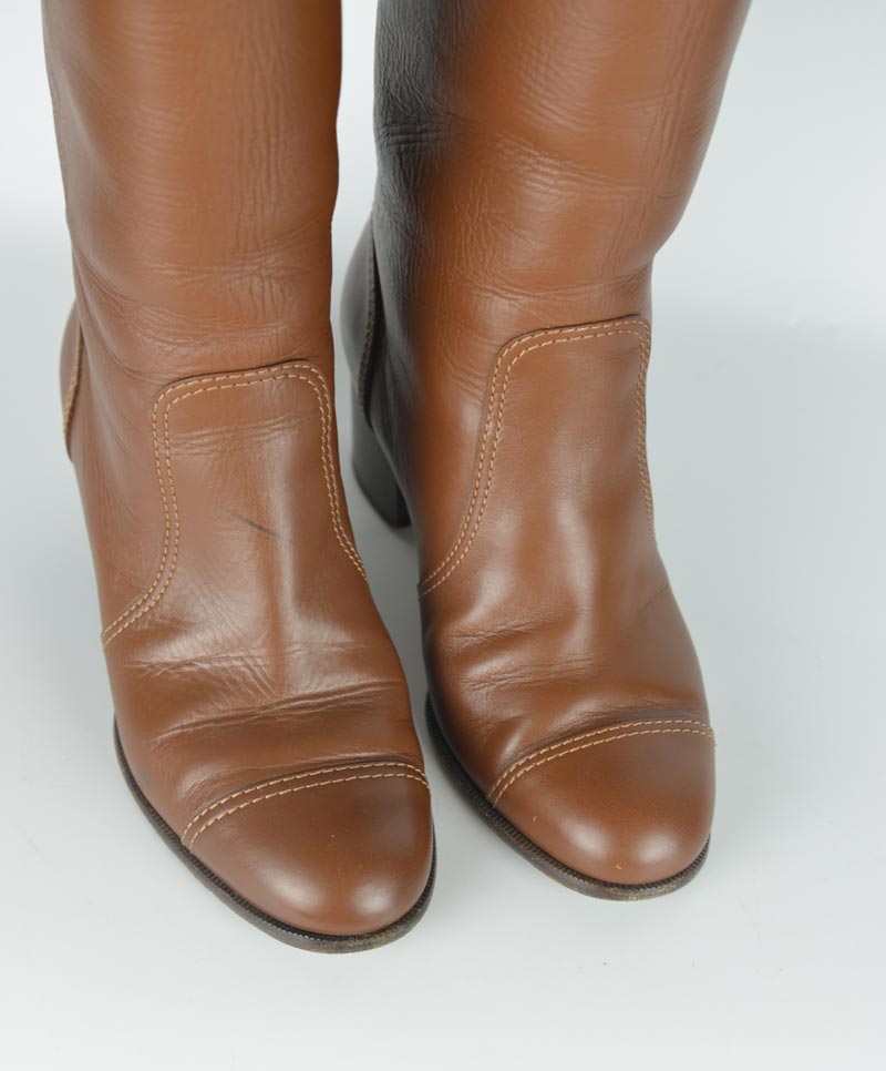I lussuosi stivali di Chanel in pelle cognac sono l'epitome dello stile di vita chic. La punta tonda con impunture iconiche, l'inserto logato e la fibbia dorata accentuano l'eleganza di questi stivali, rendendoli perfetti per i giorni di festa. Lasciatevi trasportare nella raffinatezza del brand con questi stivali di classe.