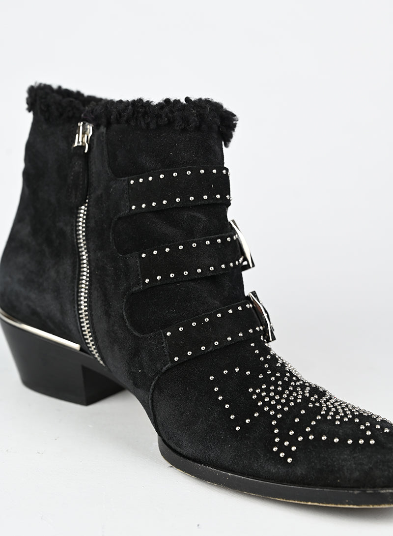 Eleganti stivaletti Chloè modello Susanna realizzati in pregiato suede nero. Caratterizzati da tre cinturini regolabili con fibbie argentate e dettagli di borchiette in argento che conferiscono un tocco di raffinatezza. Il comodo tacchetto e la chiusura con zip laterale garantiscono praticità senza compromessi stilistici. Un capolavoro di design che unisce lusso e versatilità, perfetto per completare look sofisticati con personalità.