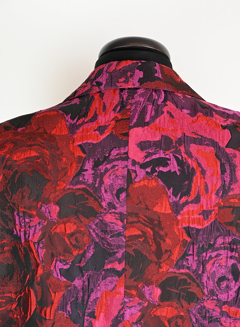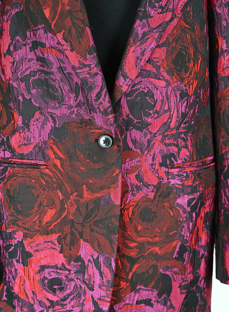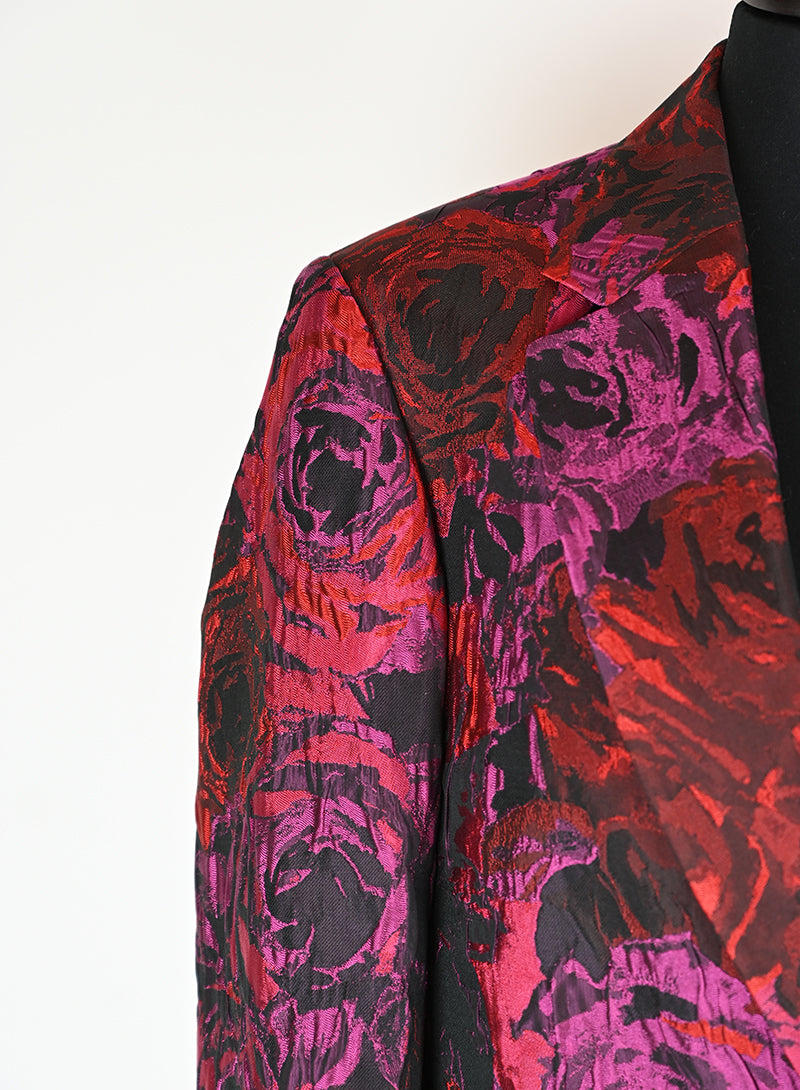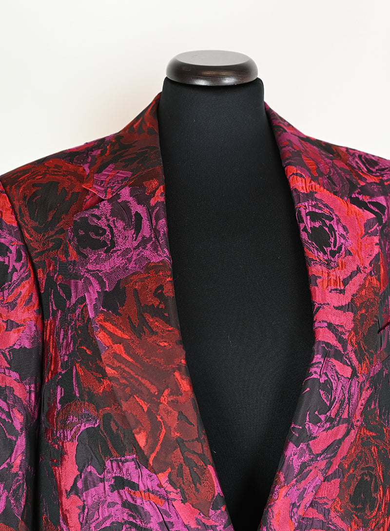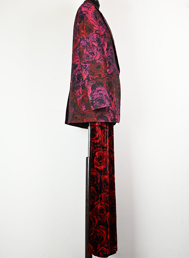 Questo completo Dries Van Noten è un capo elegante e lussuoso, perfetto per chi ama distinguersi con stile. Il tailleur presenta un pantalone in velluto rosso con stampa di rose nere, mentre la giacca è adornata da una fantasia rosso e ciclamino sul fondo nero. Il dettaglio raffinato del petto e del bottone aggiunge un tocco di classe. Disponibile in taglia 40.