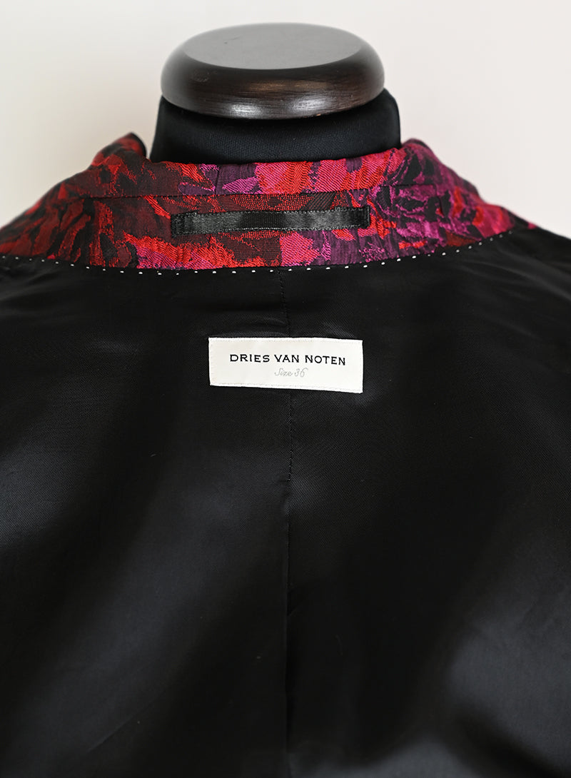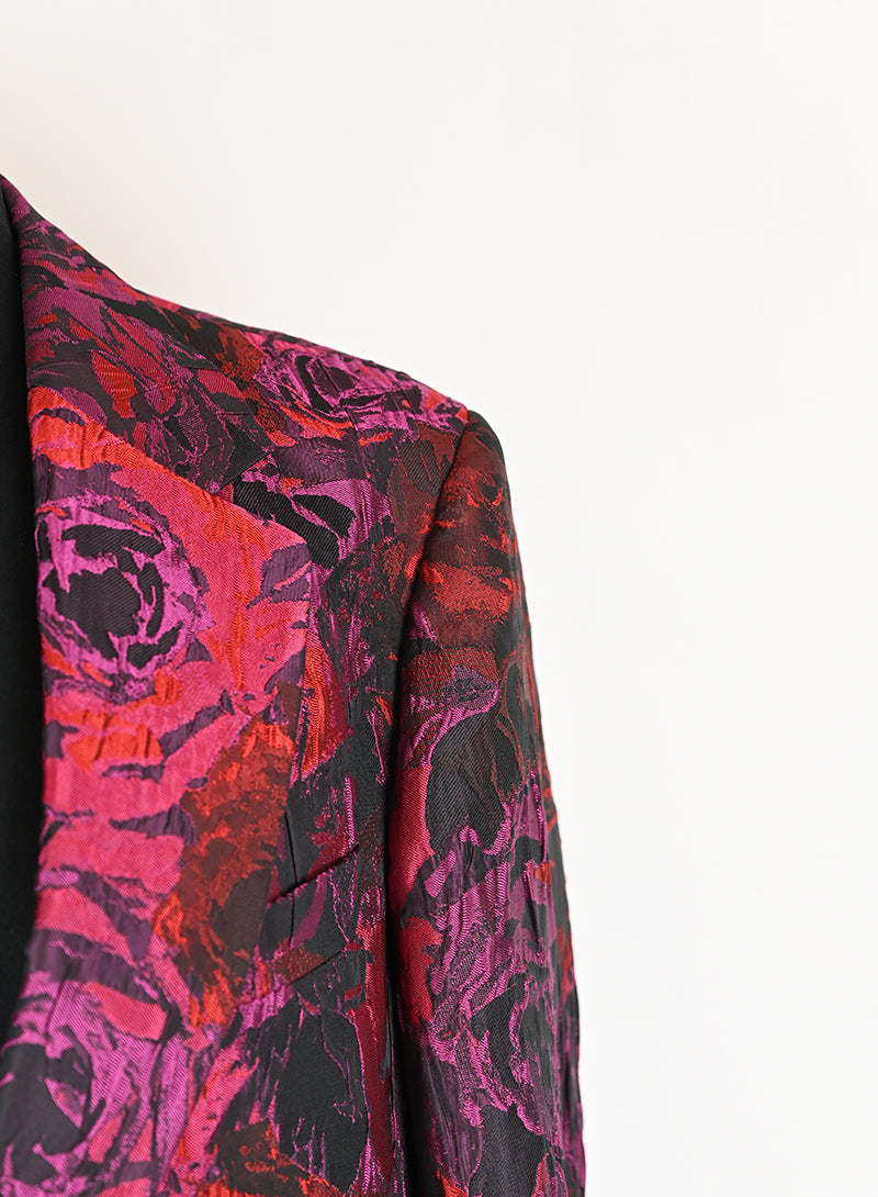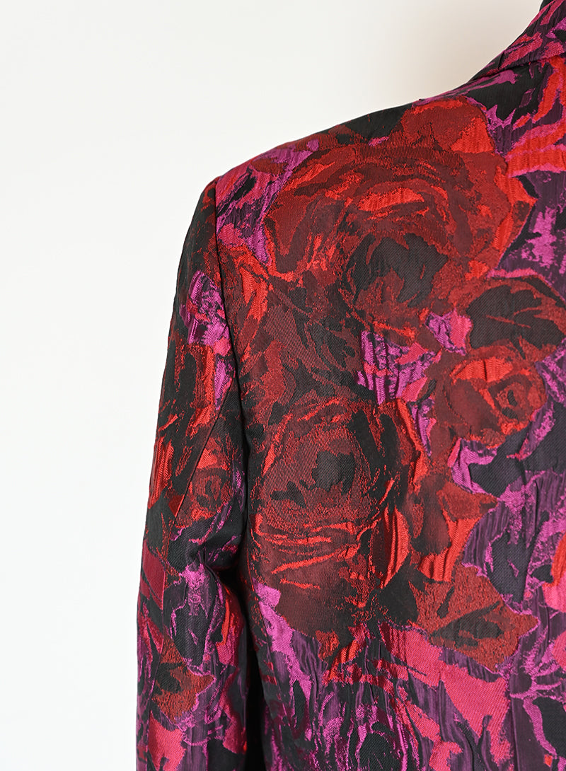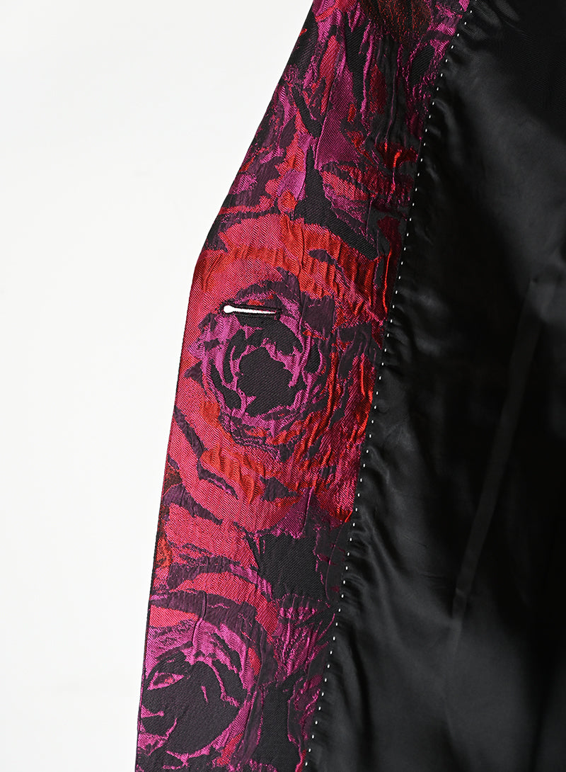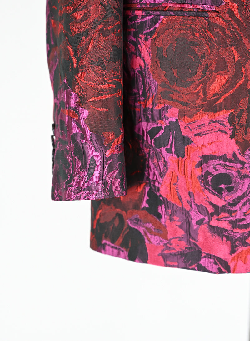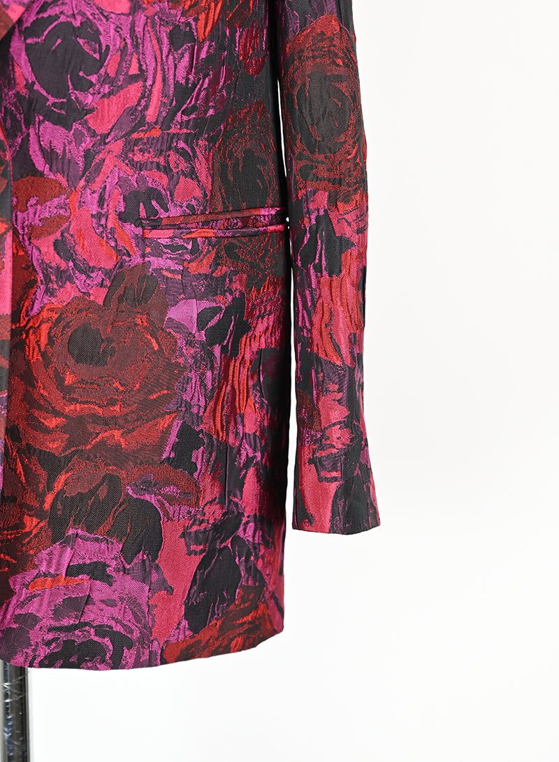Questo completo Dries Van Noten è un capo elegante e lussuoso, perfetto per chi ama distinguersi con stile. Il tailleur presenta un pantalone in velluto rosso con stampa di rose nere, mentre la giacca è adornata da una fantasia rosso e ciclamino sul fondo nero. Il dettaglio raffinato del petto e del bottone aggiunge un tocco di classe. Disponibile in taglia 40.