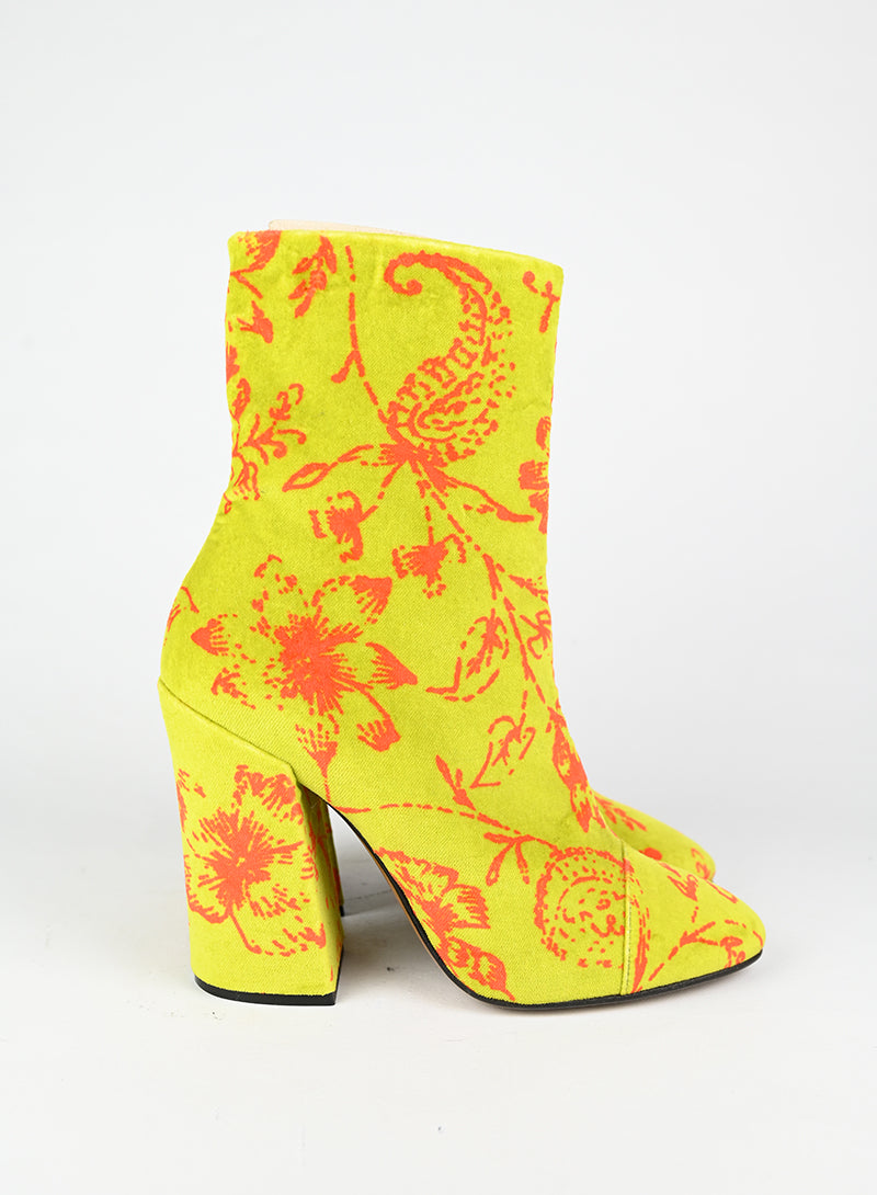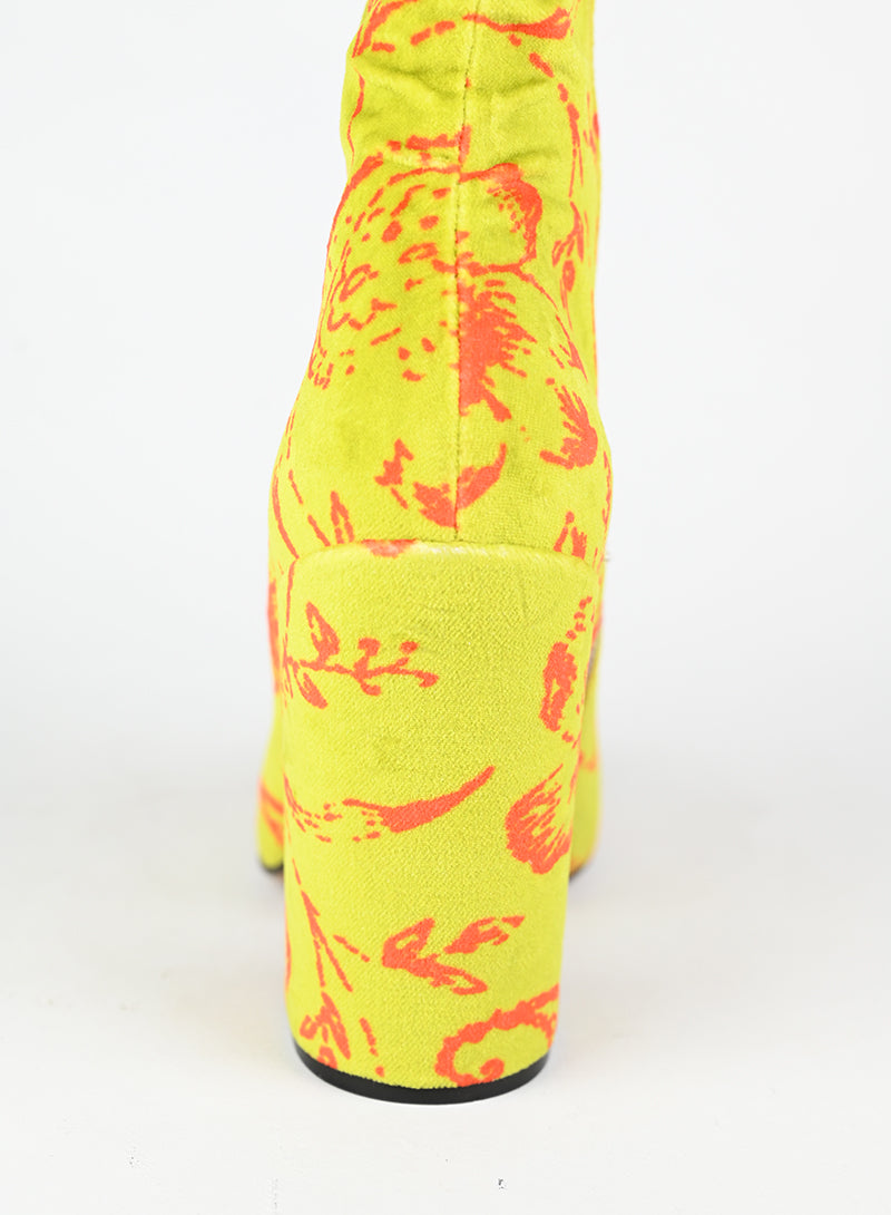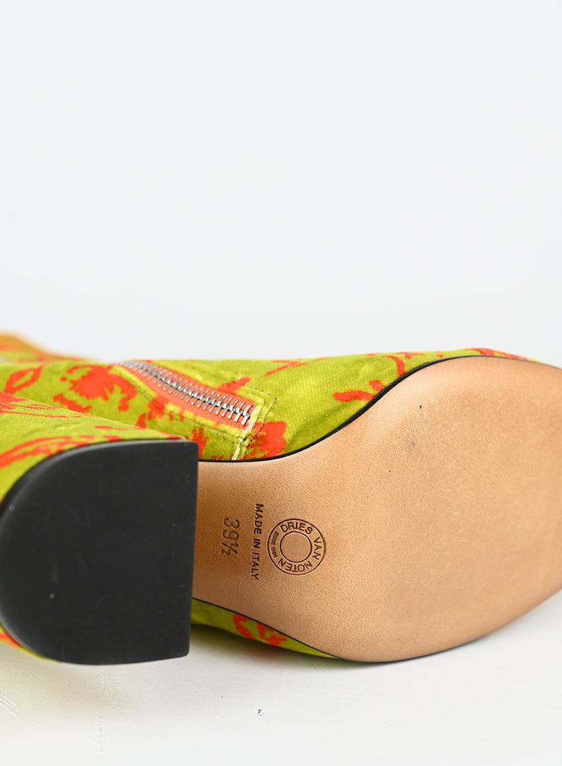 Stivaletti in velluto verde acido firmati Dries Van Noten, impreziositi da una raffinata fantasia floreale con fiori stilizzati in arancio. La texture vellutata conferisce un'eleganza tattile, mentre il dettaglio decorativo aggiunge un tocco di carattere e originalità. Chiusura pratica con zip laterale. Un pezzo versatile che unisce comfort e sofisticazione, perfetto per chi ricerca dettagli curati e design consapevole nel proprio guardaroba.
