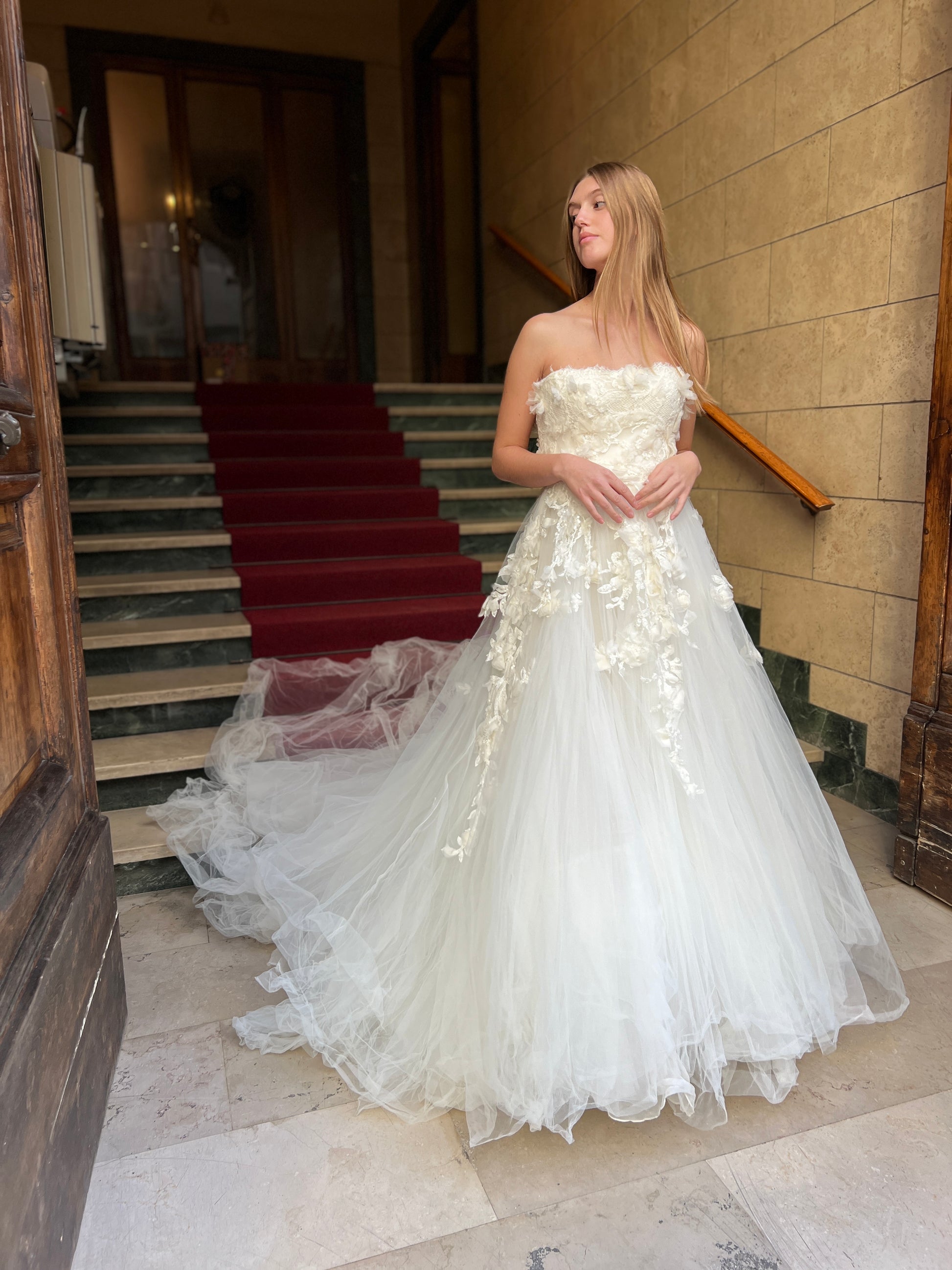 Elie Saab abito da sera senza spalline con tulle e corpetto ricamato fiori a sfumare. Tg.40