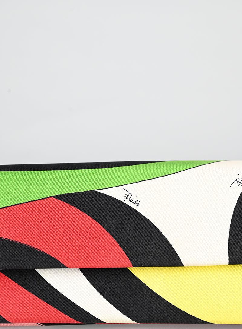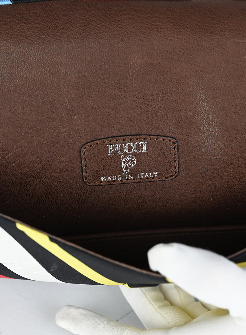 Questa pochette Emilio Pucci in tessuto fantasia multicolor unisce eleganza e stile con tonalità di rosso, nero, bianco, giallo e verde. Dotata di patta frontale e un interno con un unico scomparto foderato in marrone, offre una combinazione perfetta di raffinatezza e funzionalità. Un accessorio sofisticato ideale per aggiungere un tocco di colore distintivo ai tuoi outfit.